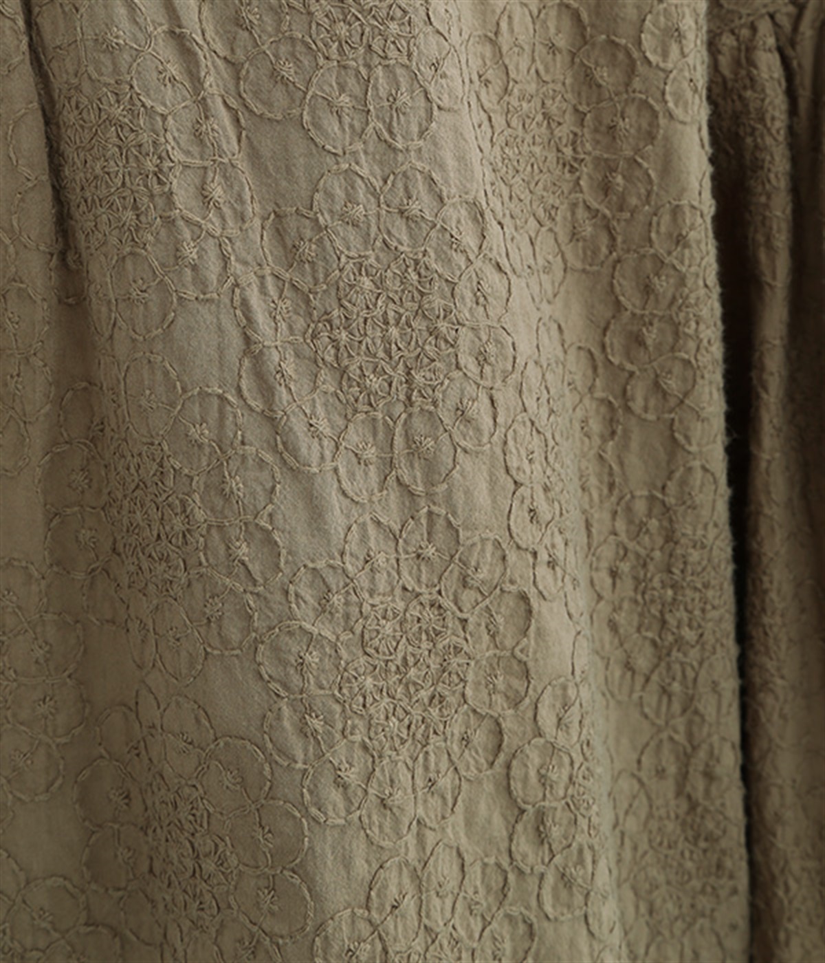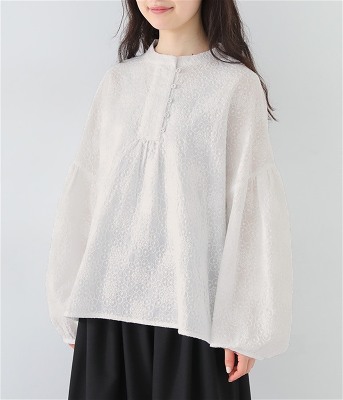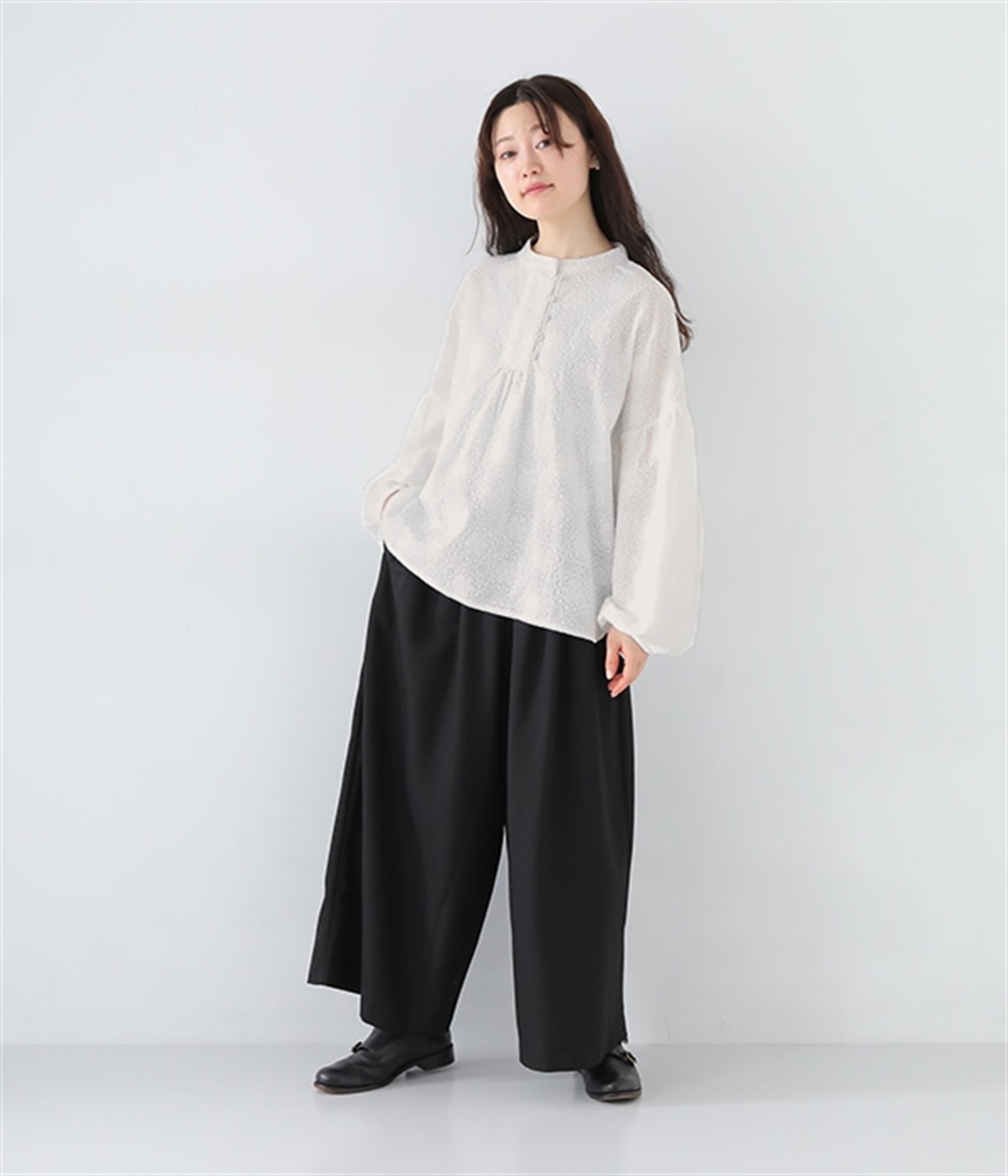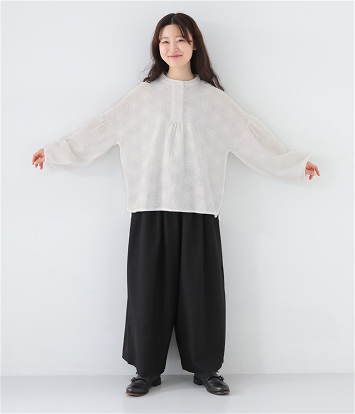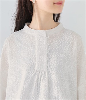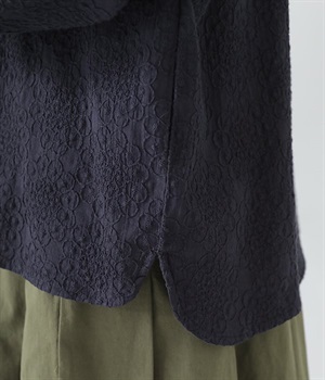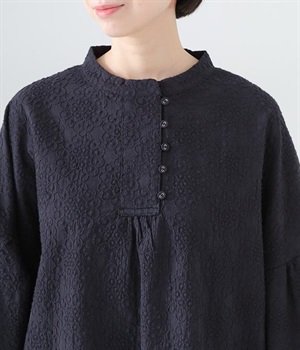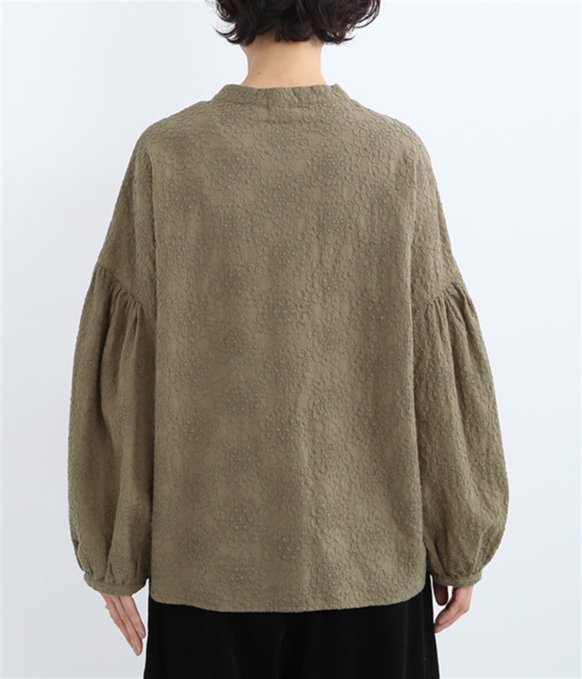 身生地と同じ色を使い、花モチーフ刺しゅうを前面にちりばめた大人かわいいプルオーバー。ぐっと肩落ちしたラインから、空気を含んだようなふんわり袖をつけて装いにやさしく華やかなニュアンスを加えました。フロントにはやや横位置にレイアウトしたループボタンを添えて、首まわりにポイントを。立体的な刺しゅうにより質感がさらっとしているため、肌へのはりつきがおさえられています。