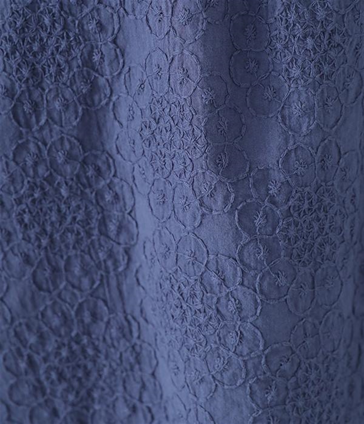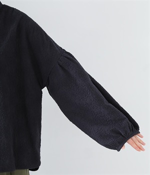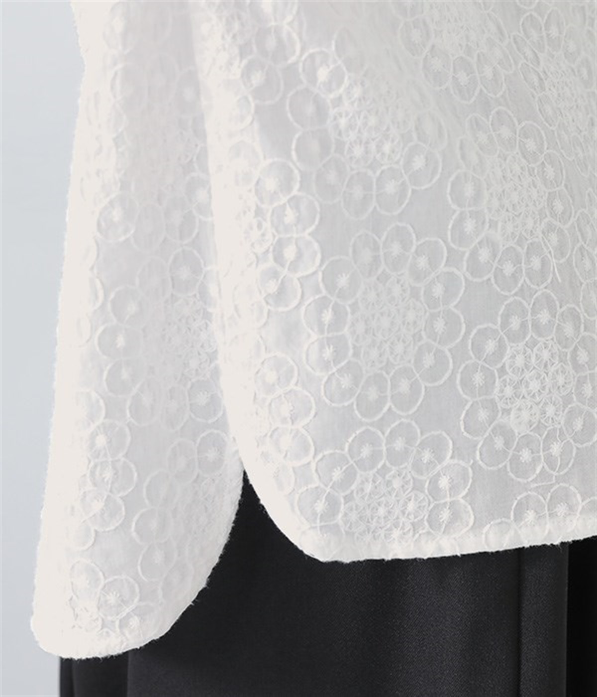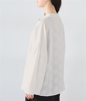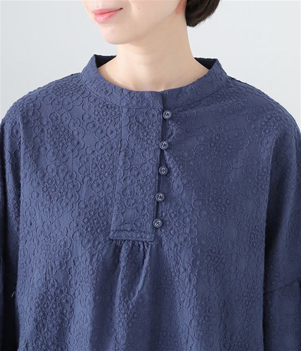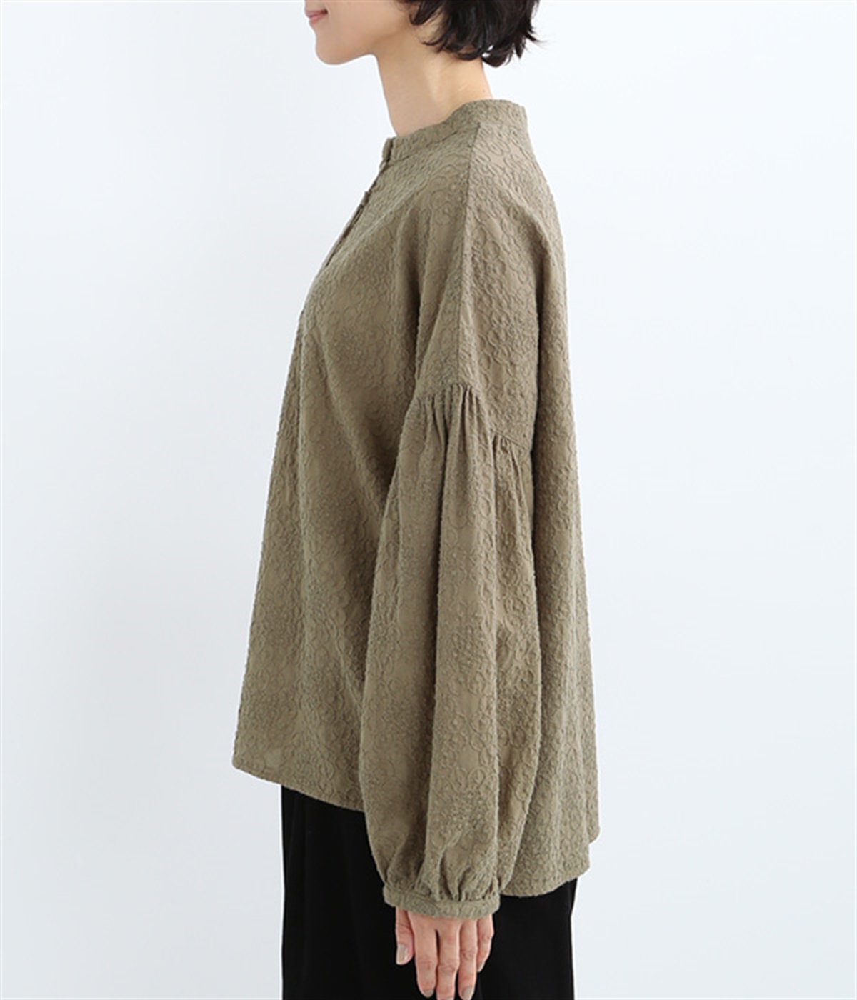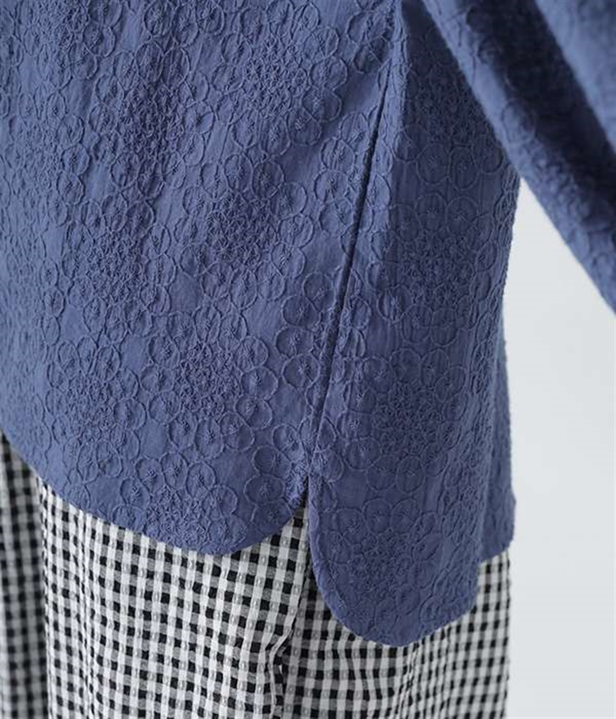 身生地と同じ色を使い、花モチーフ刺しゅうを前面にちりばめた大人かわいいプルオーバー。ぐっと肩落ちしたラインから、空気を含んだようなふんわり袖をつけて装いにやさしく華やかなニュアンスを加えました。フロントにはやや横位置にレイアウトしたループボタンを添えて、首まわりにポイントを。立体的な刺しゅうにより質感がさらっとしているため、肌へのはりつきがおさえられています。