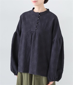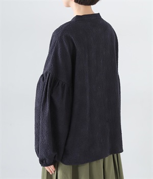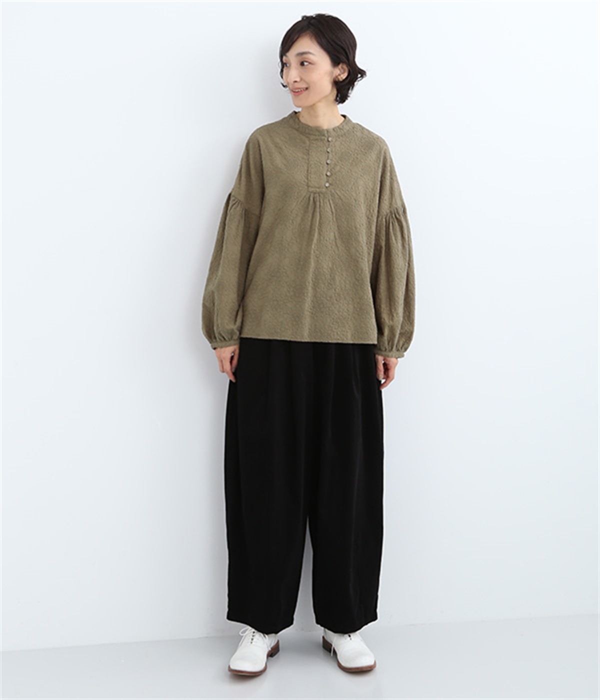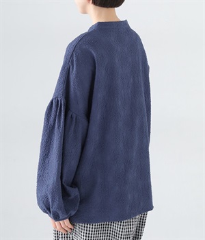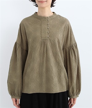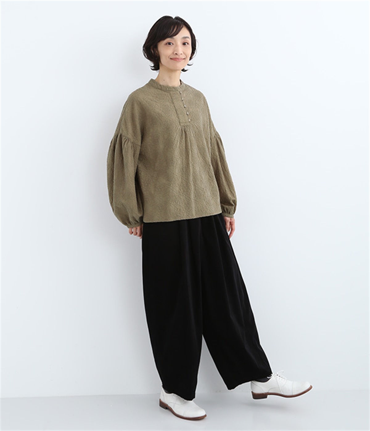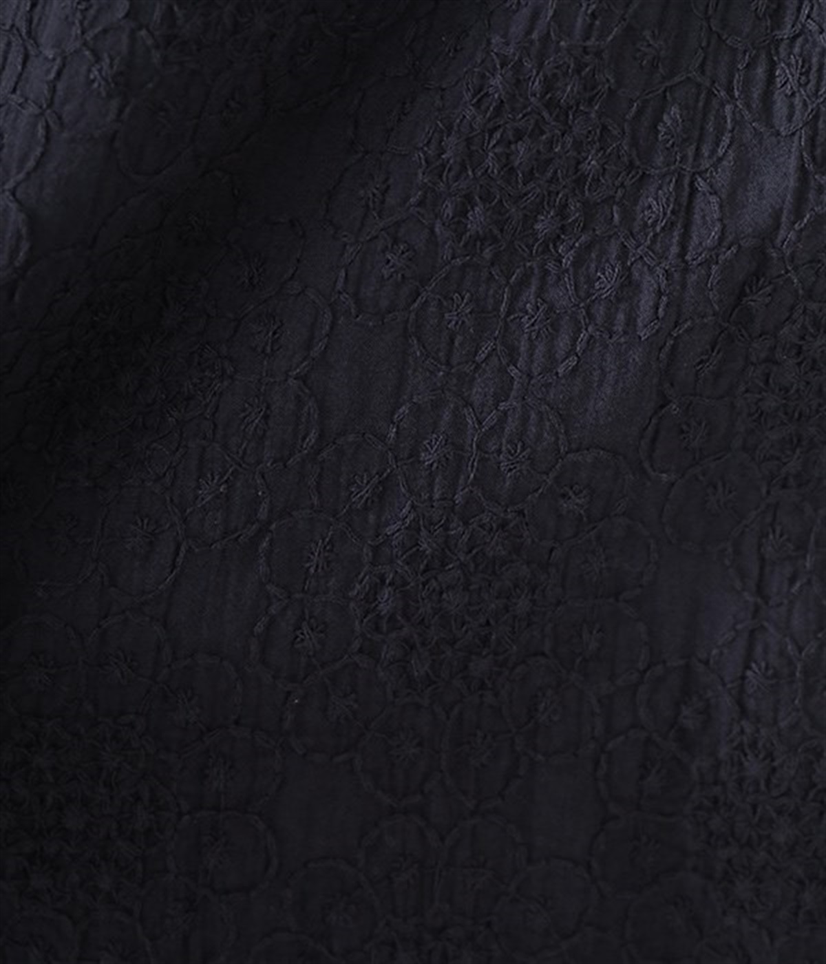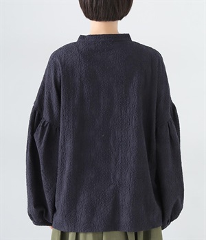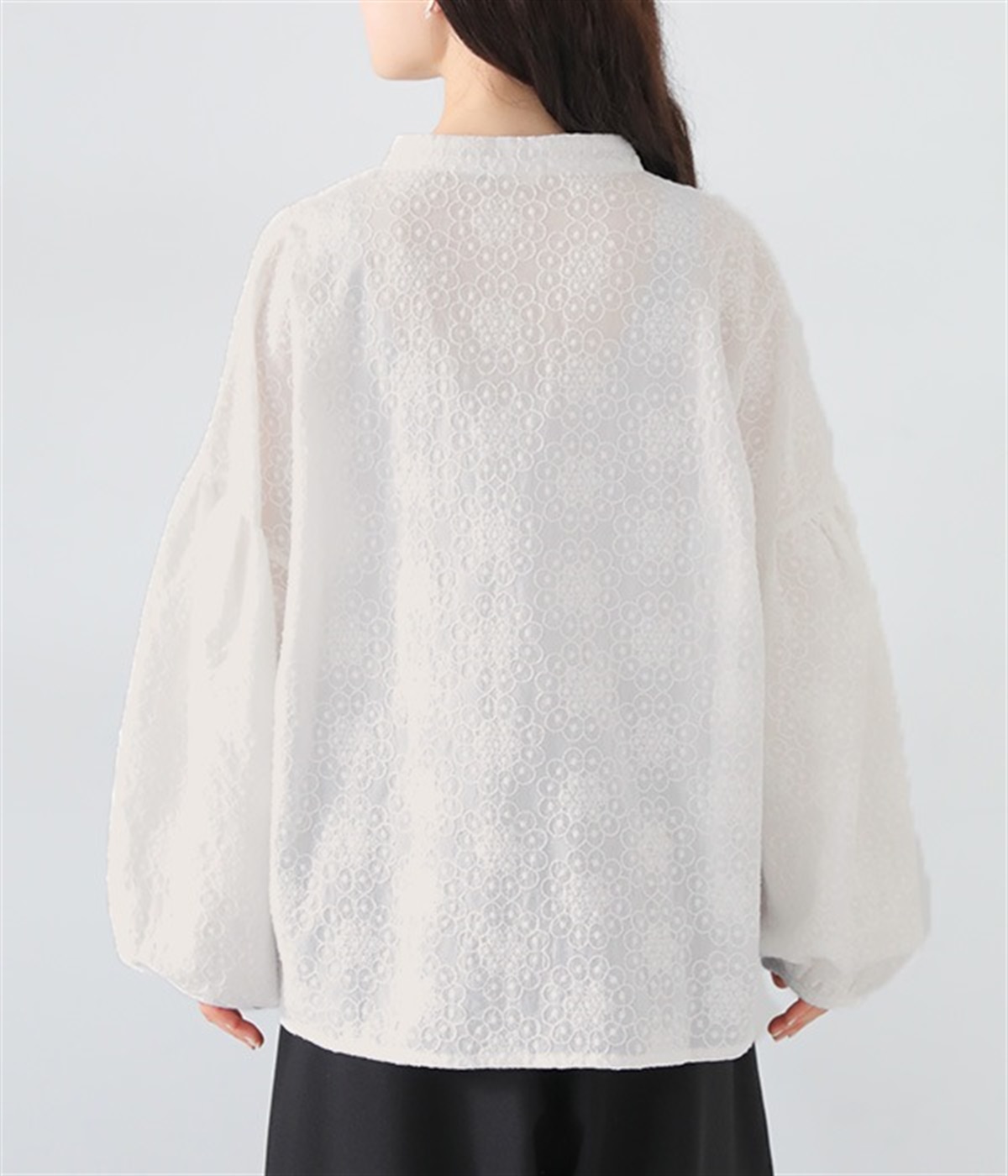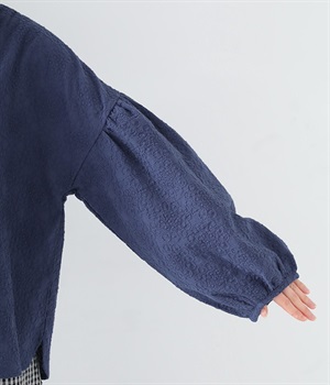 身生地と同じ色を使い、花モチーフ刺しゅうを前面にちりばめた大人かわいいプルオーバー。ぐっと肩落ちしたラインから、空気を含んだようなふんわり袖をつけて装いにやさしく華やかなニュアンスを加えました。フロントにはやや横位置にレイアウトしたループボタンを添えて、首まわりにポイントを。立体的な刺しゅうにより質感がさらっとしているため、肌へのはりつきがおさえられています。