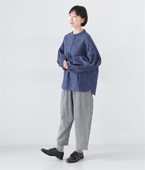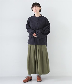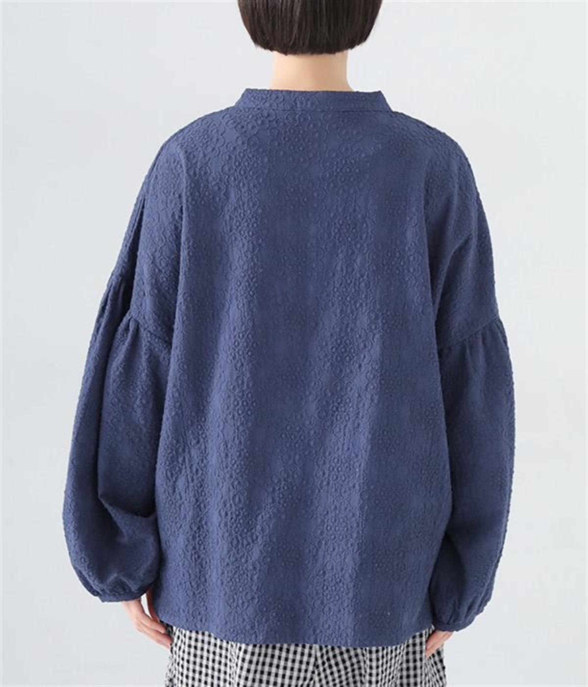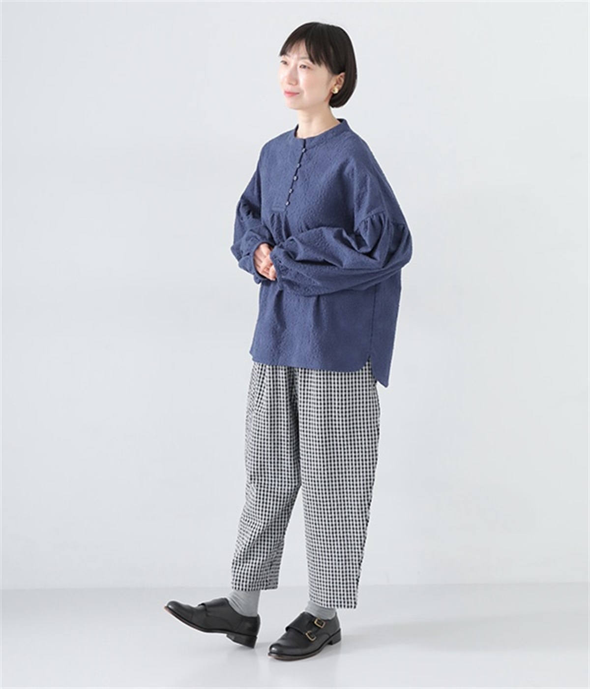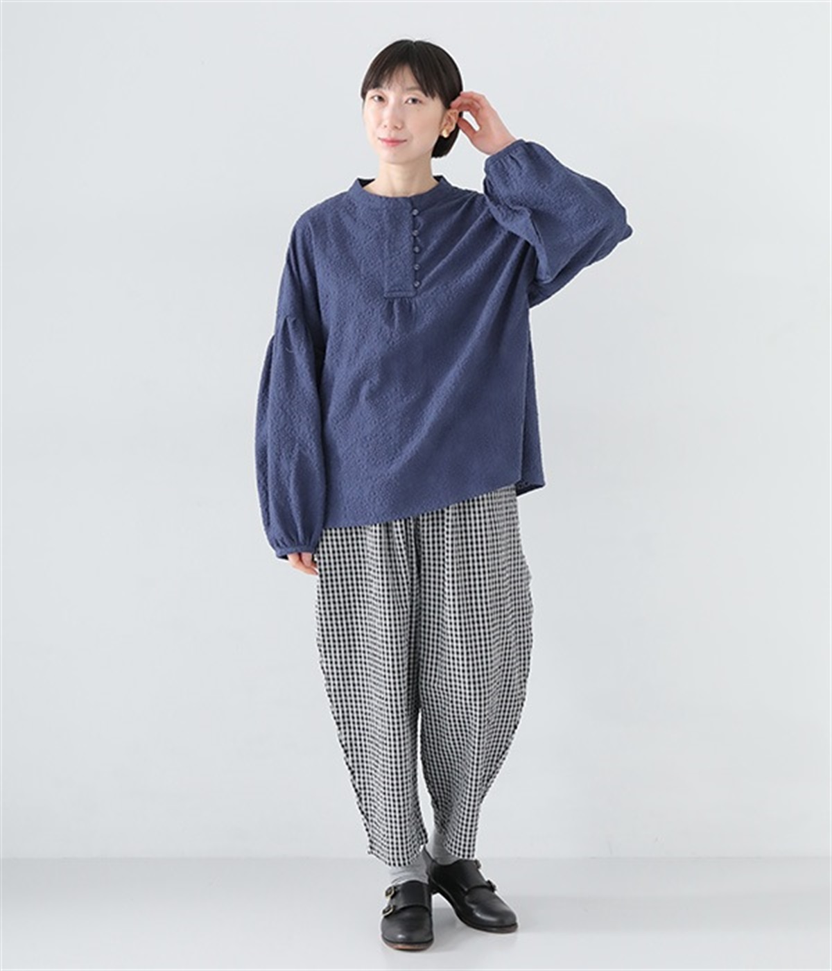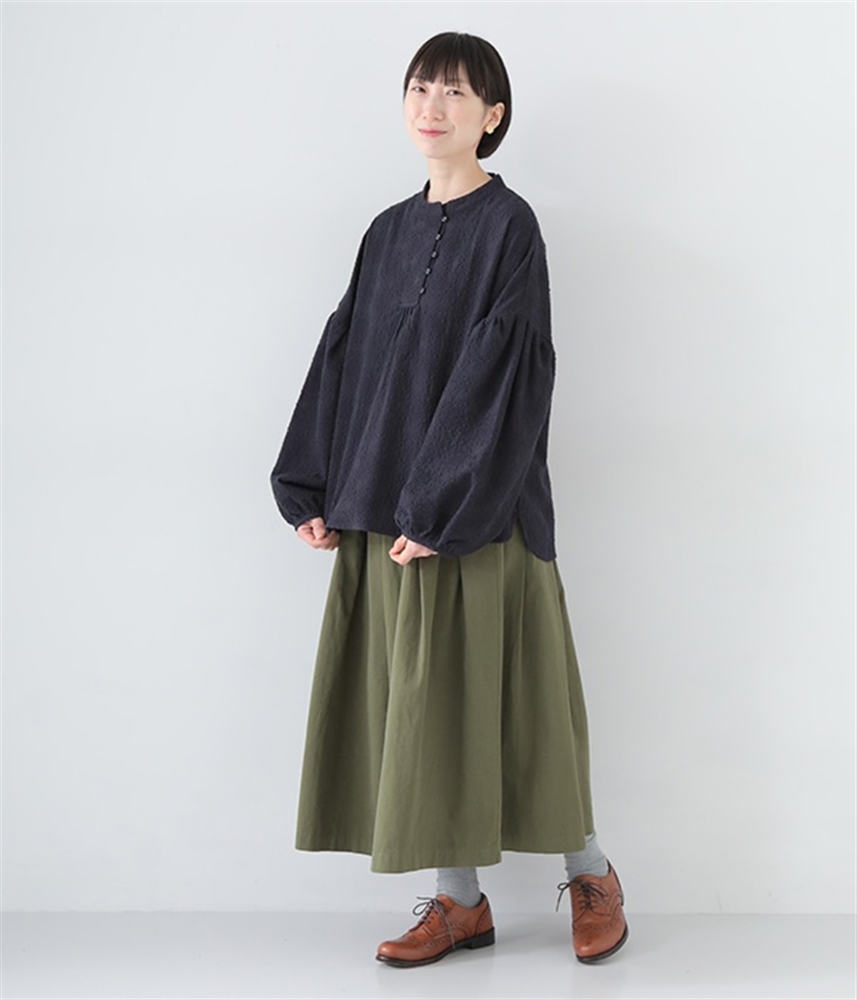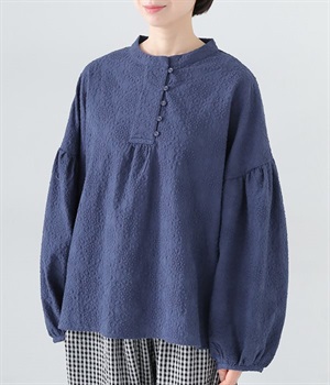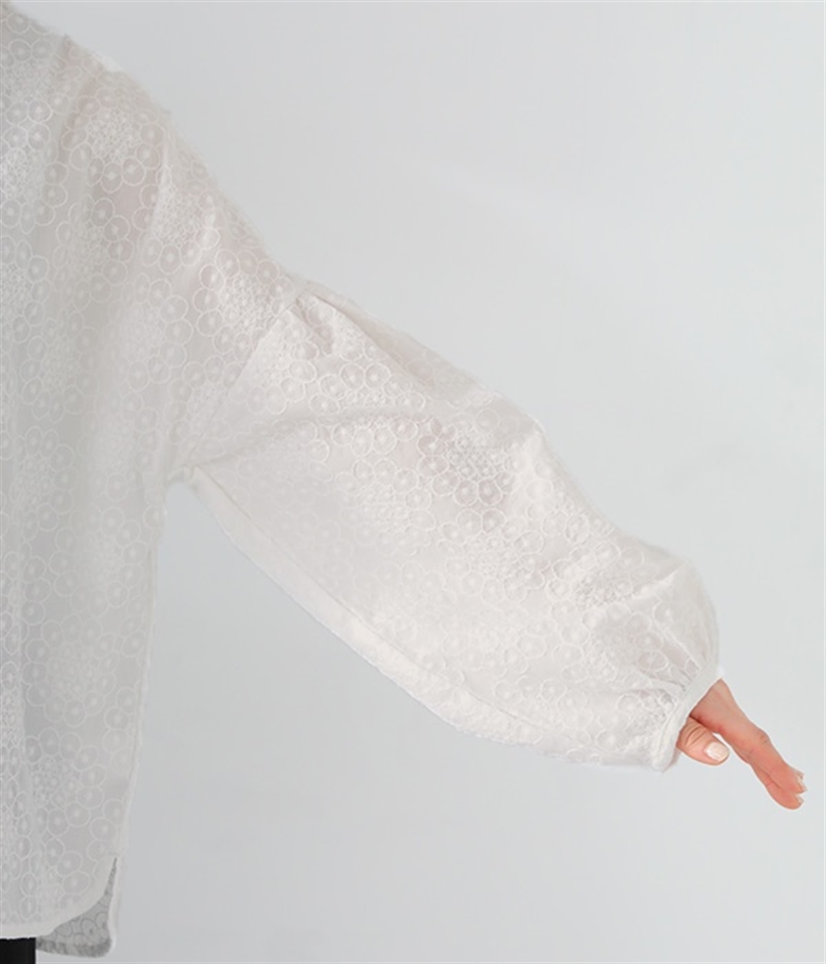 身生地と同じ色を使い、花モチーフ刺しゅうを前面にちりばめた大人かわいいプルオーバー。ぐっと肩落ちしたラインから、空気を含んだようなふんわり袖をつけて装いにやさしく華やかなニュアンスを加えました。フロントにはやや横位置にレイアウトしたループボタンを添えて、首まわりにポイントを。立体的な刺しゅうにより質感がさらっとしているため、肌へのはりつきがおさえられています。