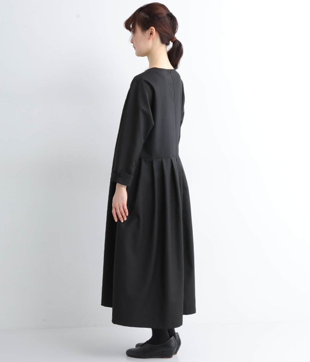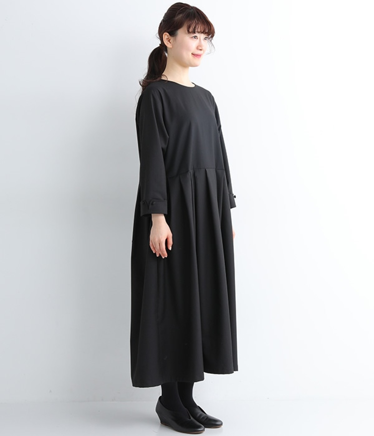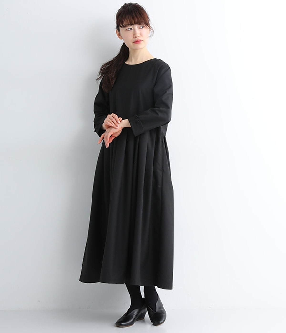 程よい光沢のあるなめらかな素材で仕立てたワンピースです。フォーマルシーンに使えるきちんとした印象ですが、身幅が広めなので堅苦しさを感じにくい着心地。バックスタイルはコンシールファスナーで目立たない仕様です。袖口のくるみボタンがさりげないアクセントに。スカート部分のタックがやさしいシルエットを作り、かしこまった場でも自然体な着こなしが叶うワンピースです。