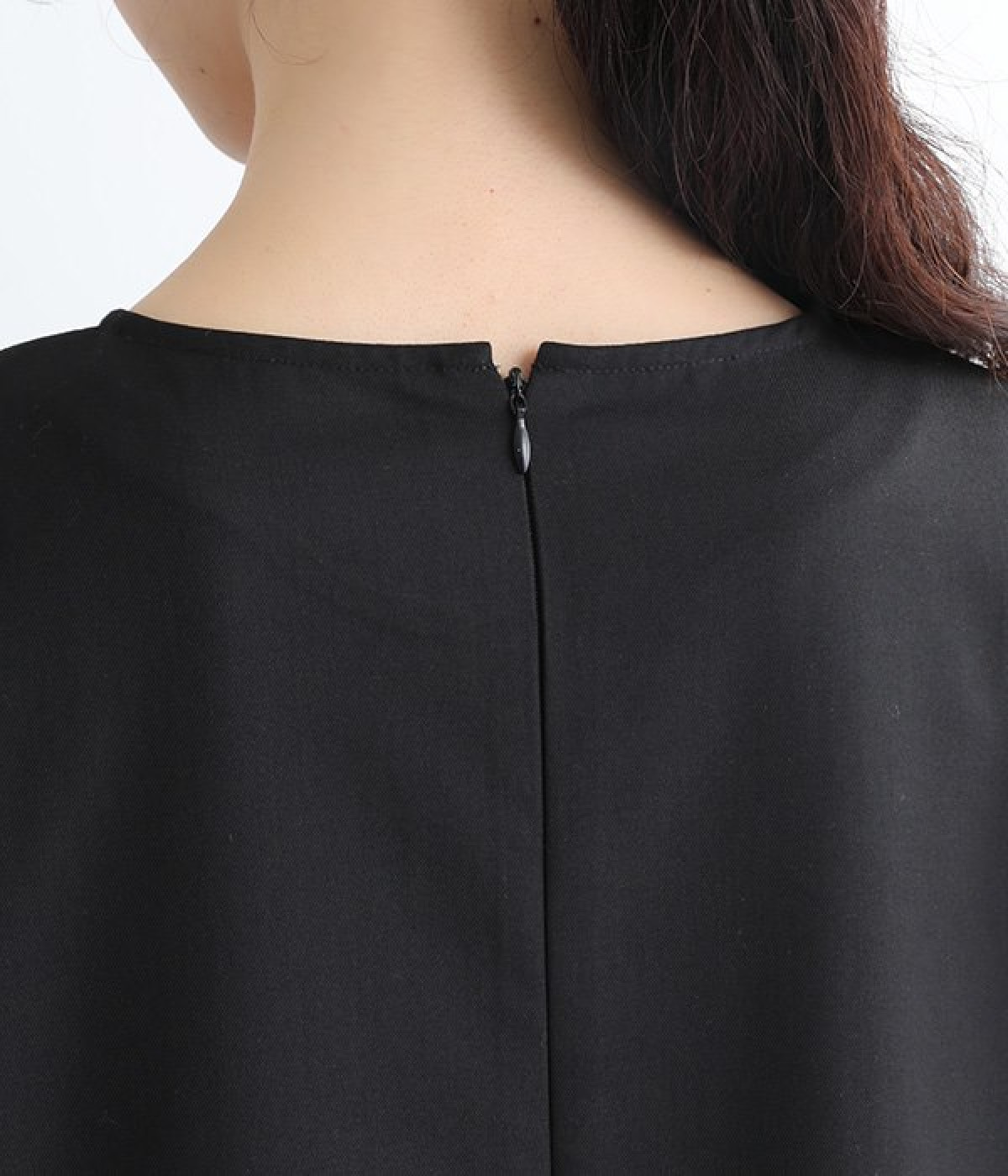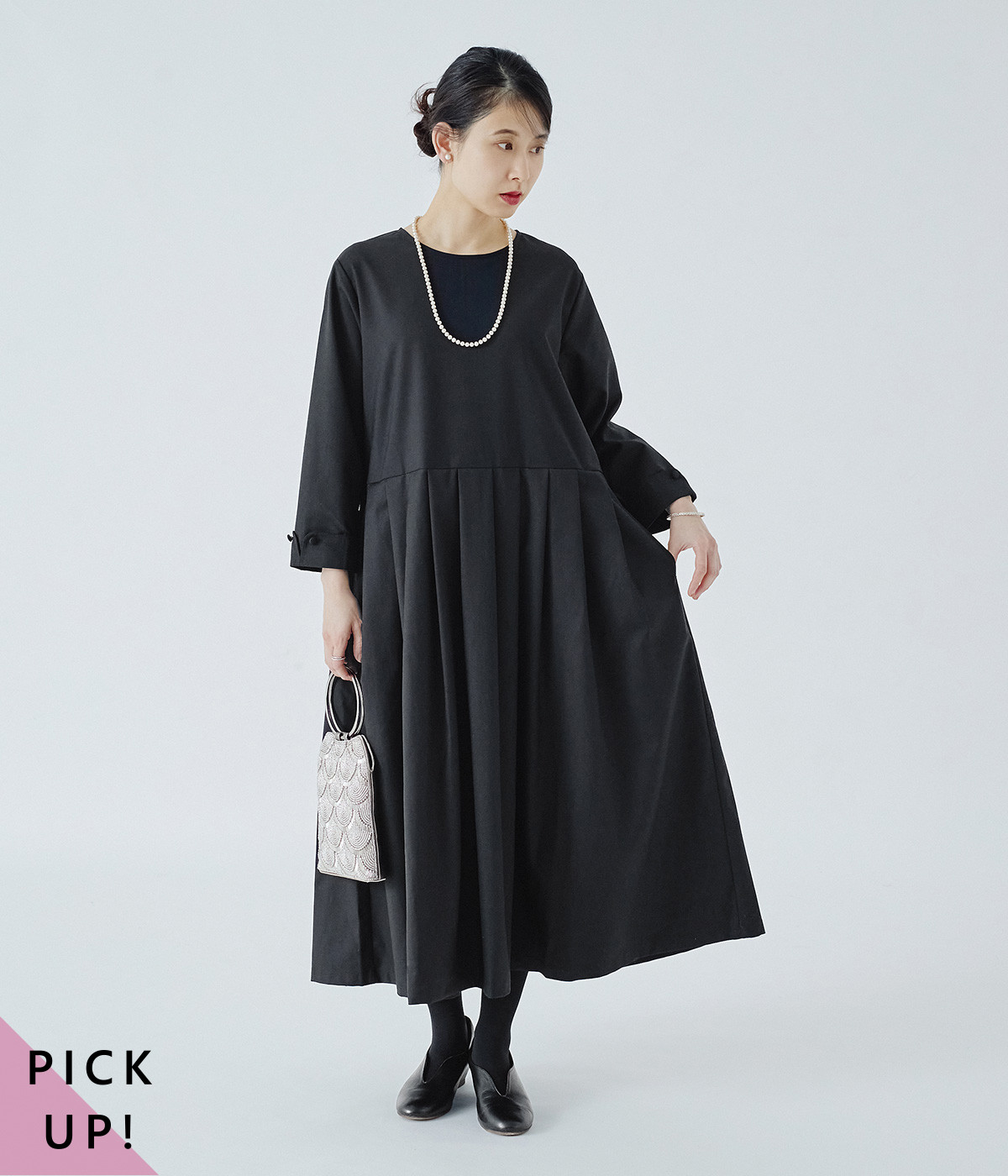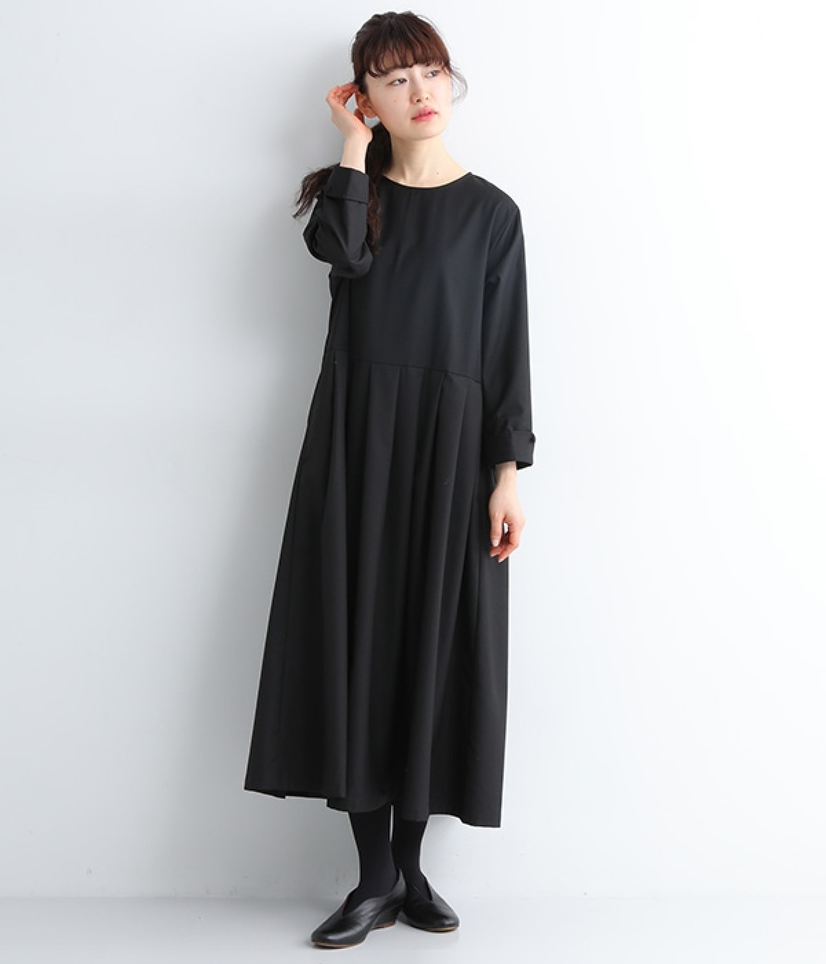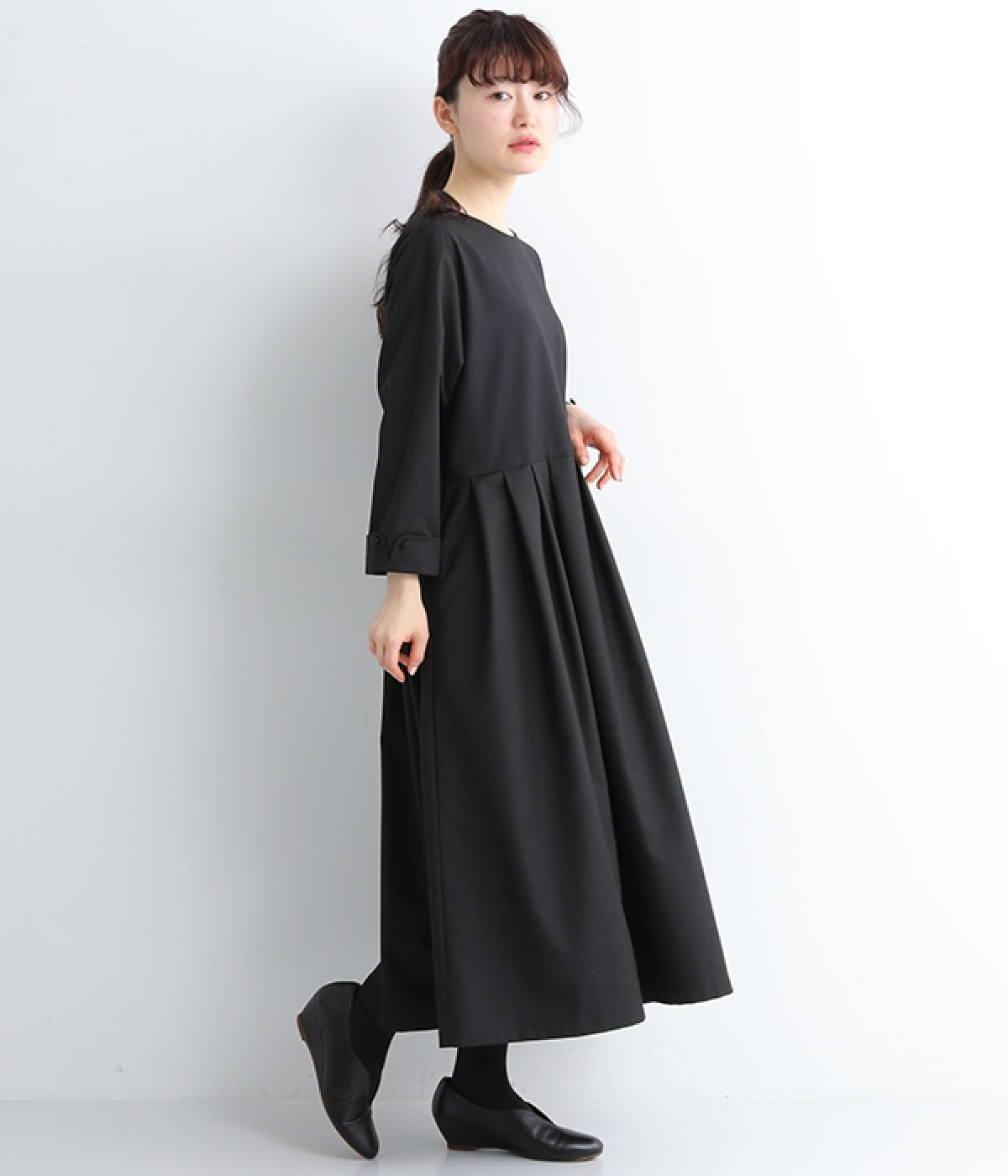 程よい光沢のあるなめらかな素材で仕立てたワンピースです。フォーマルシーンに使えるきちんとした印象ですが、身幅が広めなので堅苦しさを感じにくい着心地。バックスタイルはコンシールファスナーで目立たない仕様です。袖口のくるみボタンがさりげないアクセントに。スカート部分のタックがやさしいシルエットを作り、かしこまった場でも自然体な着こなしが叶うワンピースです。
