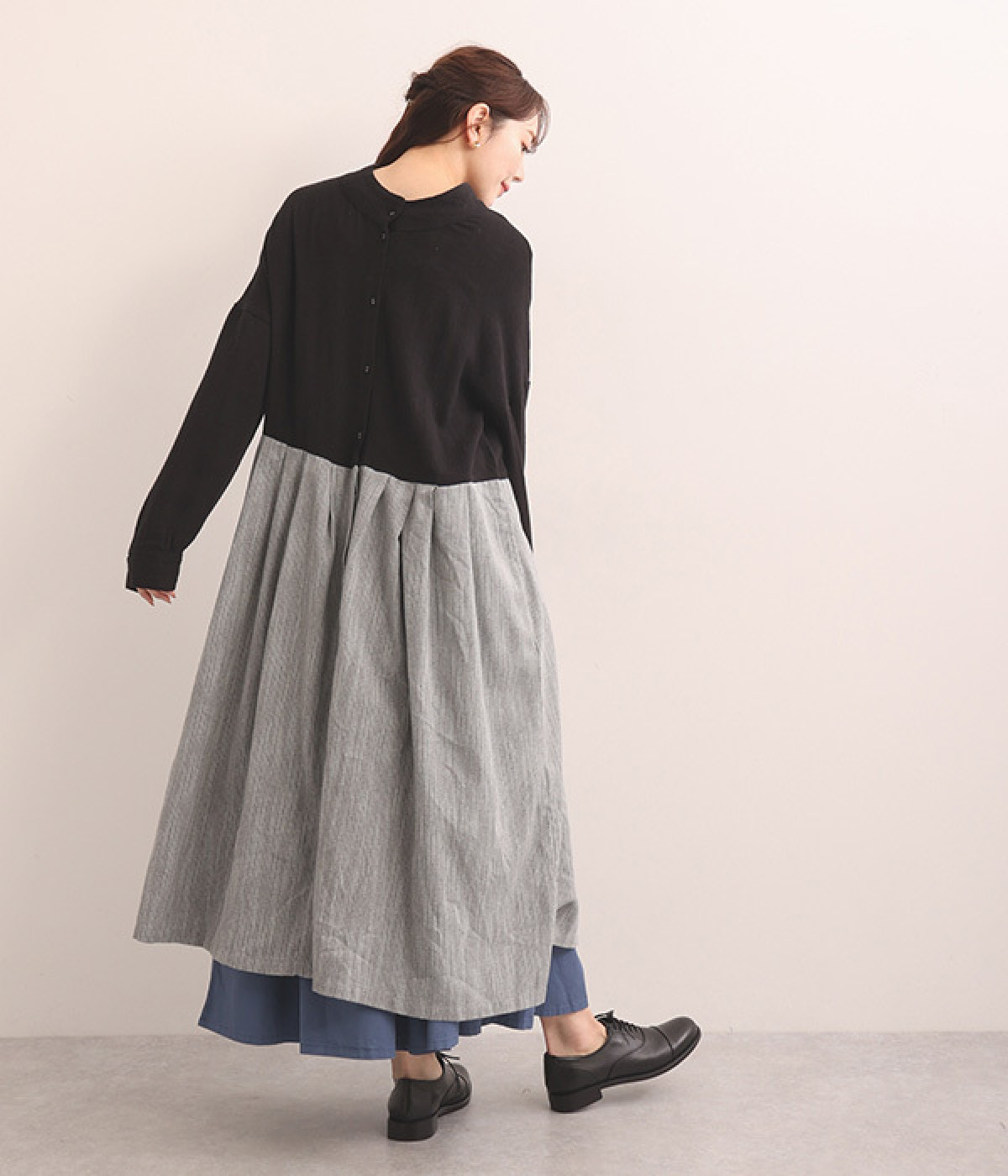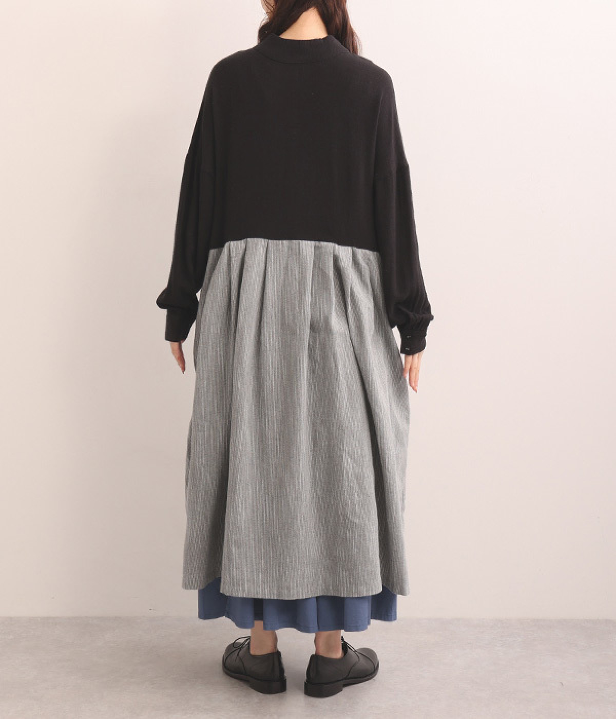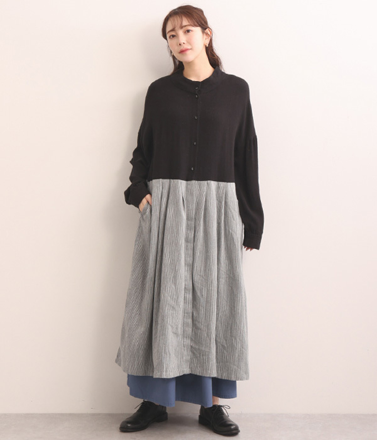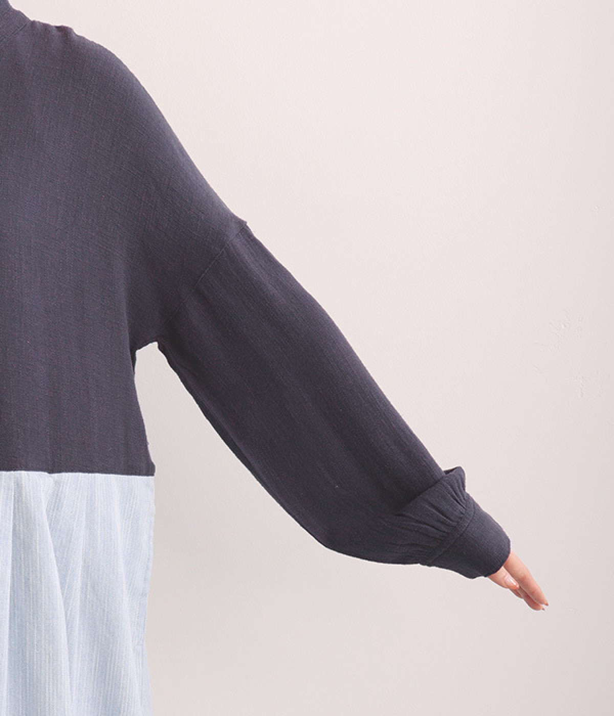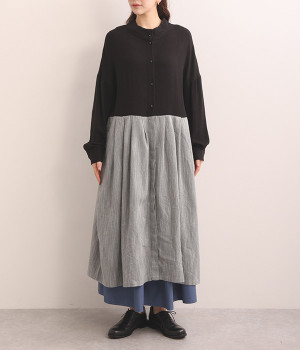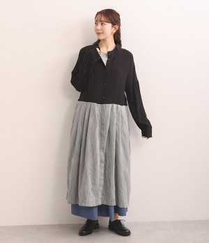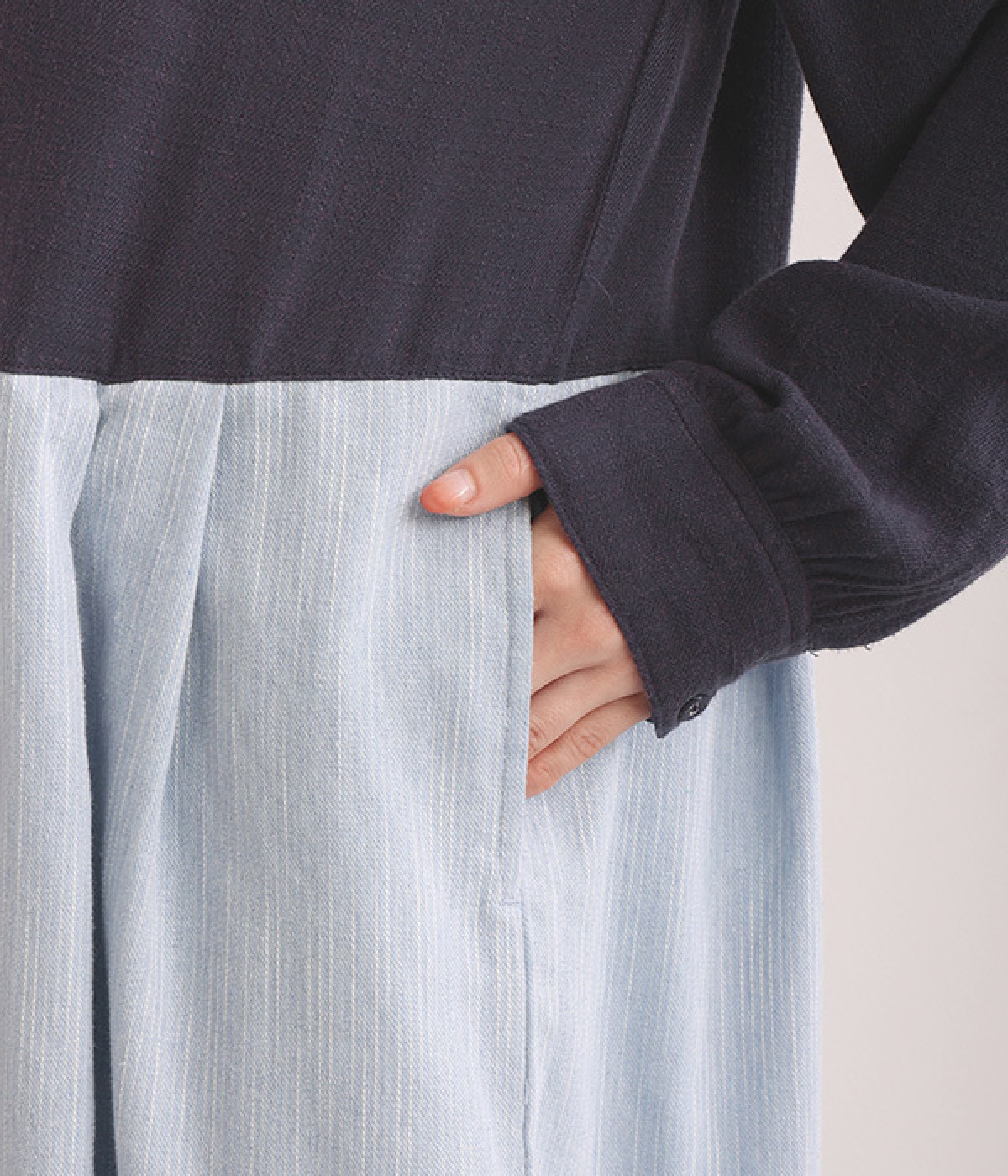 リネンの自然な手触りとレーヨンのやさしい肌あたりを掛け合わせたワンピースです。スカート部分には異なる糸の太さでストライプを表現し、まるでトップスとボトムをスタイリングしているようなデザイン。ハイネック面とボタン開き面はそれぞれがフロントで着られる2WAYタイプ。ボタンを全開にすれば羽織りアウターとしても使え、着まわしのアレンジも多彩です。両サイドにはちょっとした手まわり品のしまいどころに困らないポケットつき。