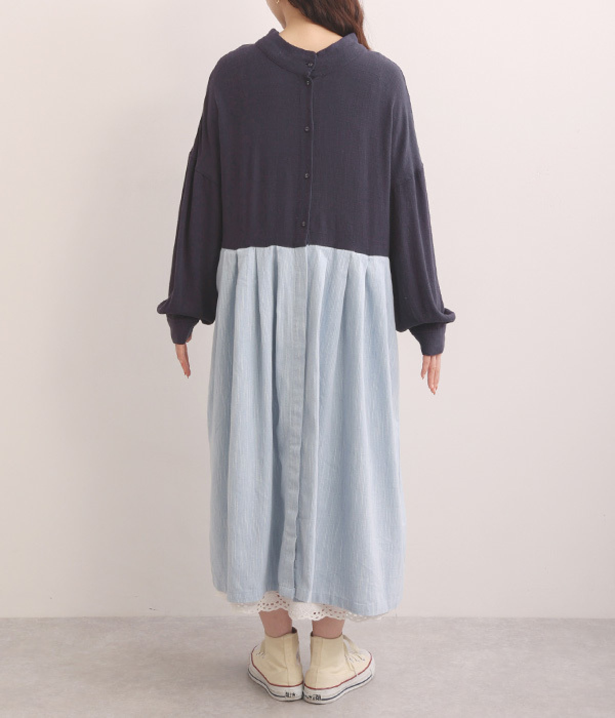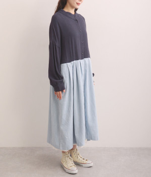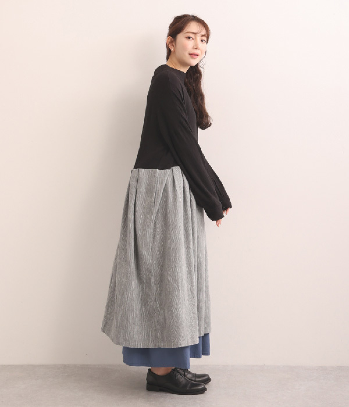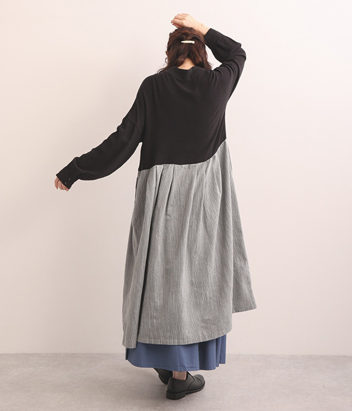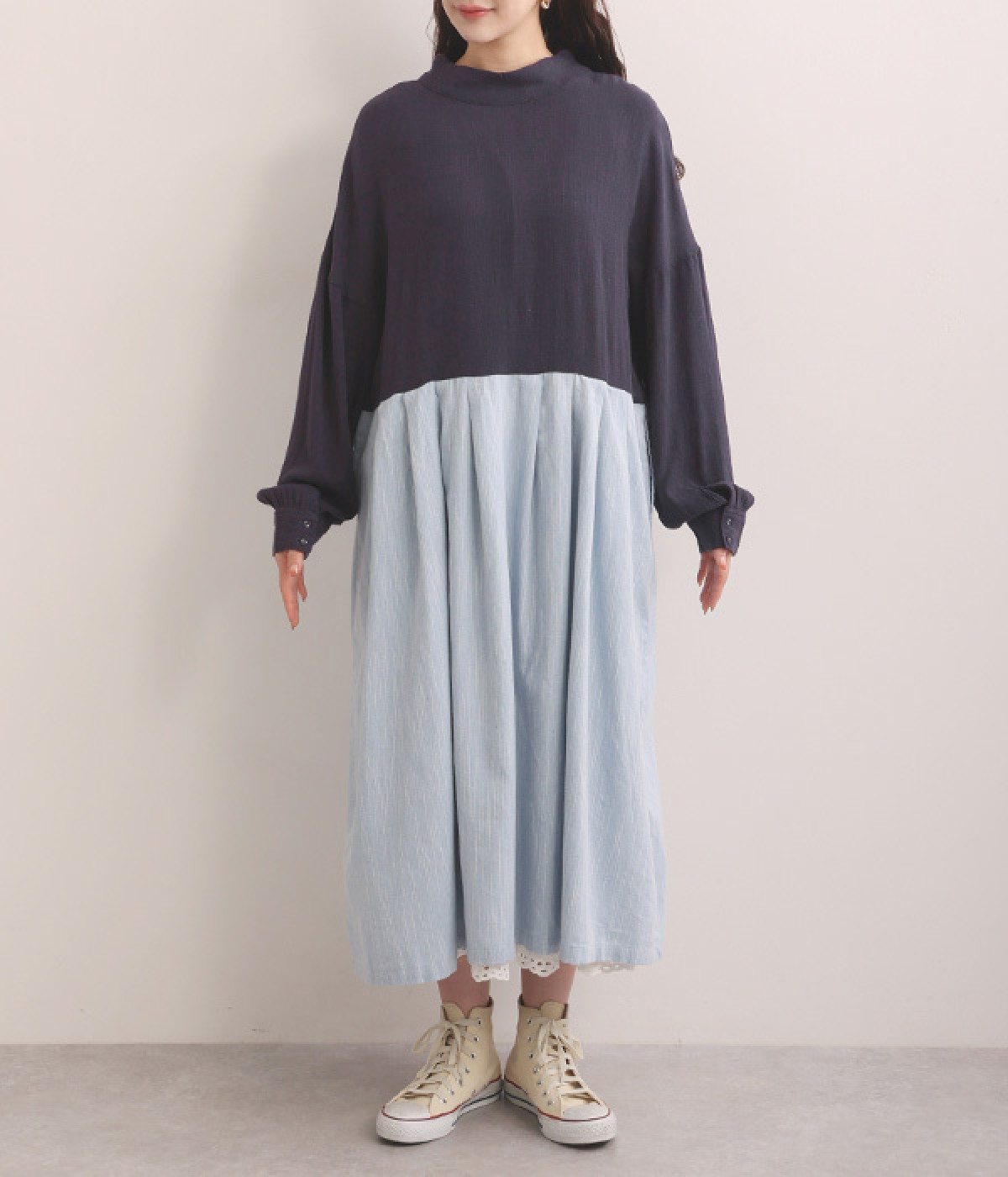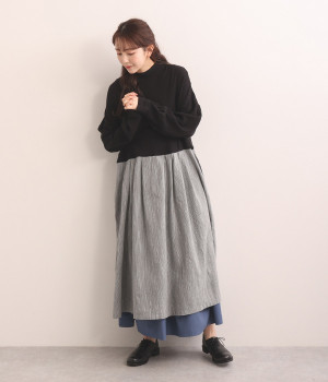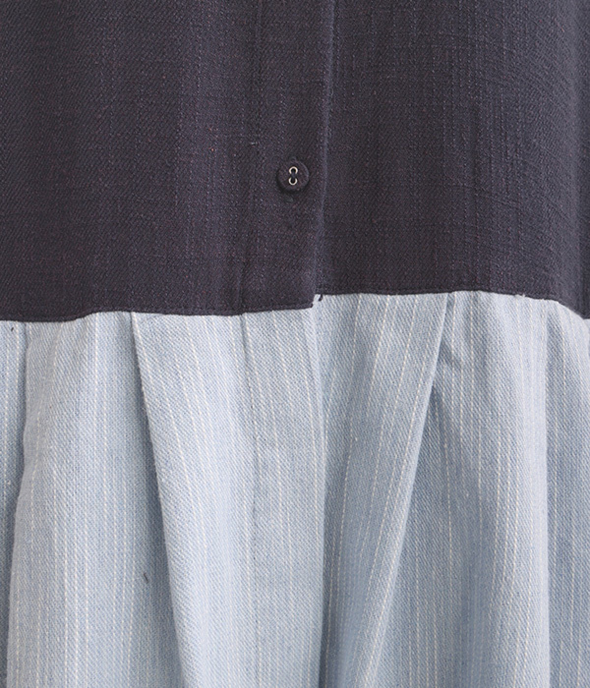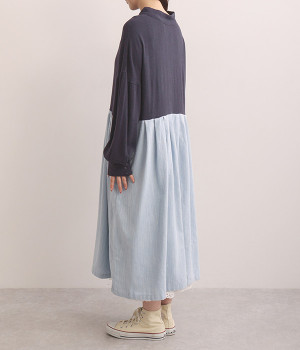 リネンの自然な手触りとレーヨンのやさしい肌あたりを掛け合わせたワンピースです。スカート部分には異なる糸の太さでストライプを表現し、まるでトップスとボトムをスタイリングしているようなデザイン。ハイネック面とボタン開き面はそれぞれがフロントで着られる2WAYタイプ。ボタンを全開にすれば羽織りアウターとしても使え、着まわしのアレンジも多彩です。両サイドにはちょっとした手まわり品のしまいどころに困らないポケットつき。