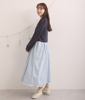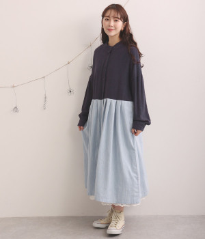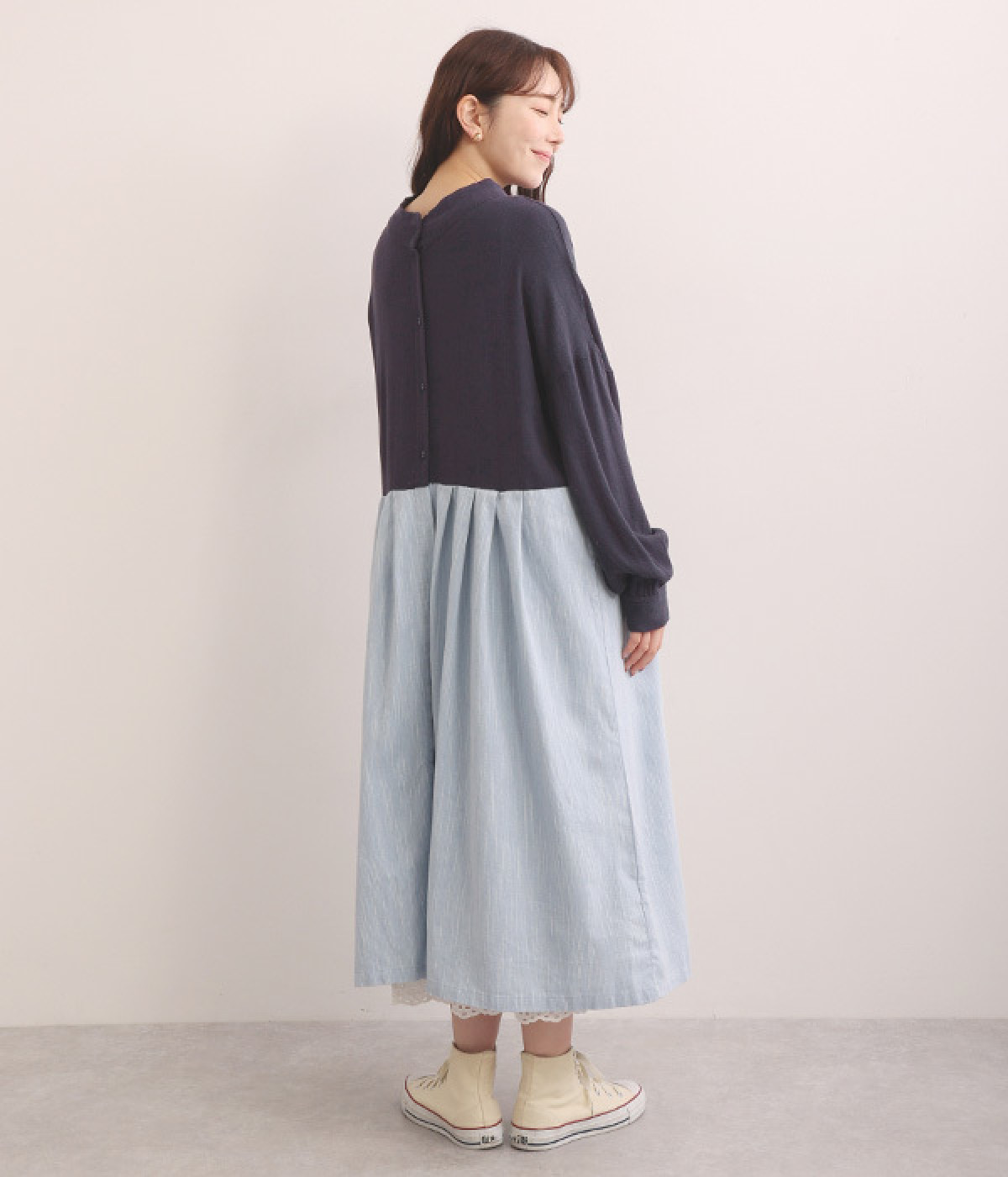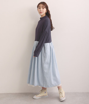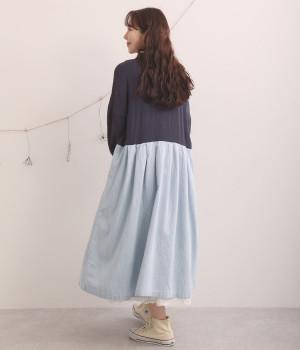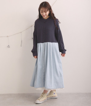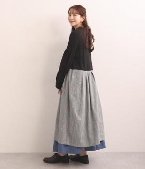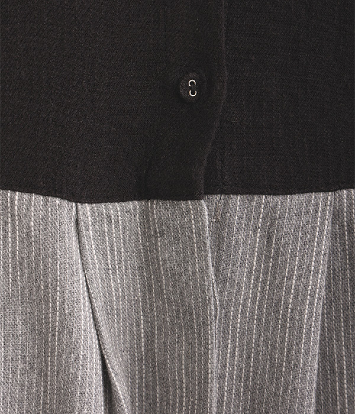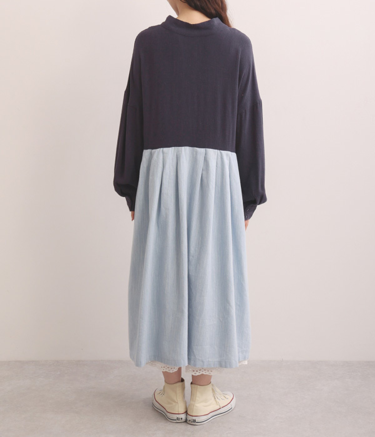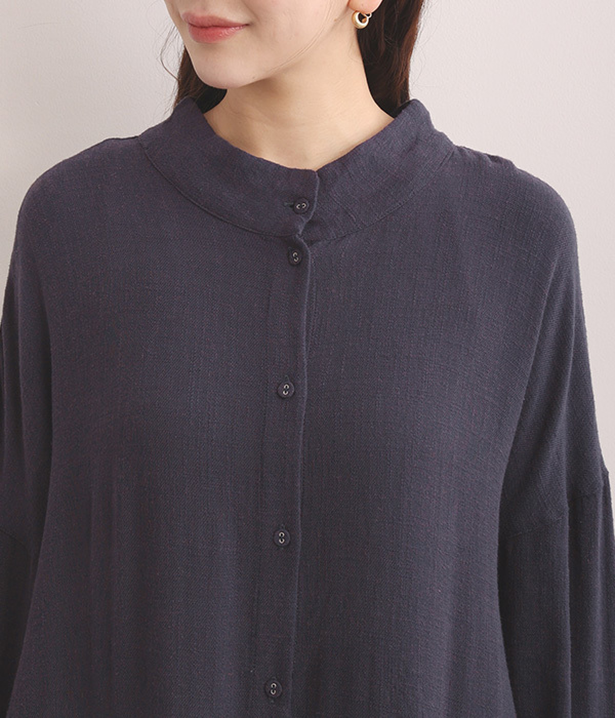 リネンの自然な手触りとレーヨンのやさしい肌あたりを掛け合わせたワンピースです。スカート部分には異なる糸の太さでストライプを表現し、まるでトップスとボトムをスタイリングしているようなデザイン。ハイネック面とボタン開き面はそれぞれがフロントで着られる2WAYタイプ。ボタンを全開にすれば羽織りアウターとしても使え、着まわしのアレンジも多彩です。両サイドにはちょっとした手まわり品のしまいどころに困らないポケットつき。