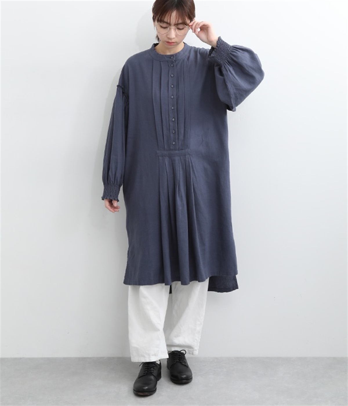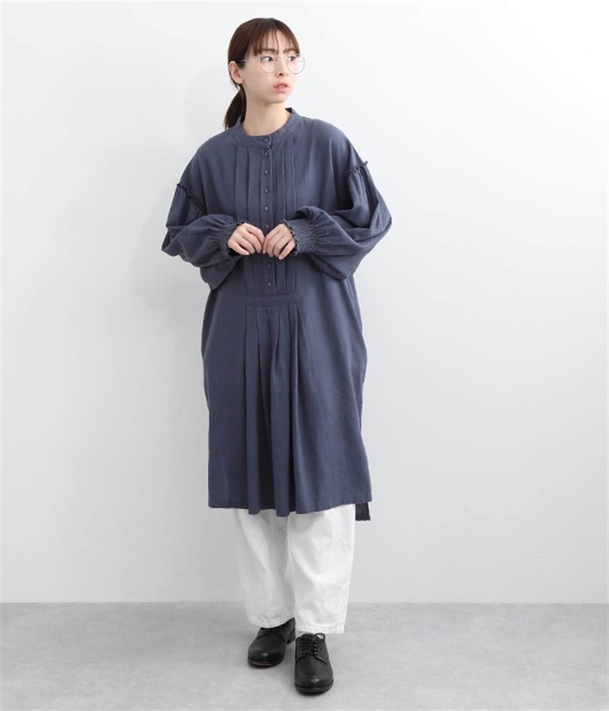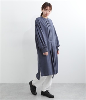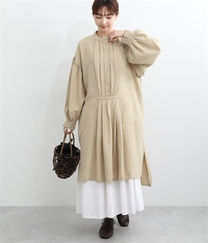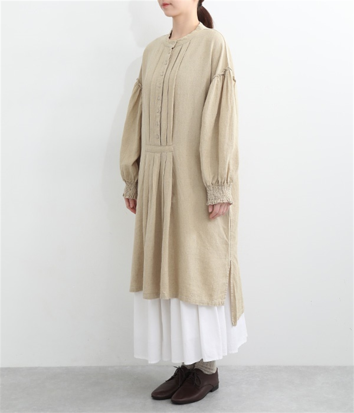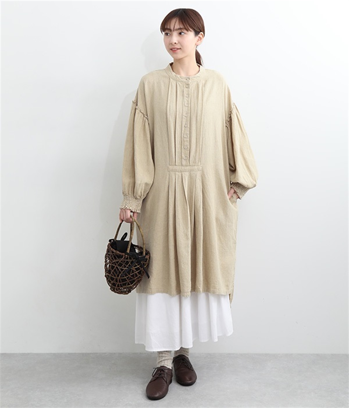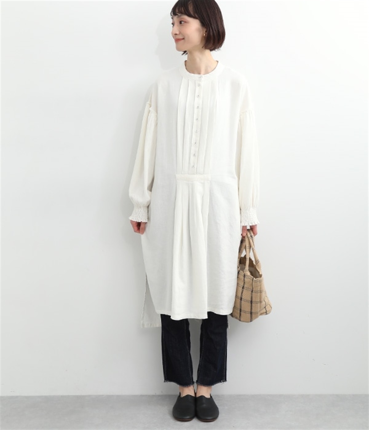 ナチュラルなリネンの風合いと、とろみのあるレーヨンの落ち感がバランス良くミックスされたワンピースです。たぷっとしたボリュームシルエットが目を惹く袖のデザインがポイント。袖口はゴムシャーリングをあしらい、無造作にたくし上げても素敵に決まります。胸元に映える縦ラインを意識した太幅タックがアクセントに。ボトムにさっと重ねるだけでサマになる前後差&裾スリットを施し、レイヤードスタイルをおしゃれに彩ります。