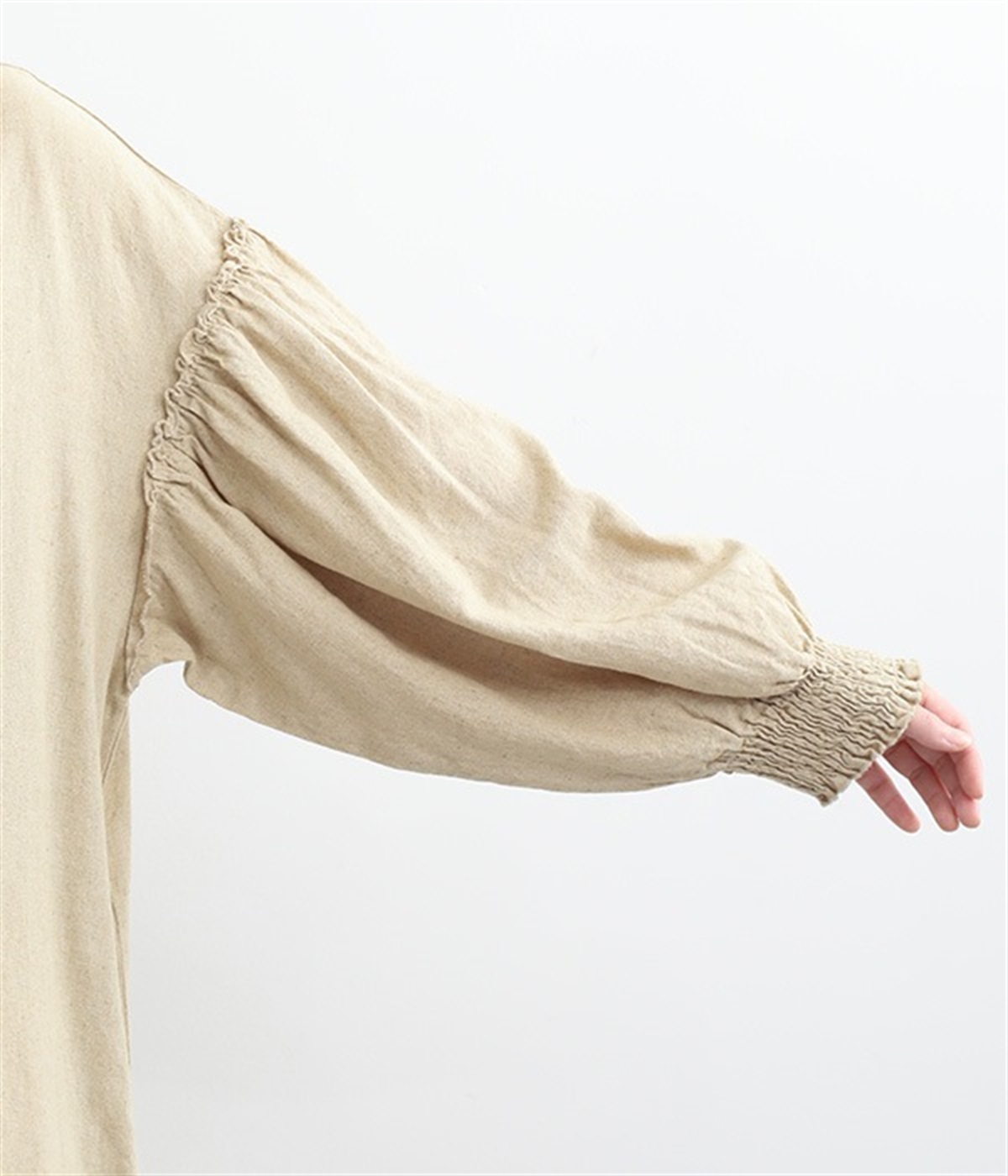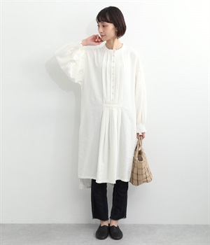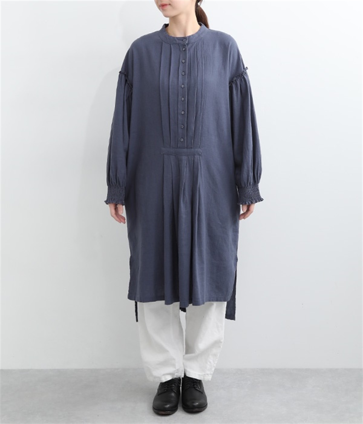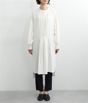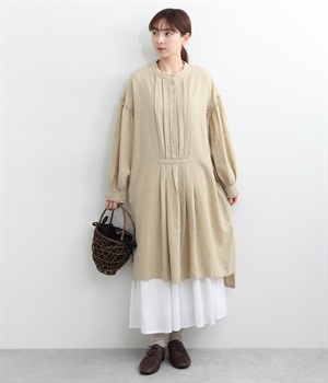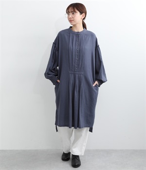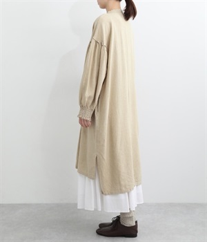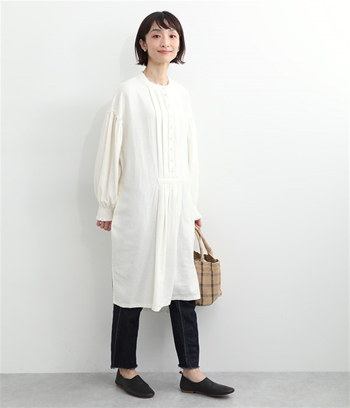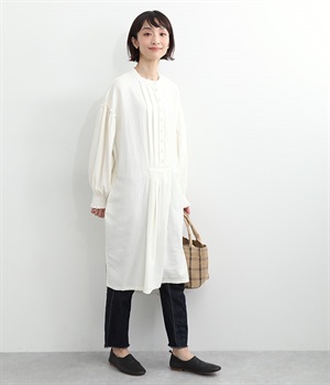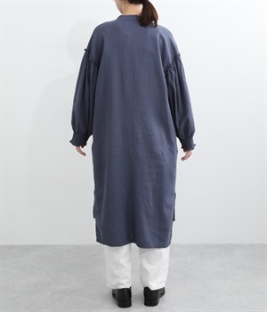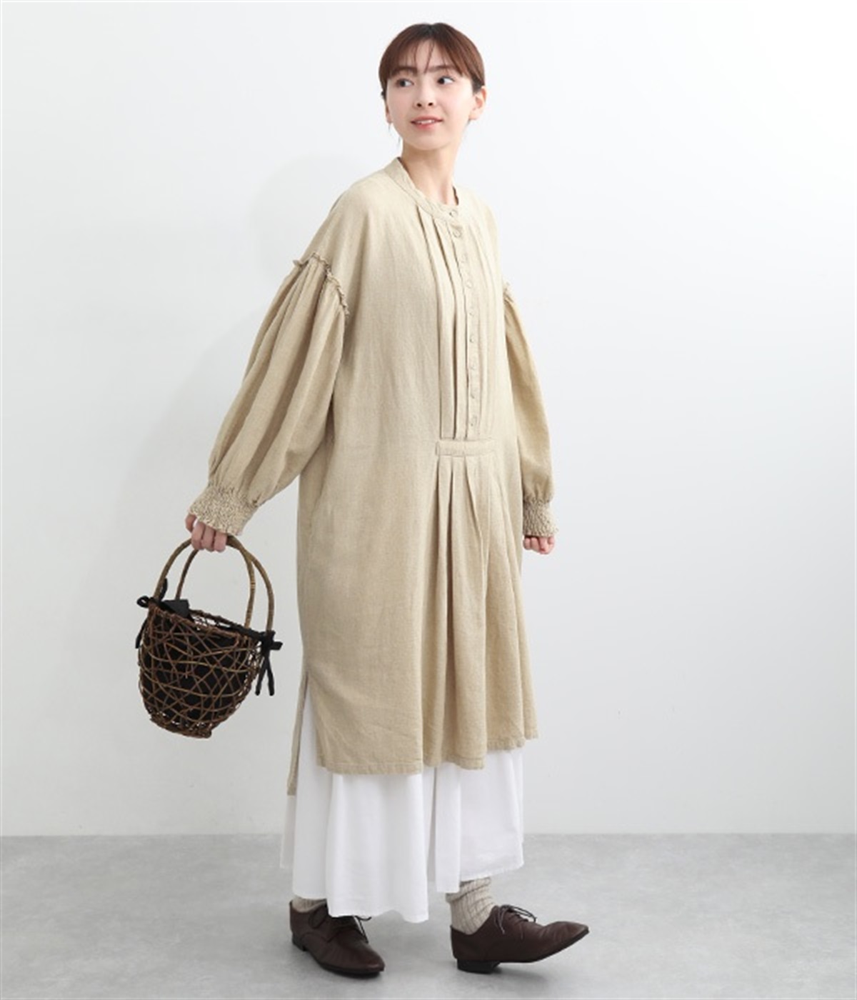 ナチュラルなリネンの風合いと、とろみのあるレーヨンの落ち感がバランス良くミックスされたワンピースです。たぷっとしたボリュームシルエットが目を惹く袖のデザインがポイント。袖口はゴムシャーリングをあしらい、無造作にたくし上げても素敵に決まります。胸元に映える縦ラインを意識した太幅タックがアクセントに。ボトムにさっと重ねるだけでサマになる前後差&裾スリットを施し、レイヤードスタイルをおしゃれに彩ります。