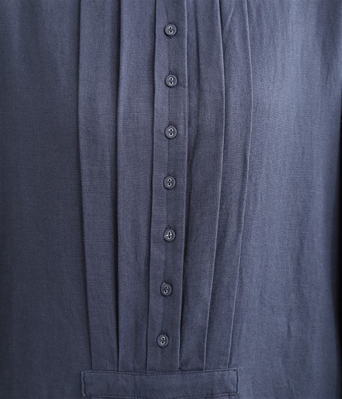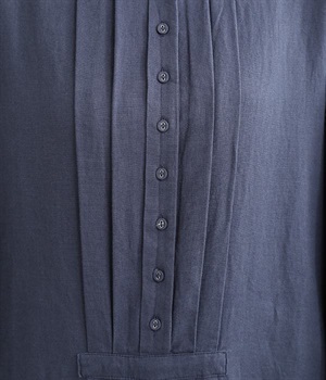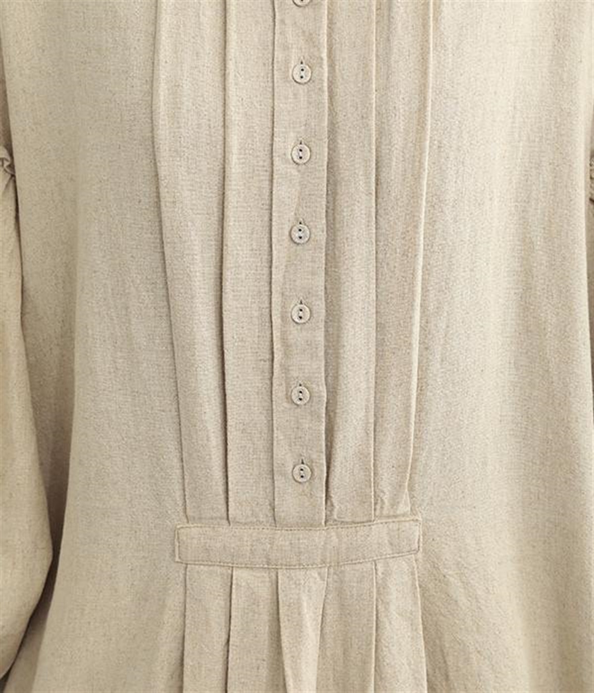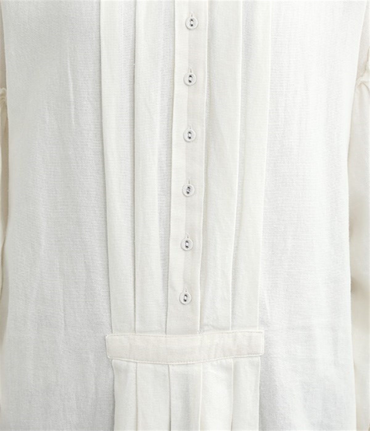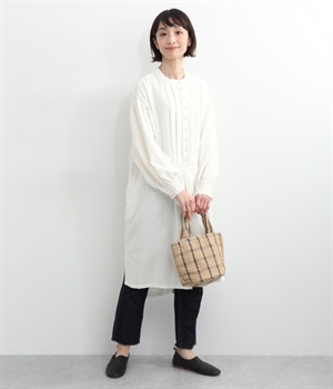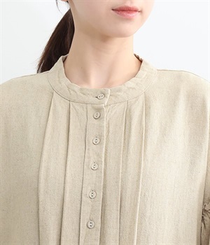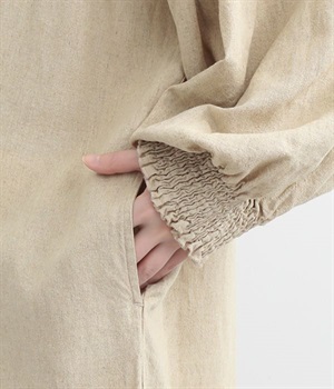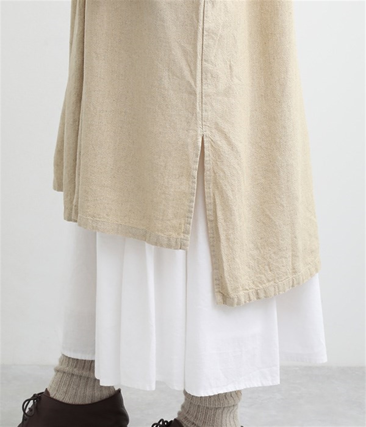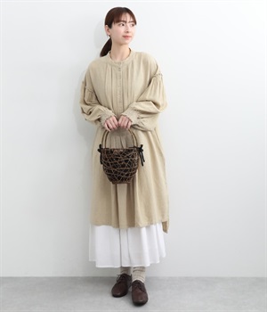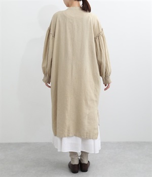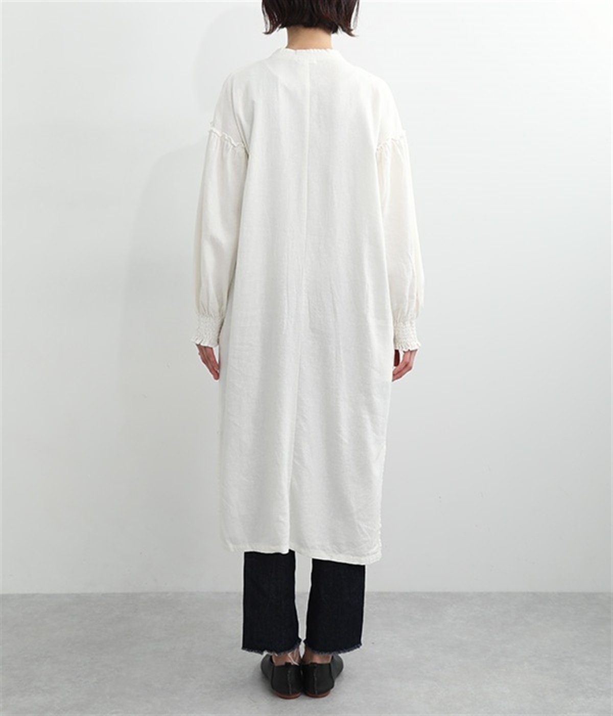 ナチュラルなリネンの風合いと、とろみのあるレーヨンの落ち感がバランス良くミックスされたワンピースです。たぷっとしたボリュームシルエットが目を惹く袖のデザインがポイント。袖口はゴムシャーリングをあしらい、無造作にたくし上げても素敵に決まります。胸元に映える縦ラインを意識した太幅タックがアクセントに。ボトムにさっと重ねるだけでサマになる前後差&裾スリットを施し、レイヤードスタイルをおしゃれに彩ります。