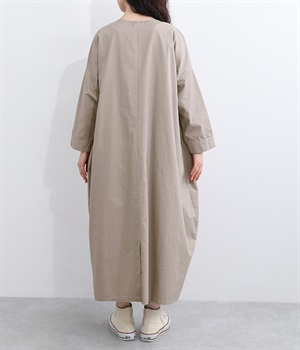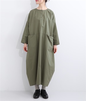 フロントの切り替えに配置した立体ポケットが印象的なワンピース。ヘンリーネックでカジュアル感を残しつつ、体のラインを拾いにくいロング丈のコクーンシルエットで上品にまとめました。後ろの裾中央にはスリット入りで、ボリュームがありながら足さばきは快適です。少しだけボトムをのぞかせても◎。微起毛をかけて洗い込んでいき、やわらかくしっとりとした手触りに仕上げるハイカウントチノを使用しています。