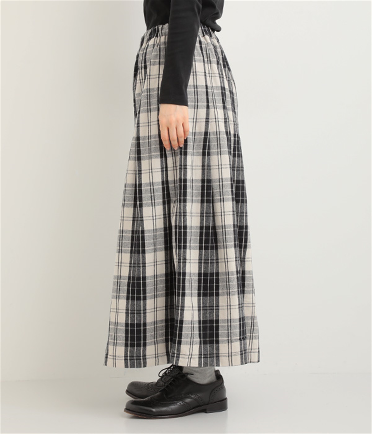 大人気のガウチョパンツにトラッドテイストの新柄が登場しました。ウールのようにあたたかな起毛感をもつコットンビエラ素材を使用。スカートのようにも見えるタック使いが特徴で、総柄も相まって脚線が目立ちにくいデザインです。ぐるりと一周通したウエストゴムの幅が狭いため、トップスインでもゴムが表に出すぎないのがポイント。深みのある色あいなので晩夏あたりから冬までの着用に適しています。