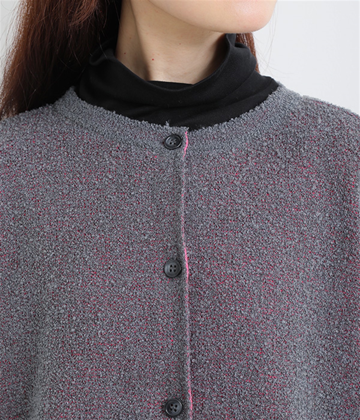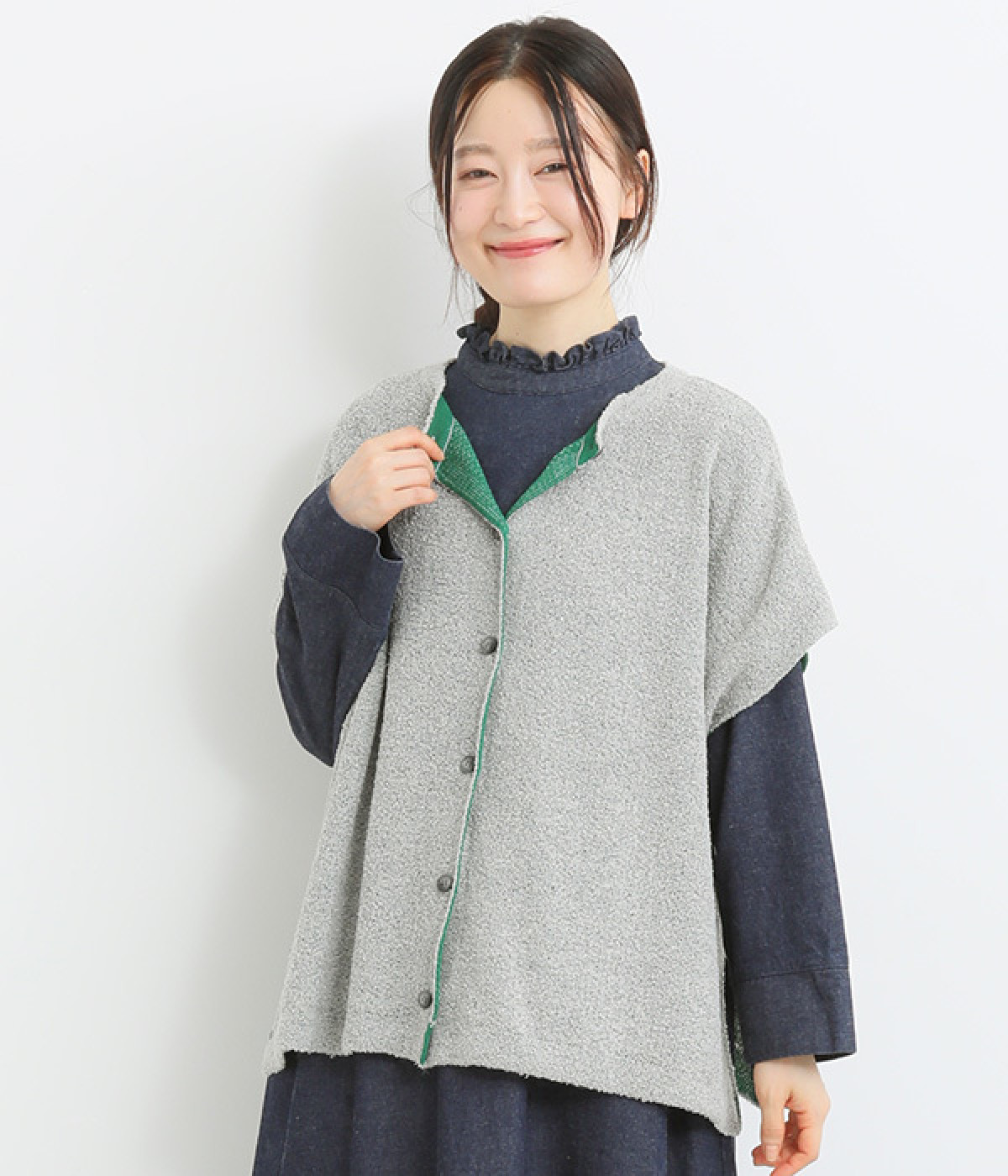 首元の裏地を見せて色のコントラストを楽しんでも◎