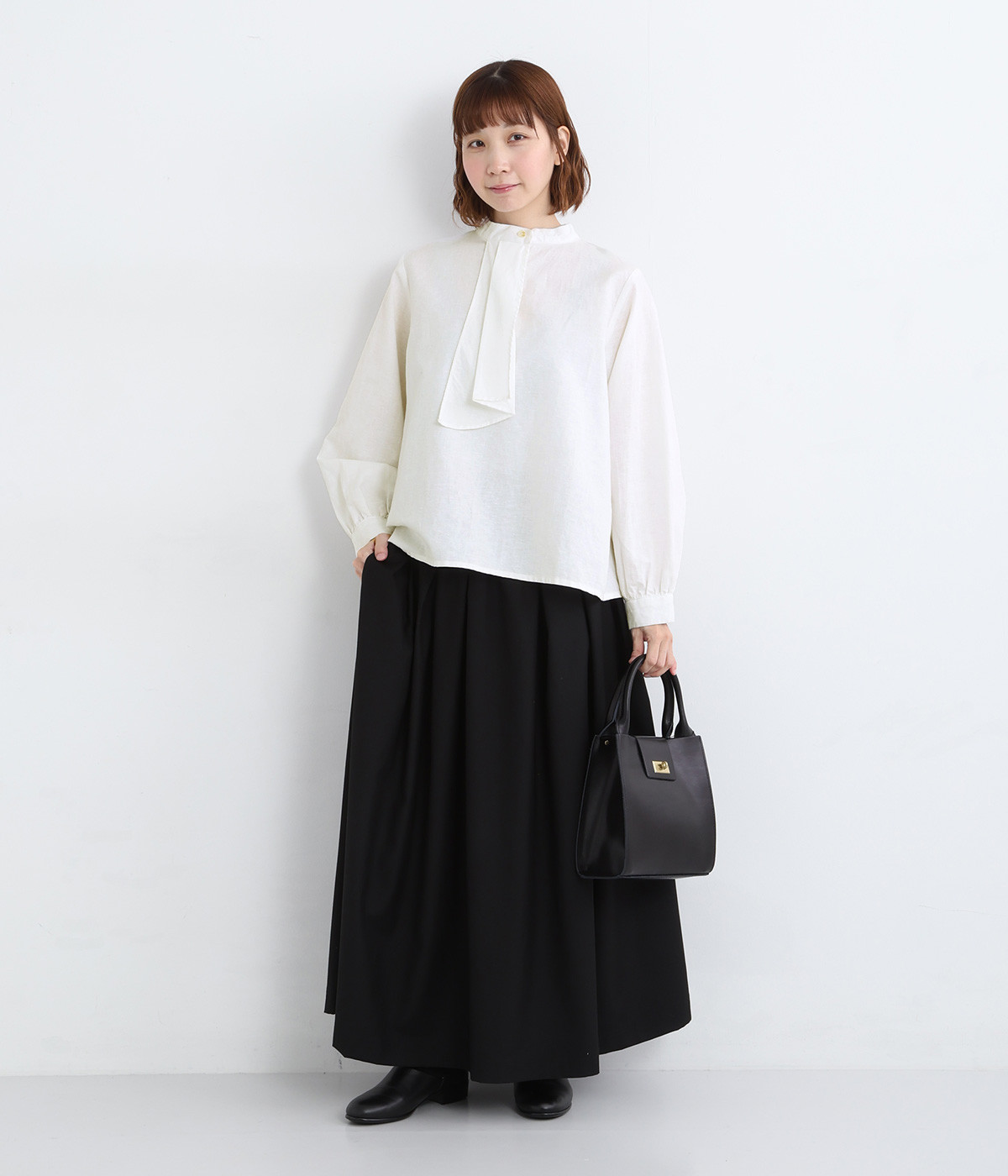 ドレープのきいた個性的なボウタイがポイント