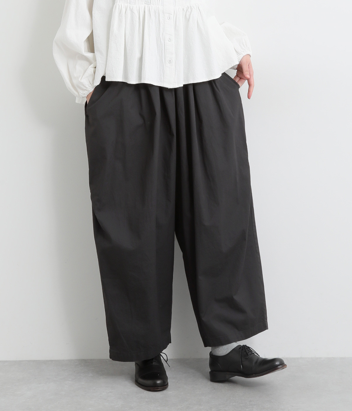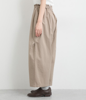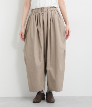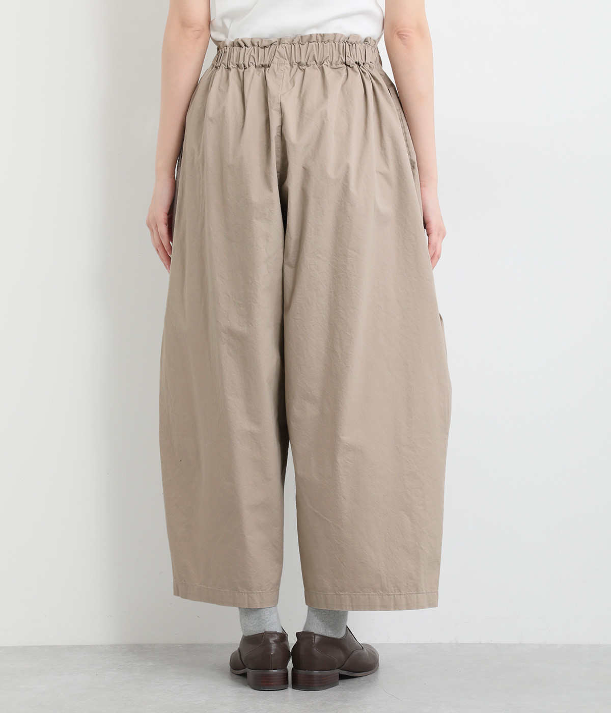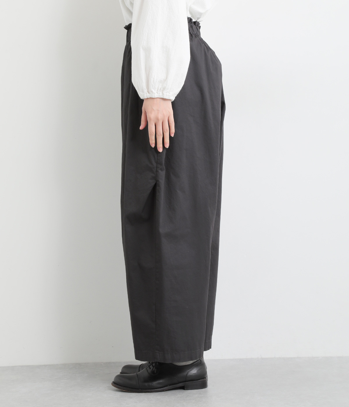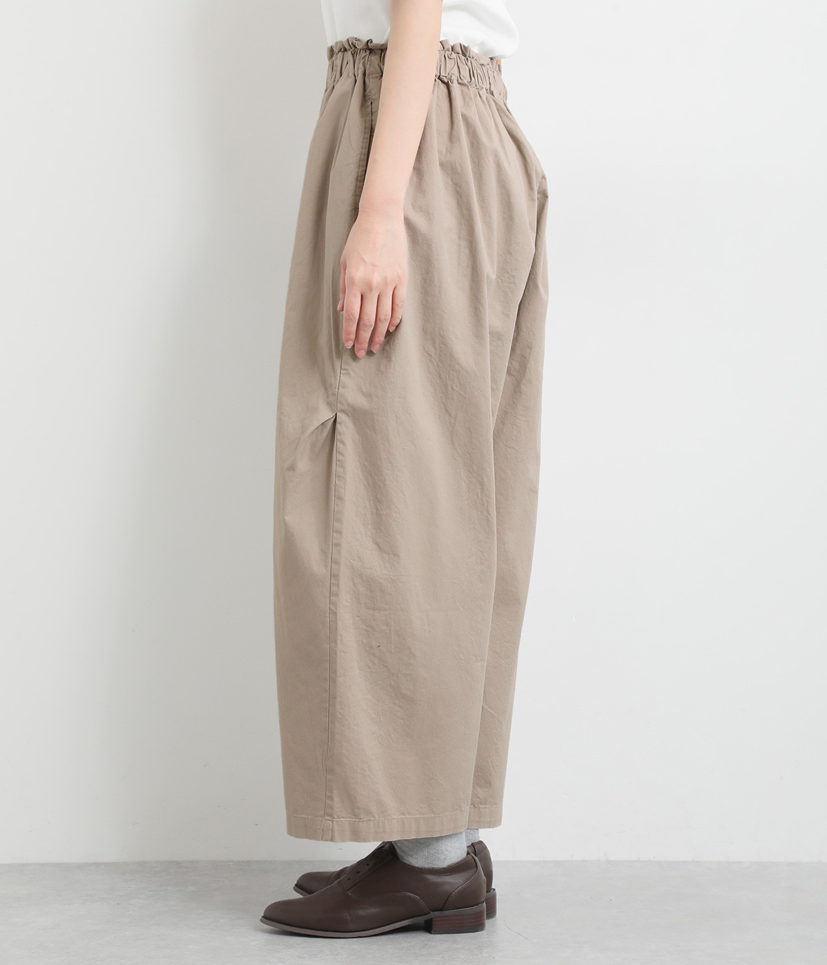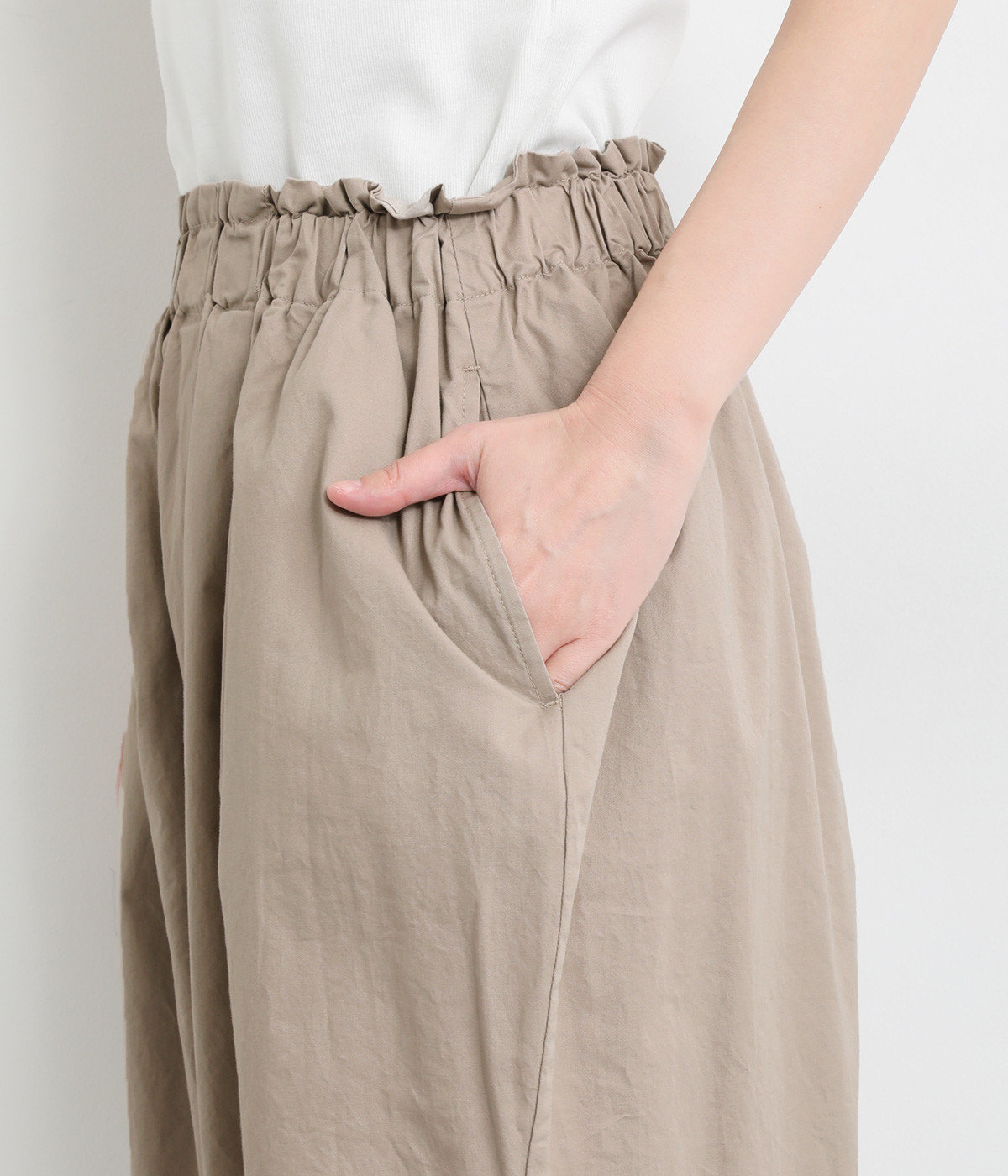 ひざ位置のサイドタックで立体感を持たせたワイドシルエットが、無地ながらも存在感のある発揮。ボーイッシュな装いにもなじむ一本です。ウエストは総ゴムフリル仕立てで、トップスをすっきりインしても◎。
