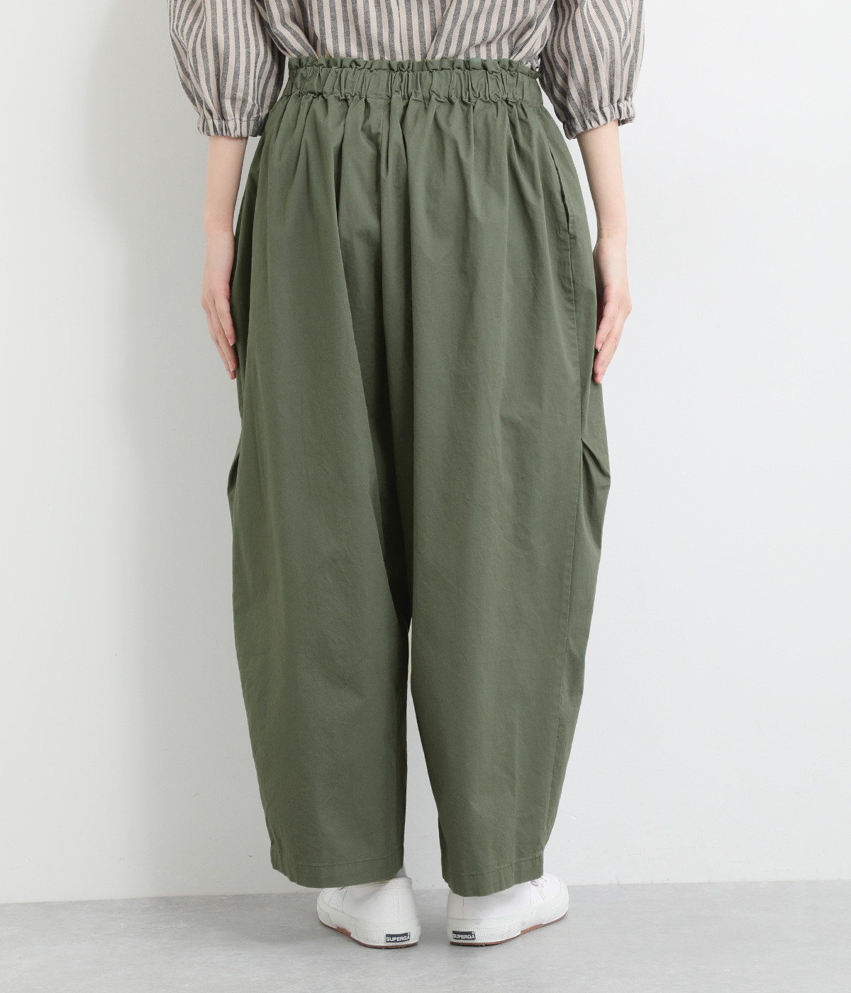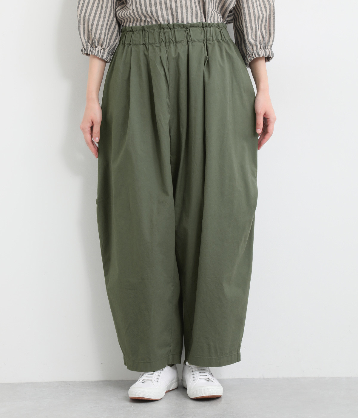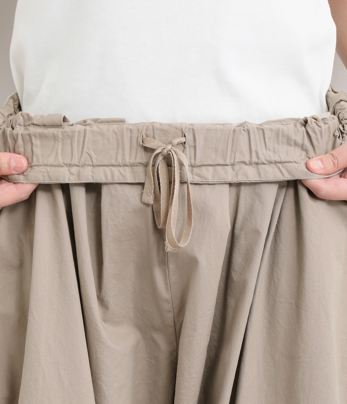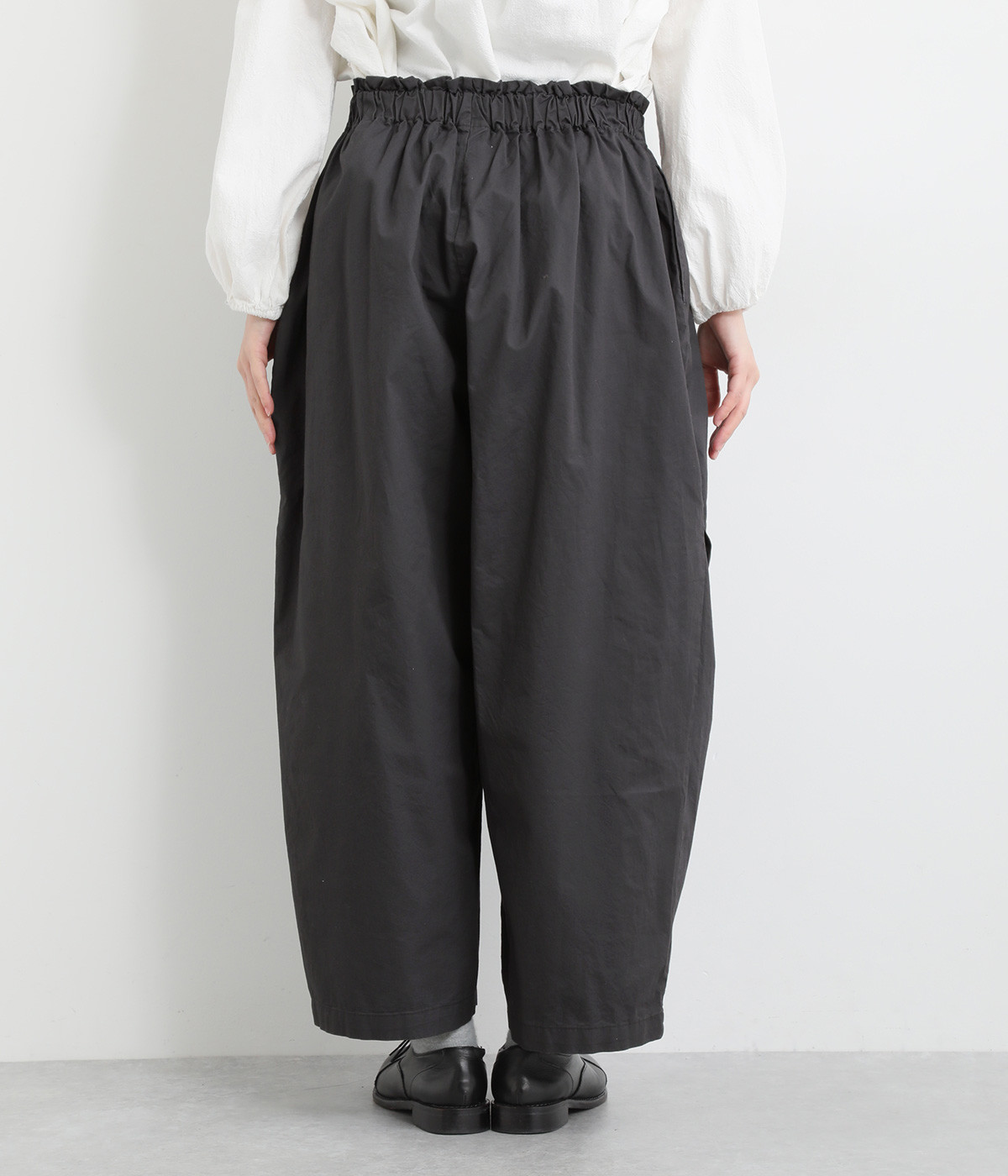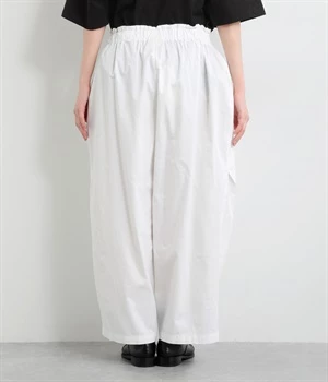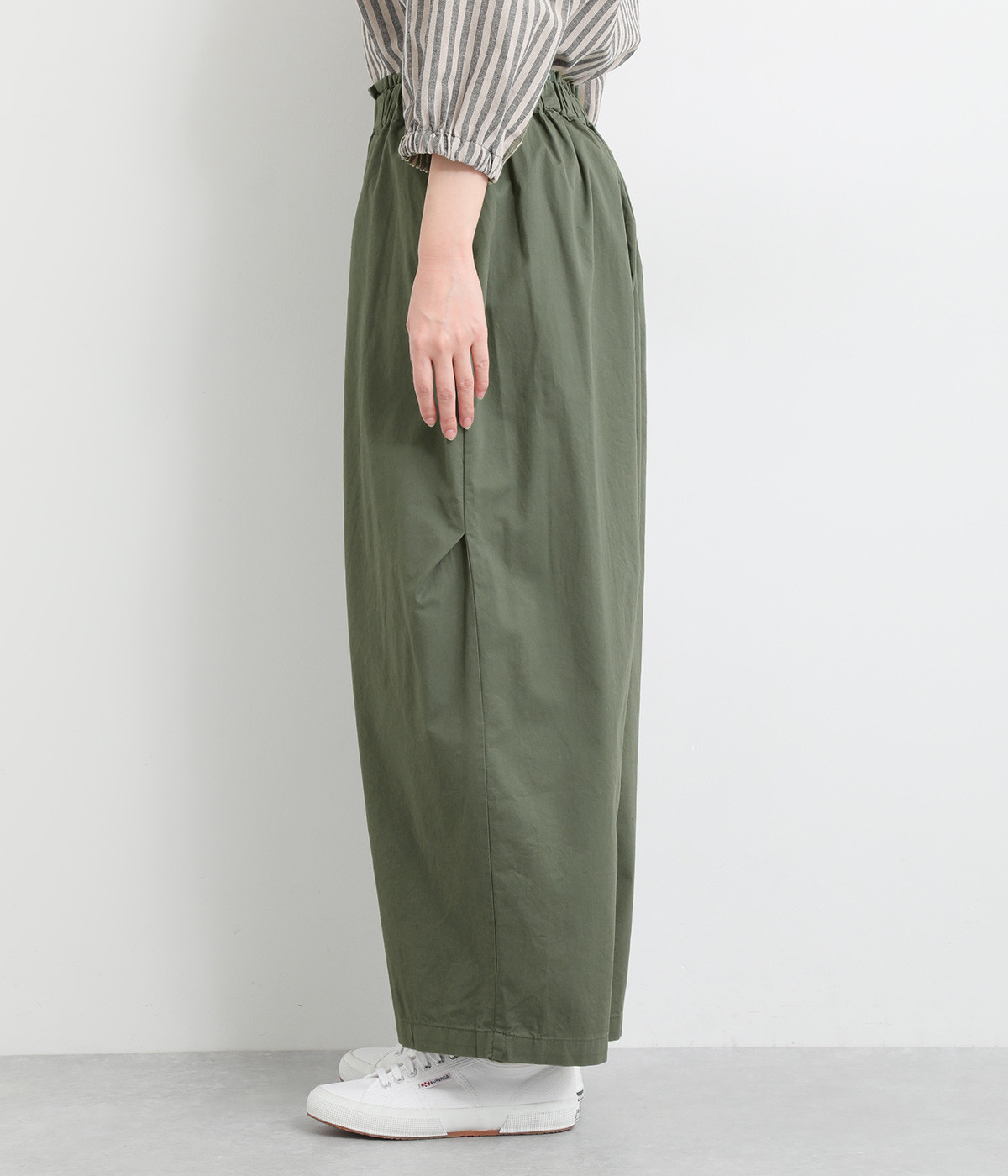 ひざ位置のサイドタックで立体感を持たせたワイドシルエットが、無地ながらも存在感のある発揮。ボーイッシュな装いにもなじむ一本です。ウエストは総ゴムフリル仕立てで、トップスをすっきりインしても◎。