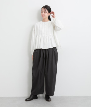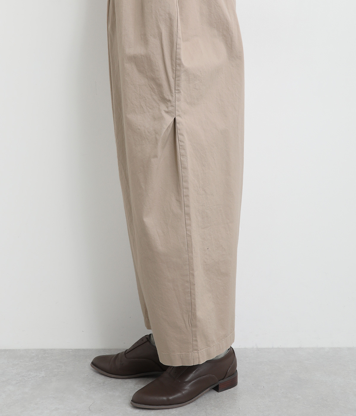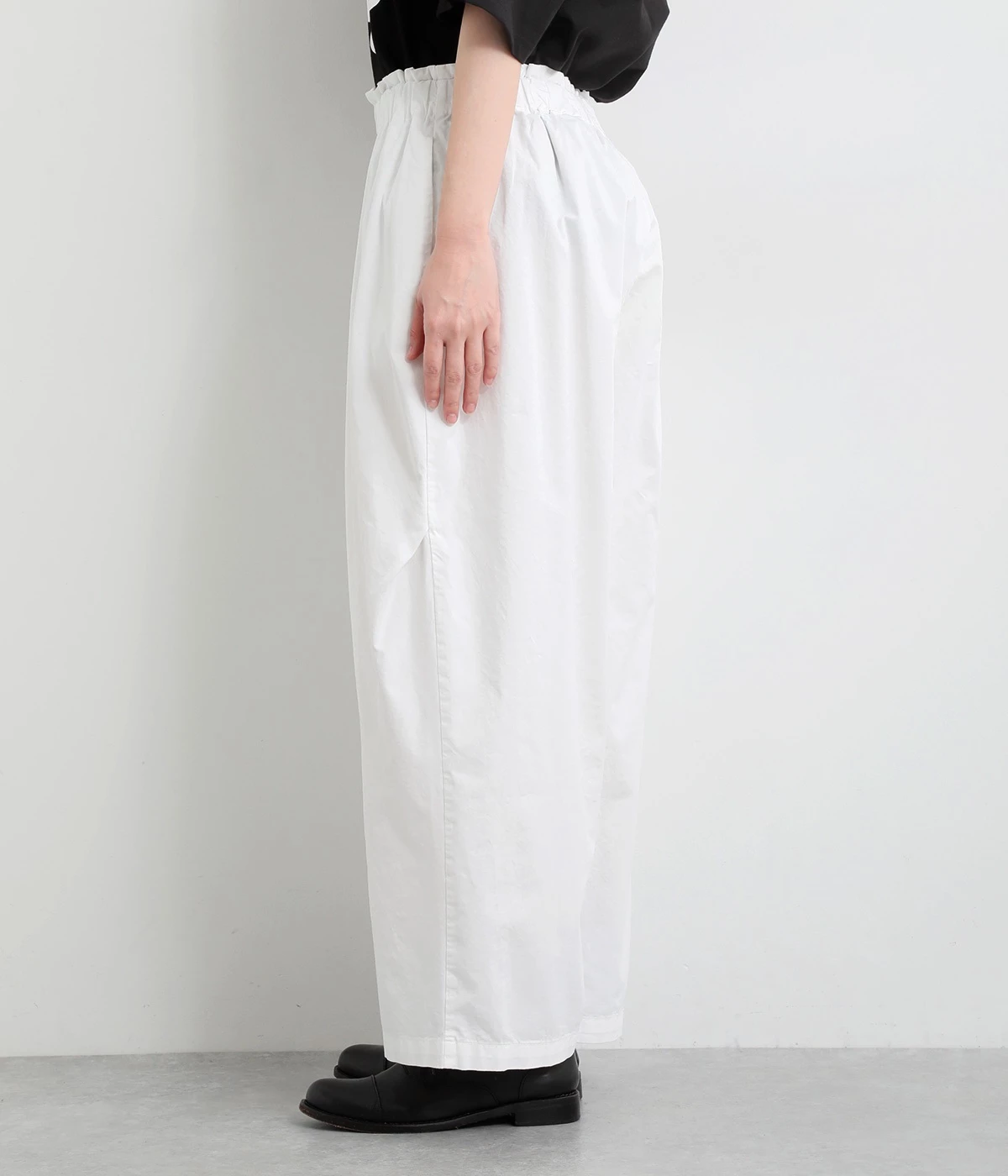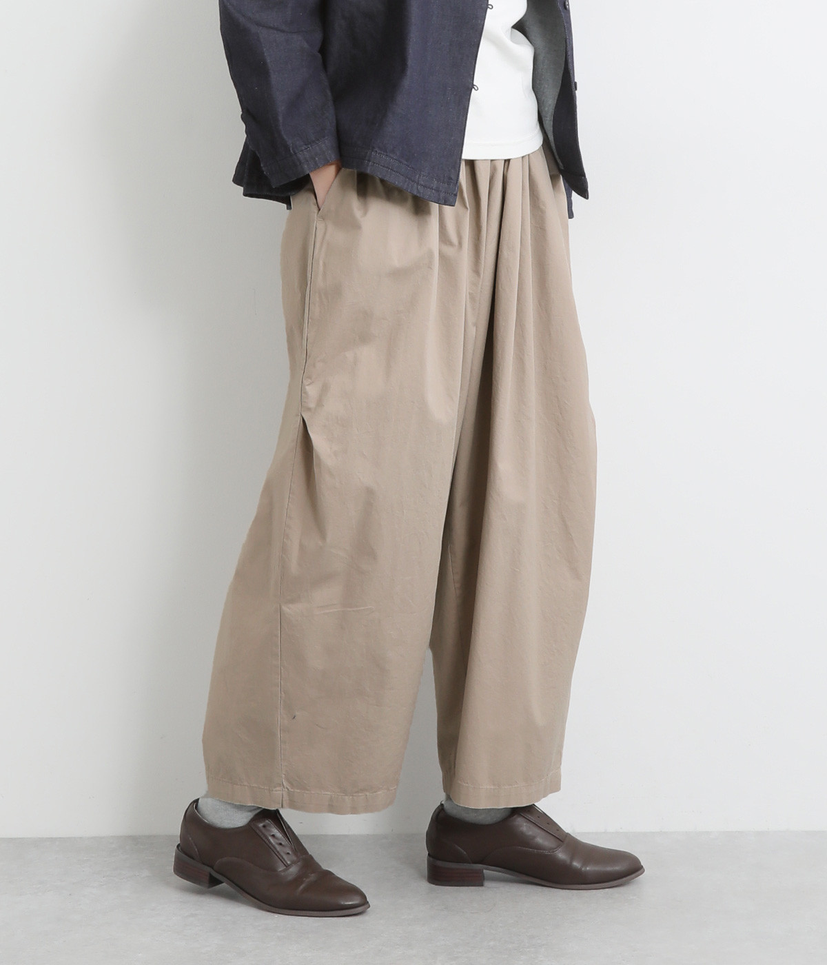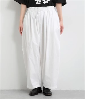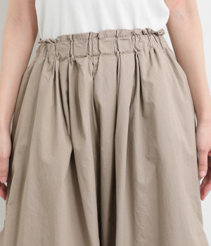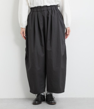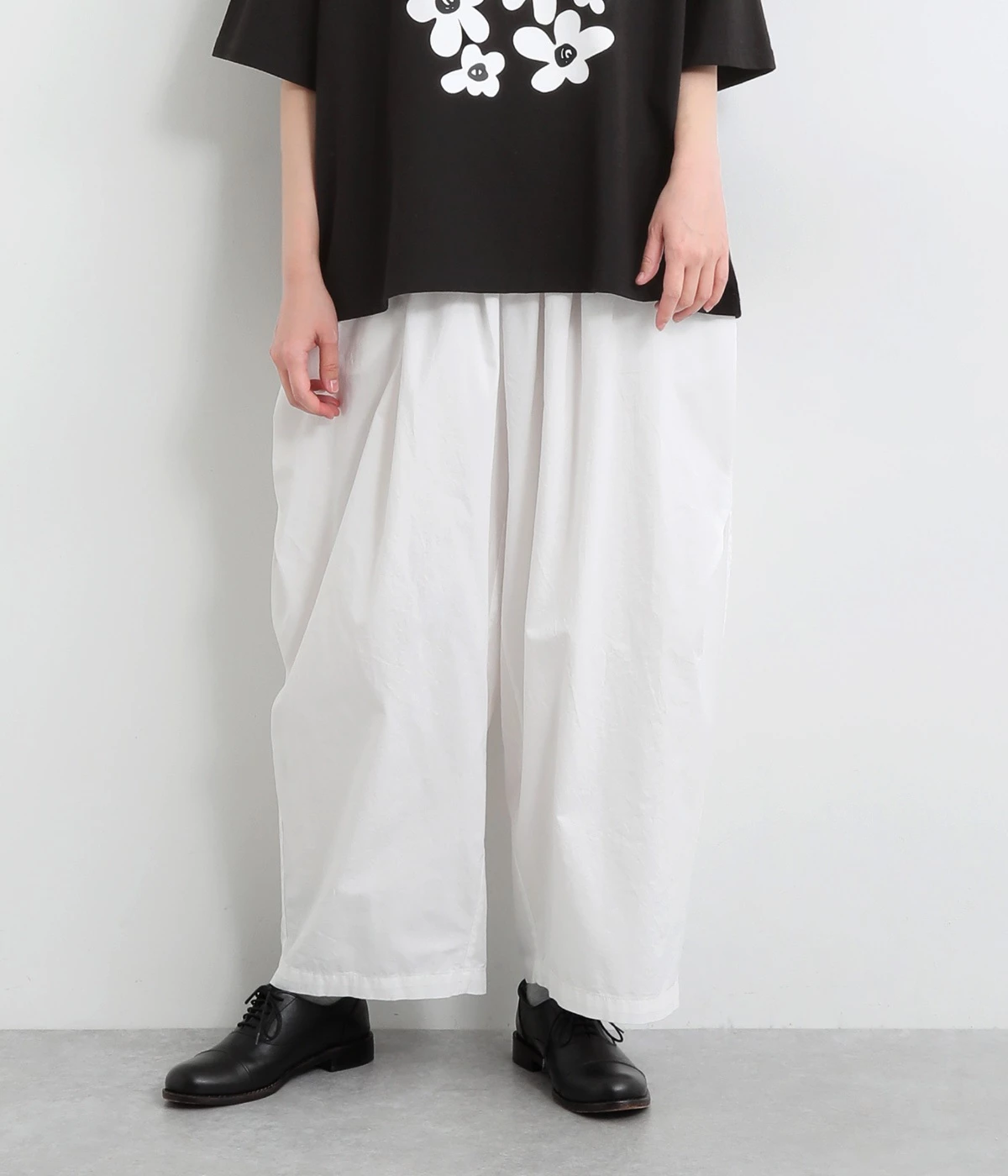 ひざ位置のサイドタックで立体感を持たせたワイドシルエットが、無地ながらも存在感のある発揮。ボーイッシュな装いにもなじむ一本です。ウエストは総ゴムフリル仕立てで、トップスをすっきりインしても◎。