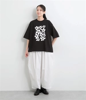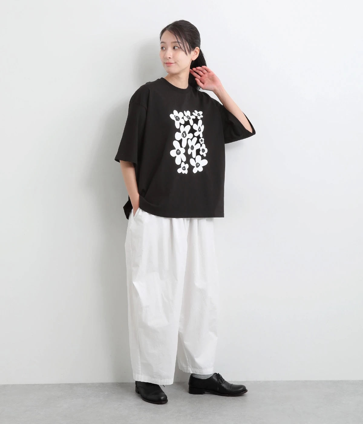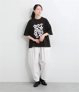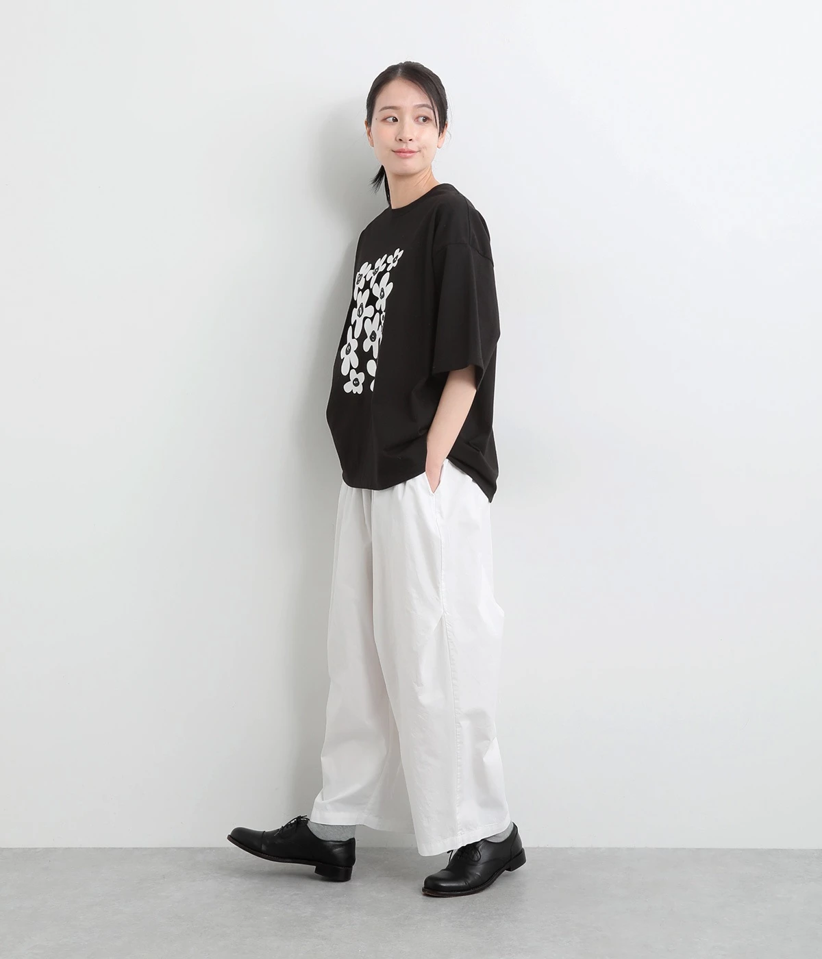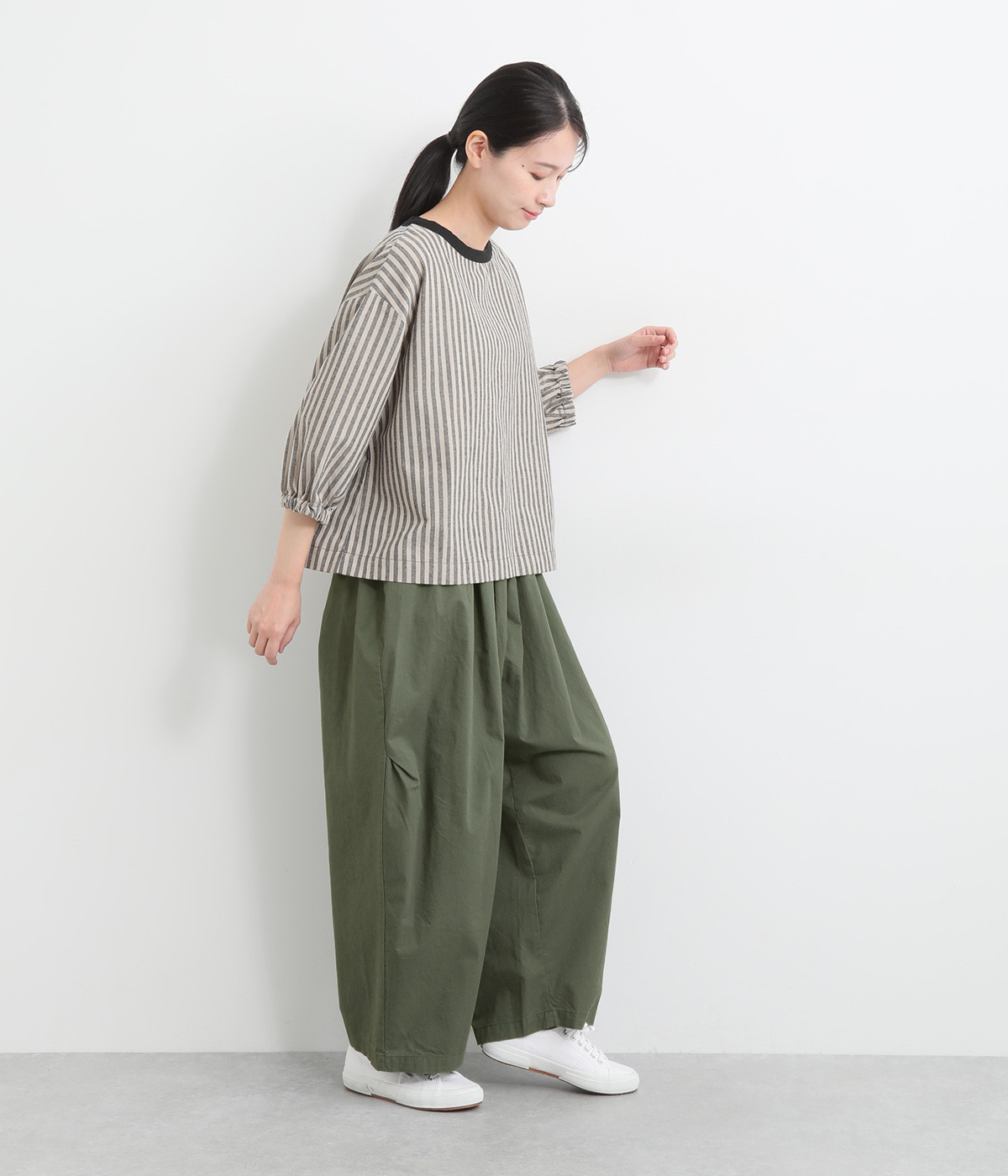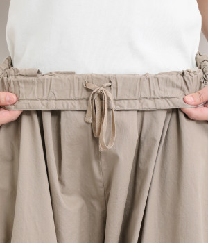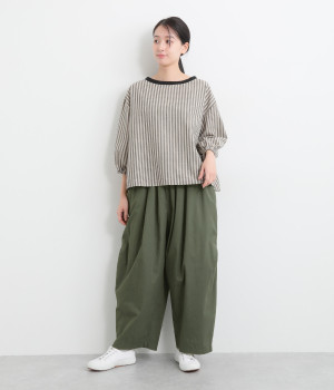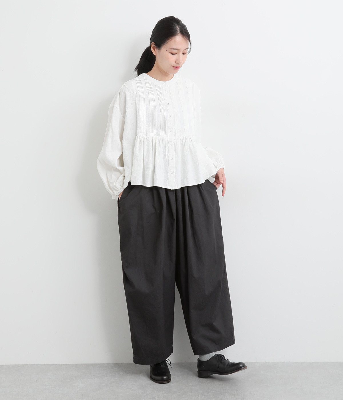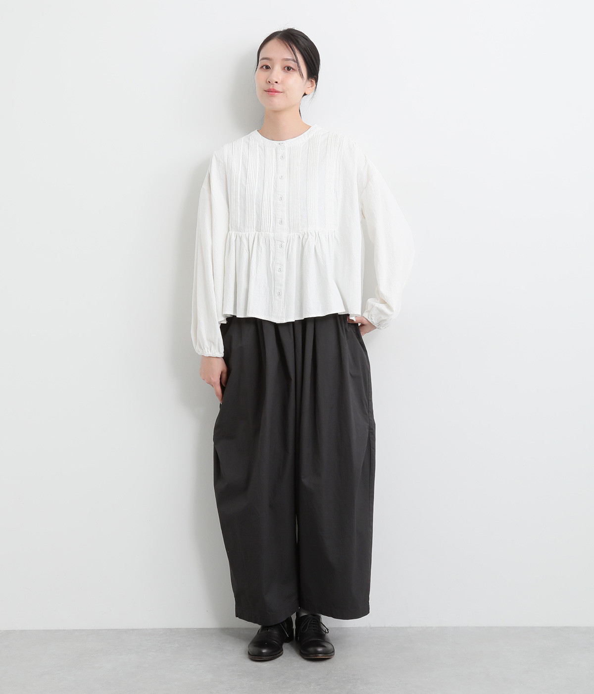 ひざ位置のサイドタックで立体感を持たせたワイドシルエットが、無地ながらも存在感のある発揮。ボーイッシュな装いにもなじむ一本です。ウエストは総ゴムフリル仕立てで、トップスをすっきりインしても◎。