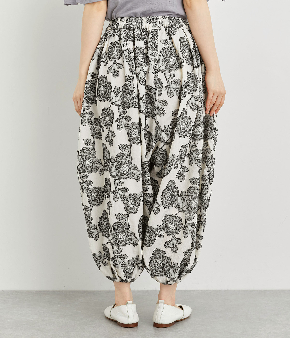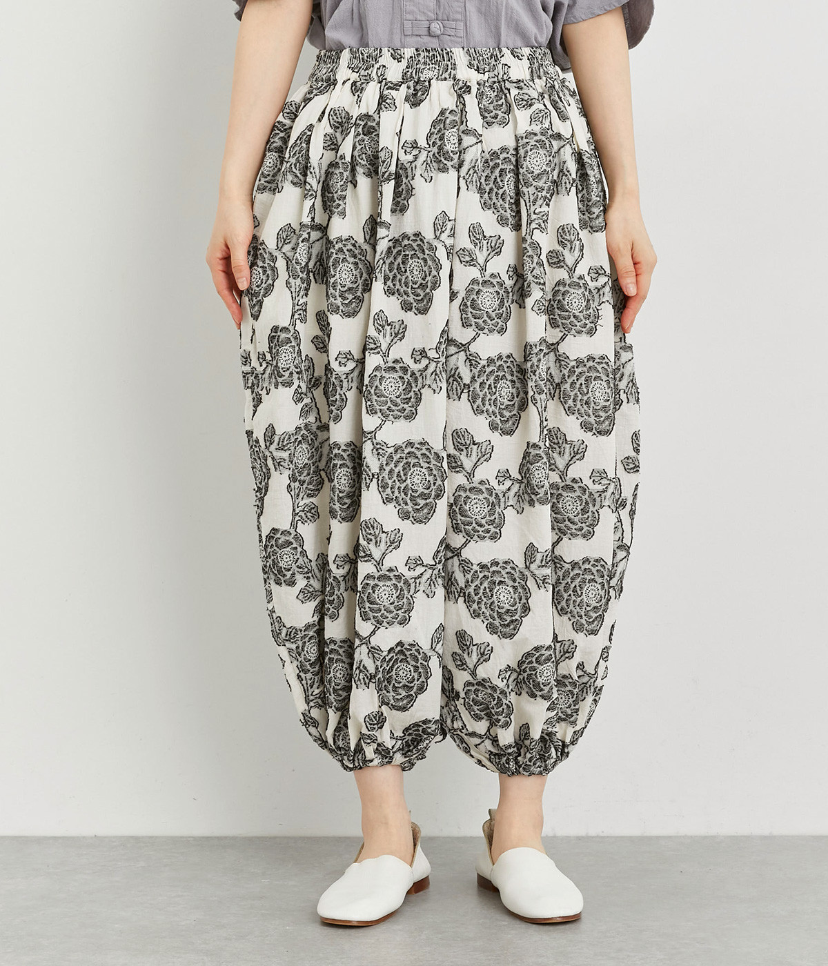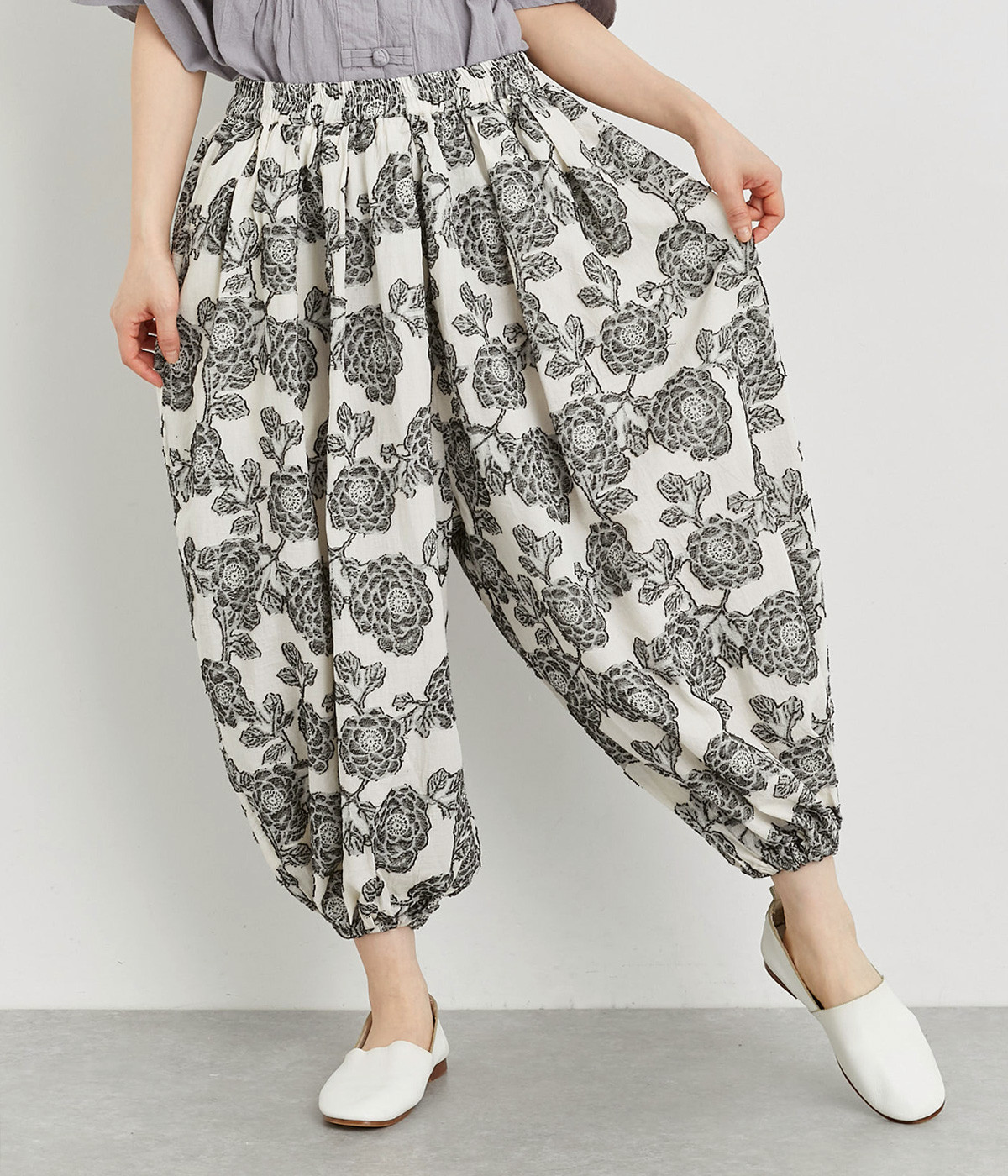 大胆な柄が目を惹き、スタイリングのポイントになるパンツです。ウエスト下のタックと裾ゴムでボリュームのあるシルエットに仕立てました。カジュアルなデザインながら素材感で大人顔なコーディネートがたのしめます。ウエストは総ゴム仕様です。