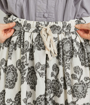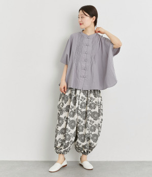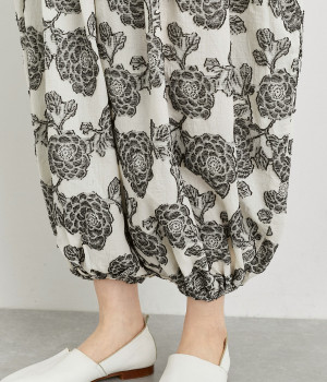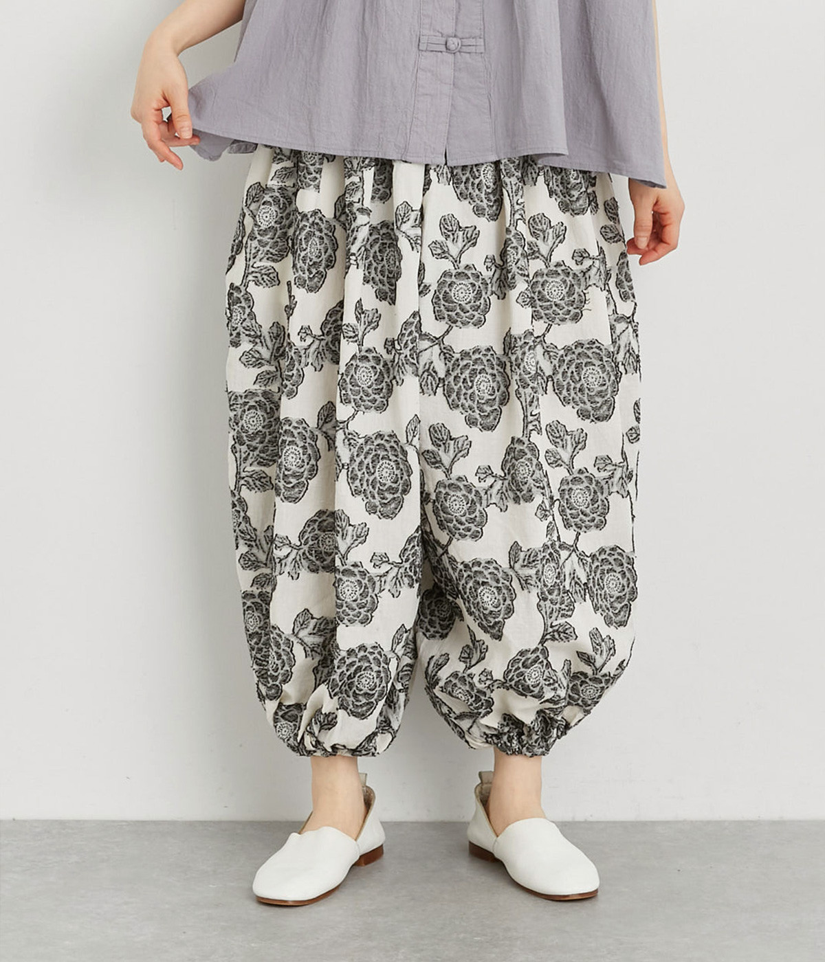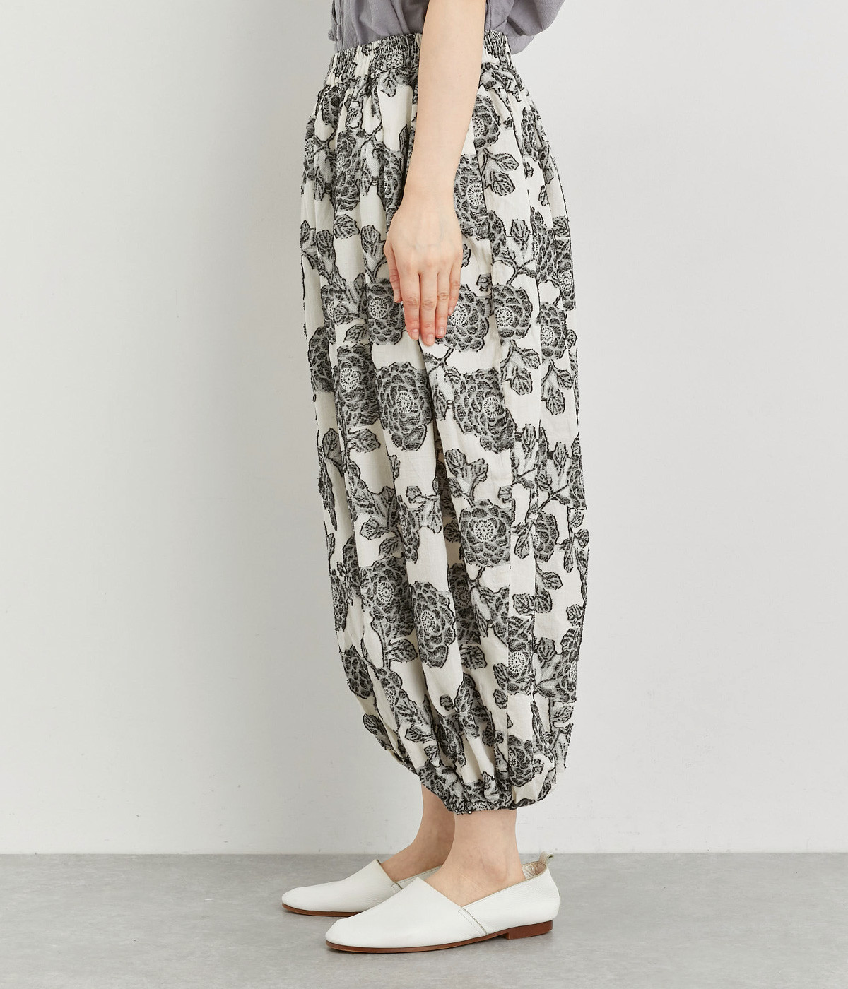 大胆な柄が目を惹き、スタイリングのポイントになるパンツです。ウエスト下のタックと裾ゴムでボリュームのあるシルエットに仕立てました。カジュアルなデザインながら素材感で大人顔なコーディネートがたのしめます。ウエストは総ゴム仕様です。