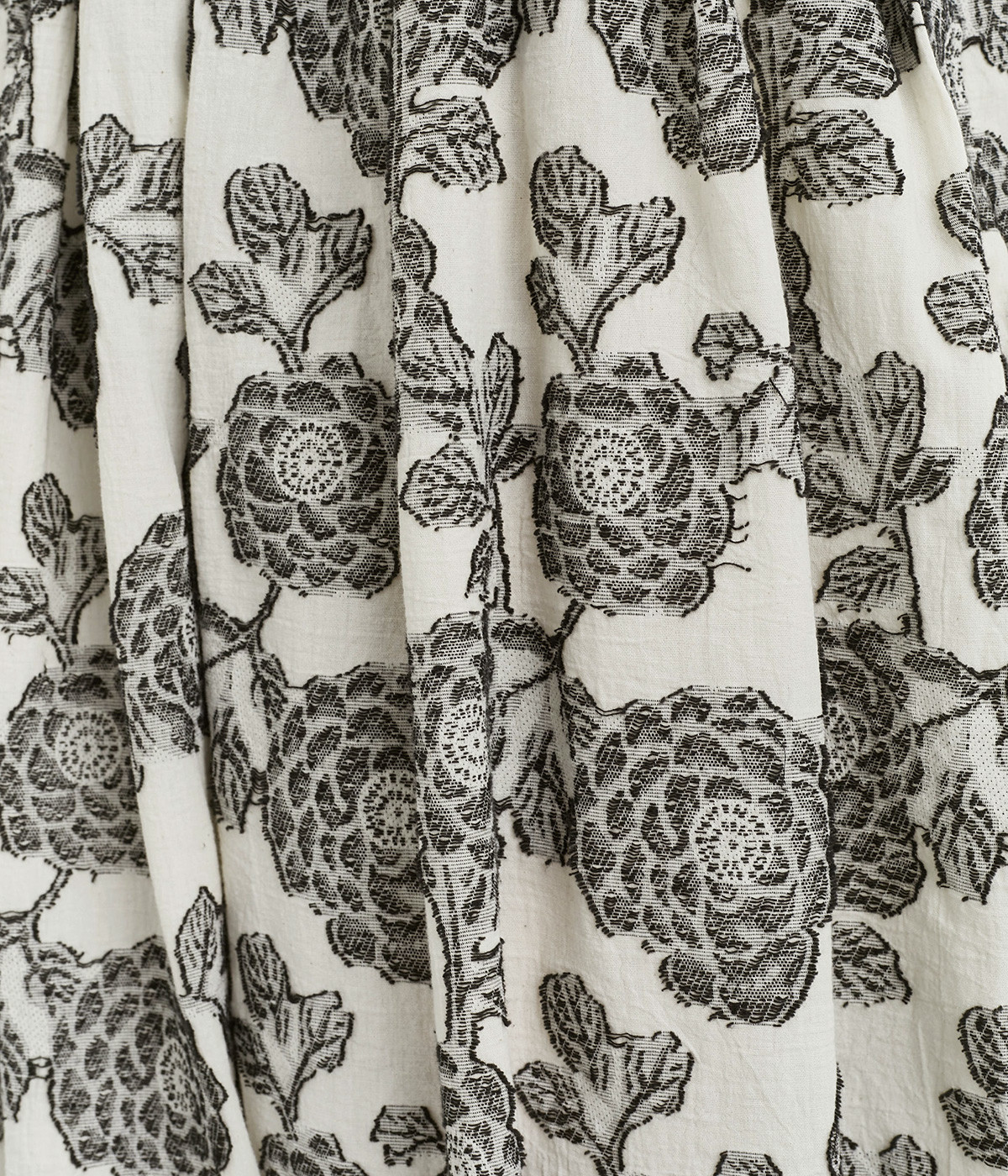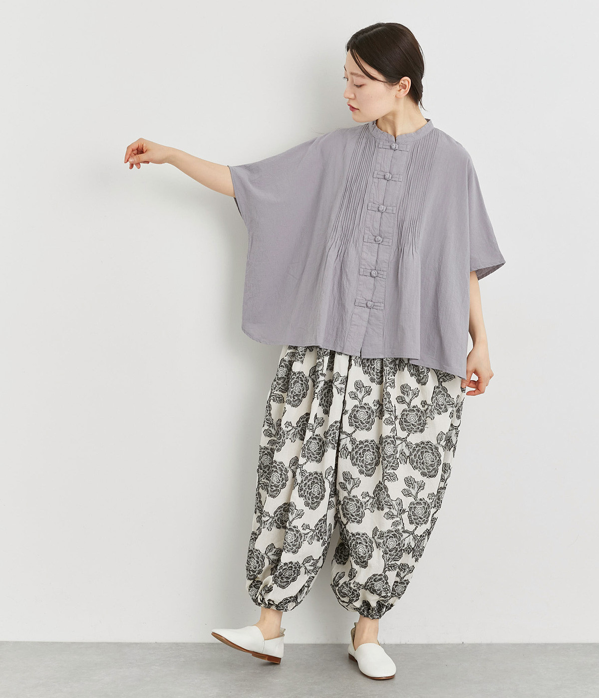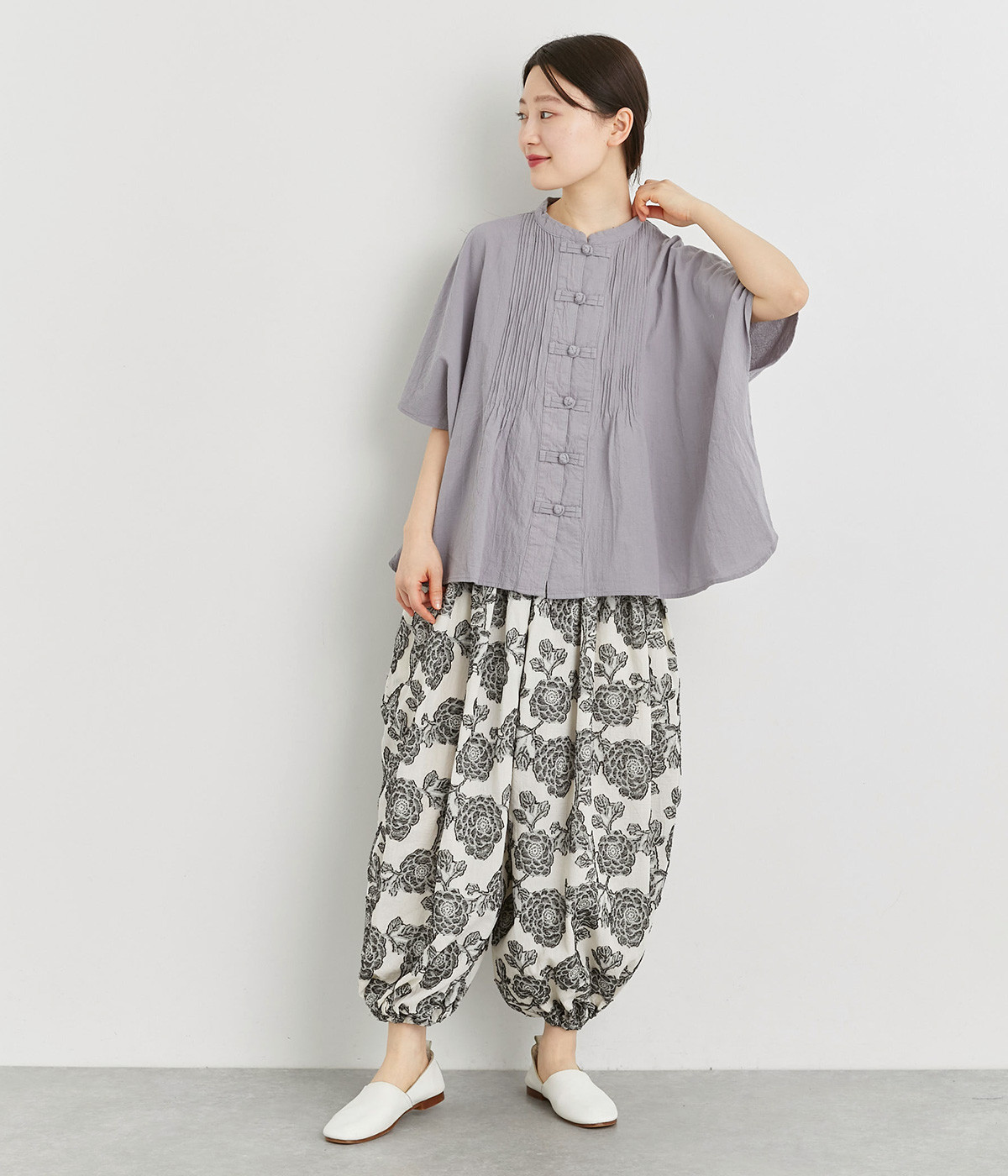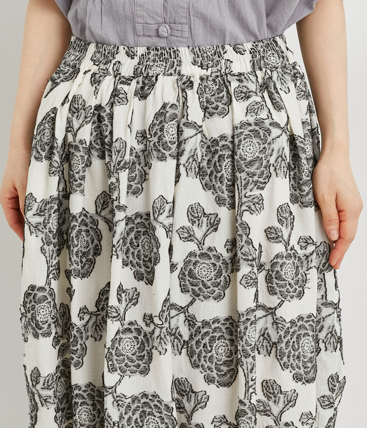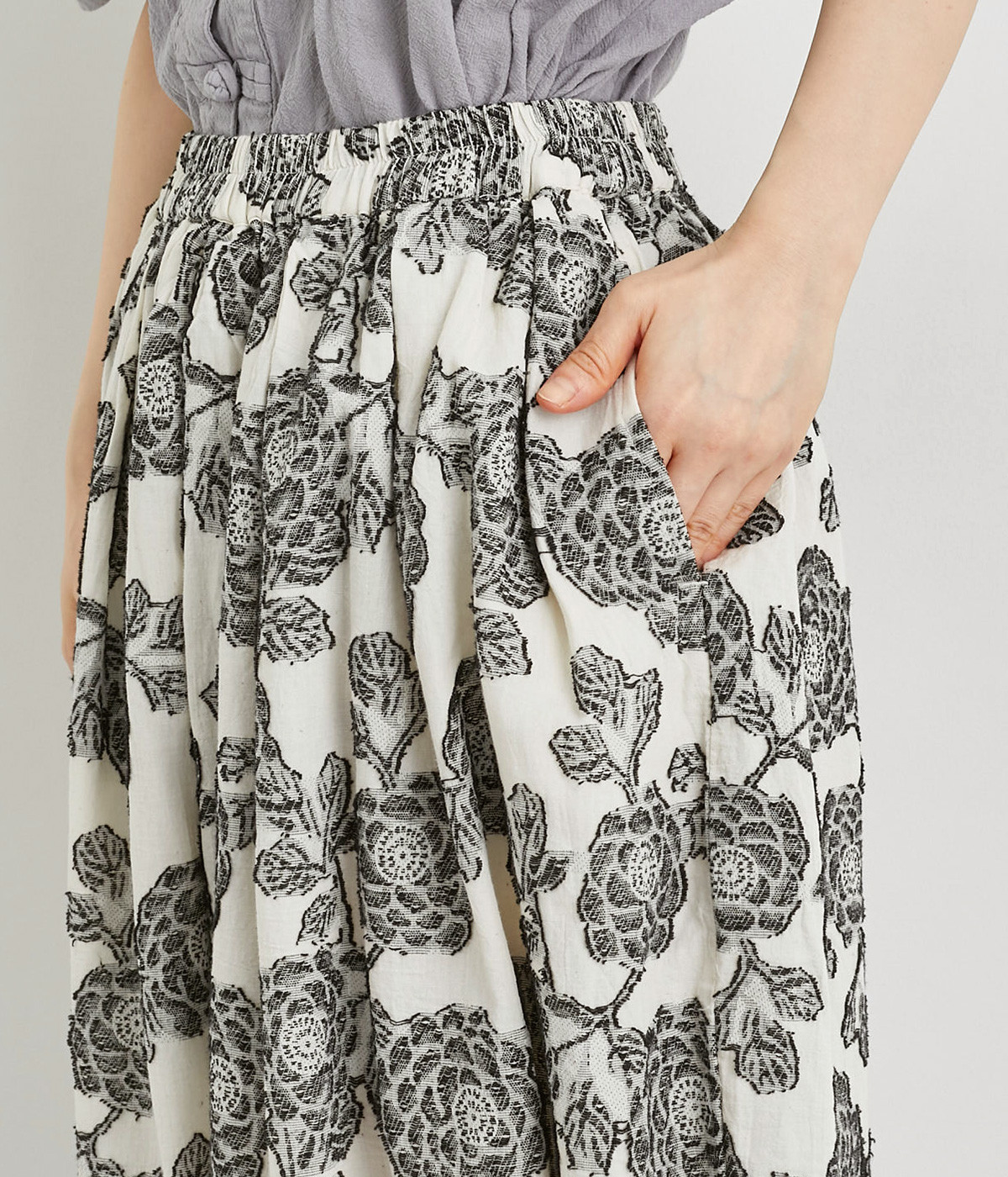 立体感のある花柄がモダンで目を惹くジャカード織の総柄生地を使用しました。肌離れのいいさらりとした素材が心地よく、着こなししだいでロングシーズン活躍します。