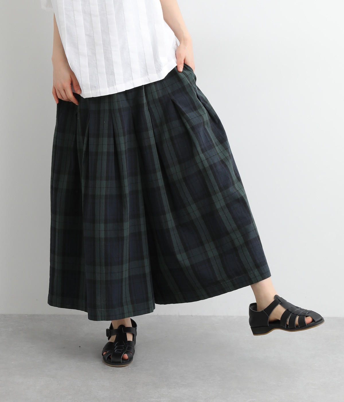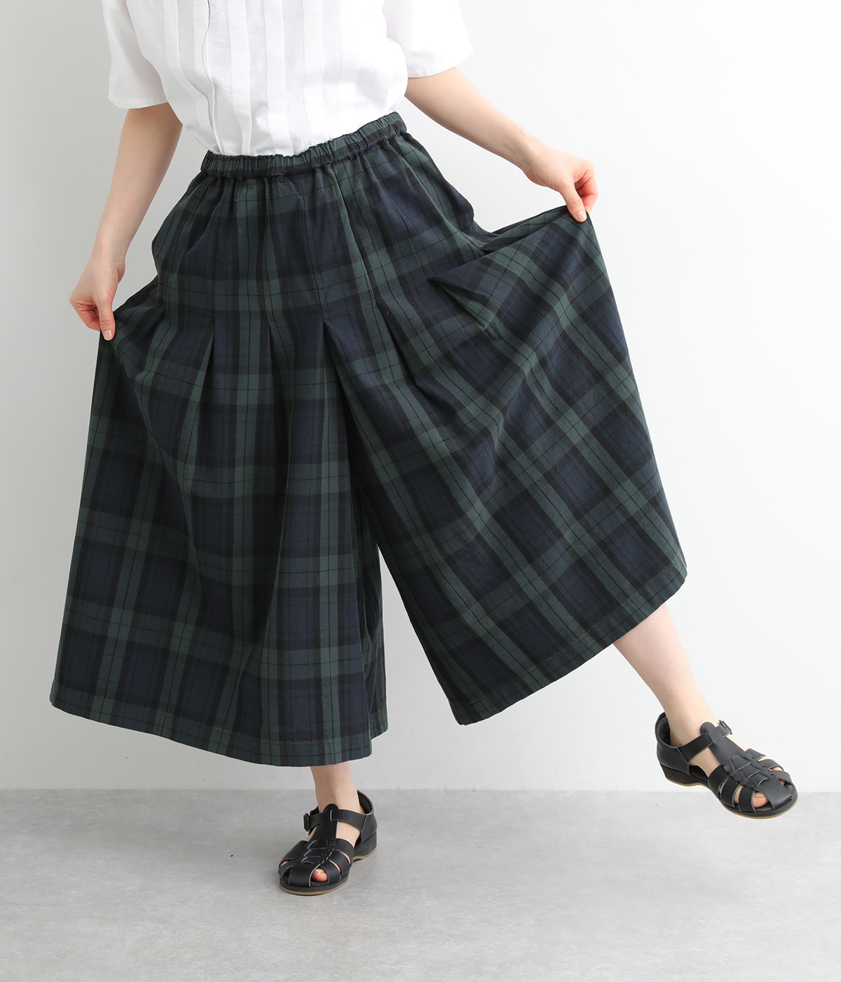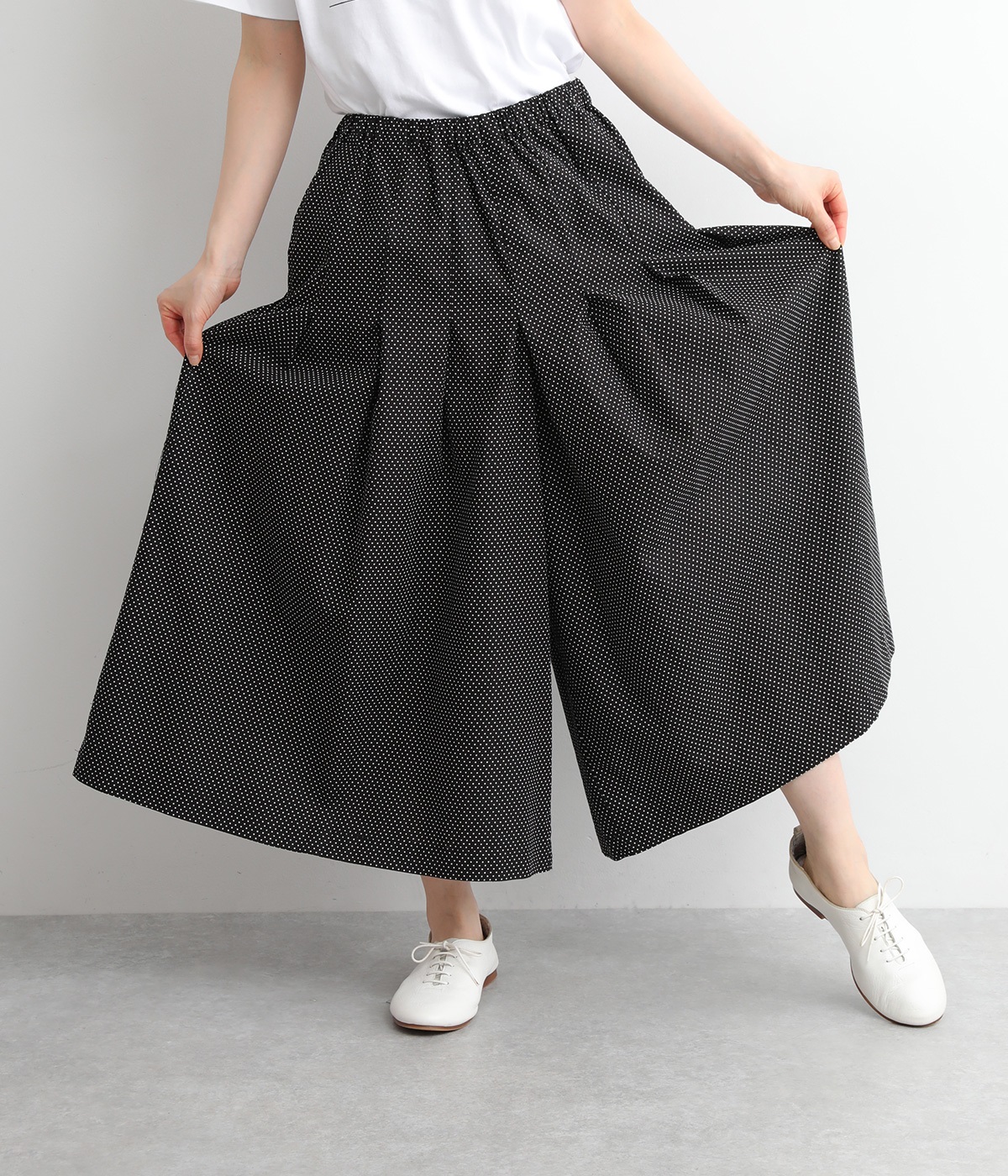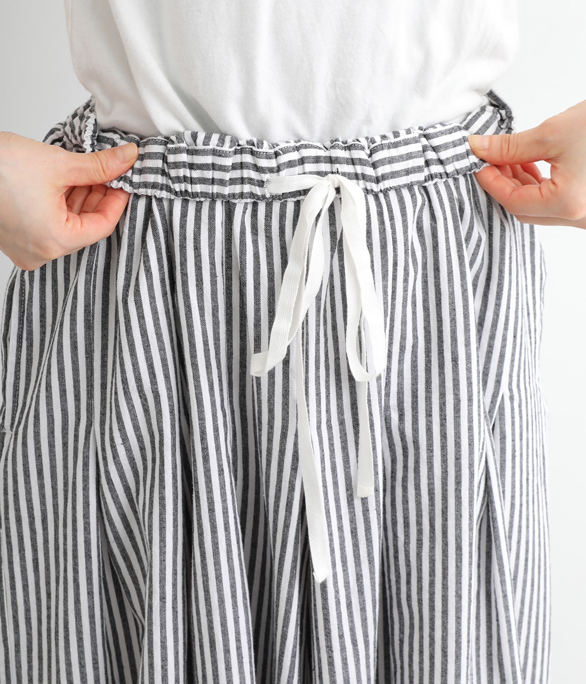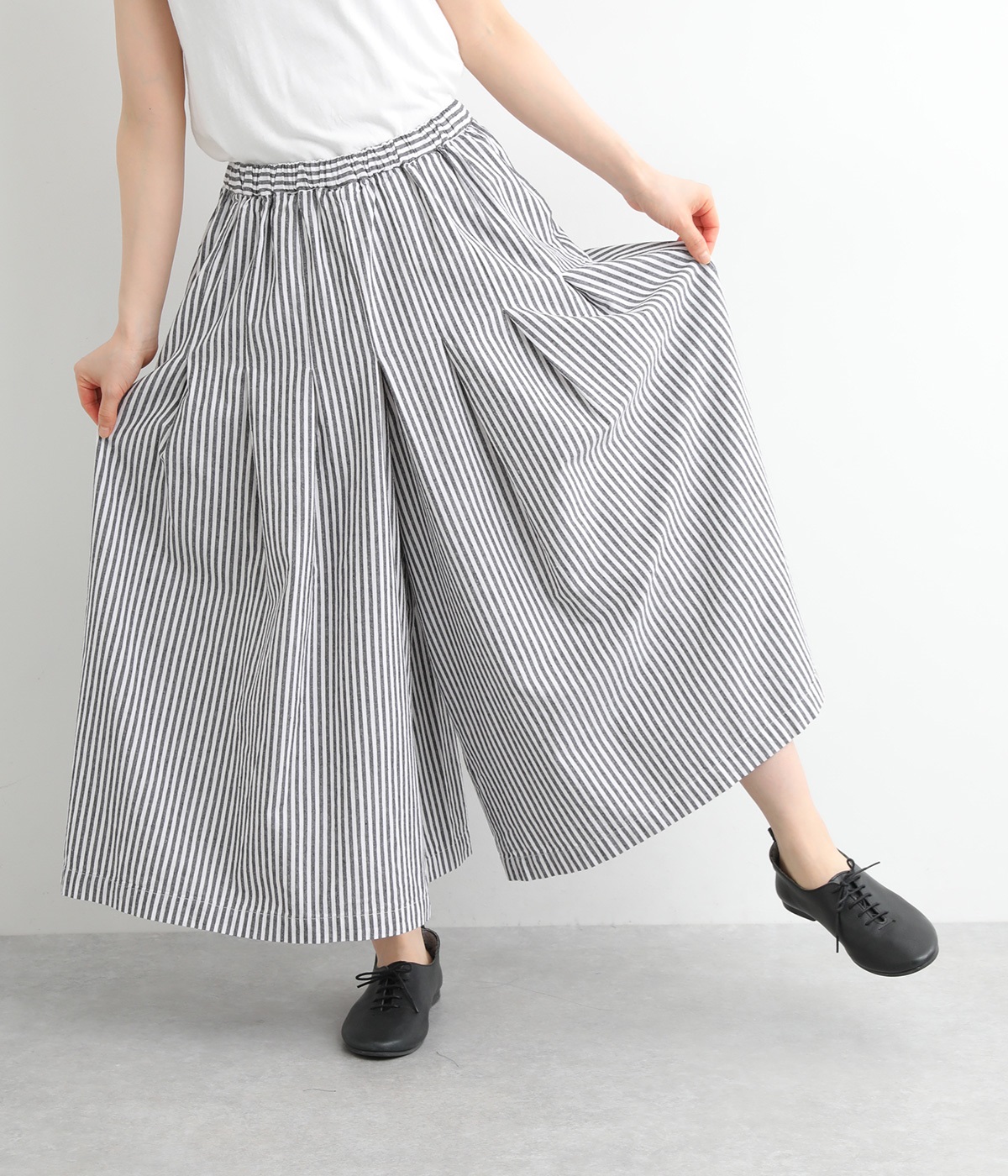 スカート見えするボリューム感のあるフレアシルエットが目を惹きます。タックで腰まわりは広がりをおさえているのですっきりとはきやすいのもグッドポイント。ウエストは総ゴム&内紐でリラックス仕様にしました。