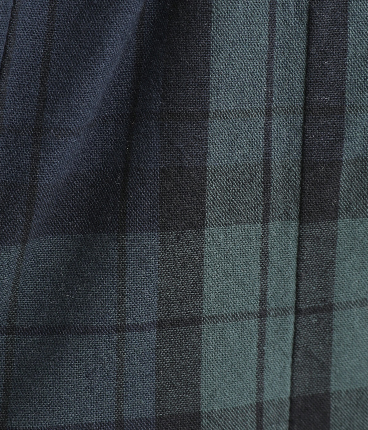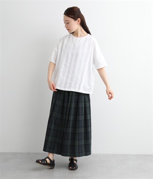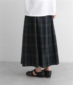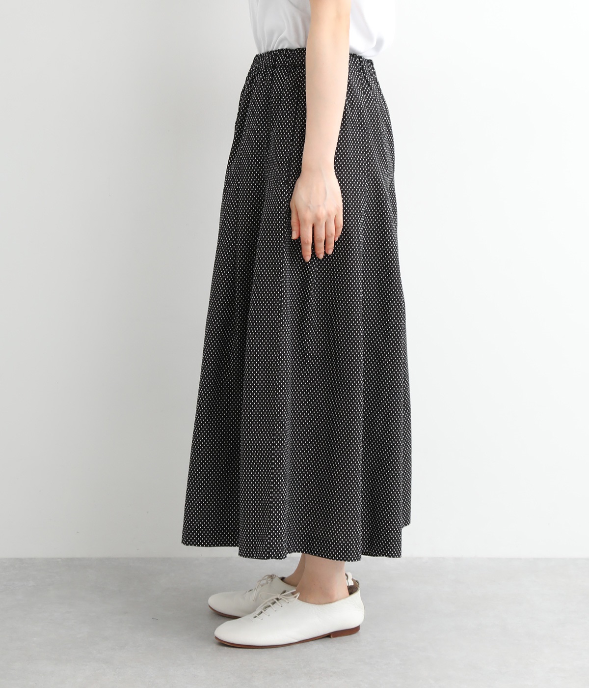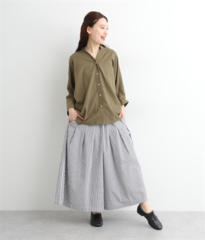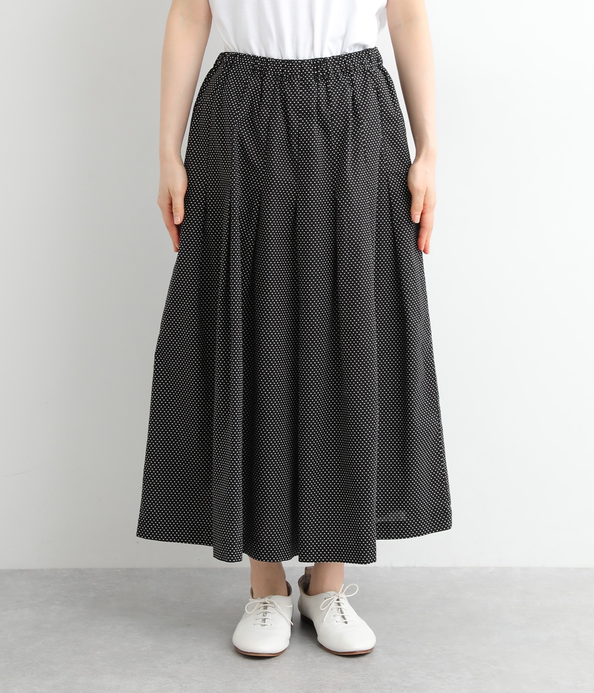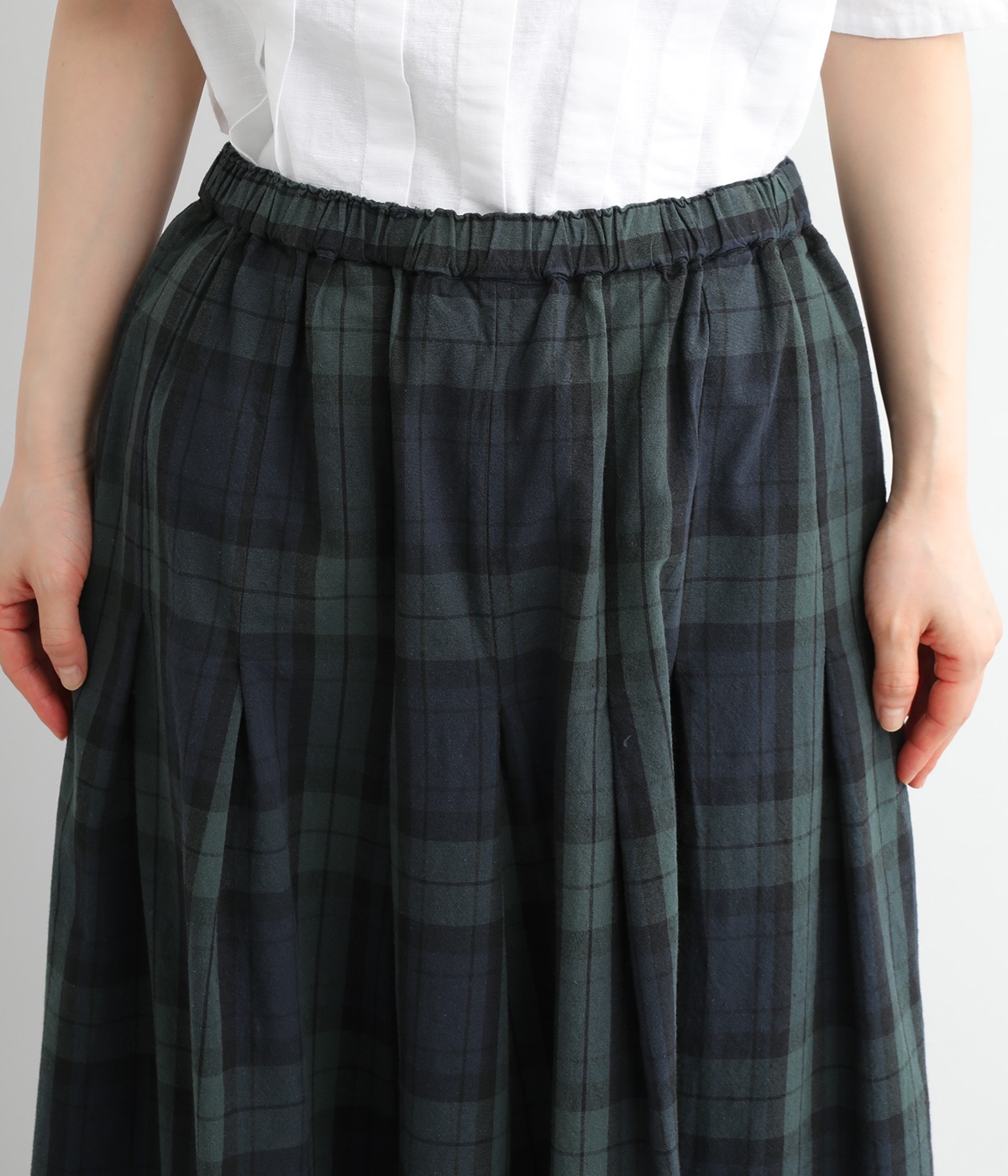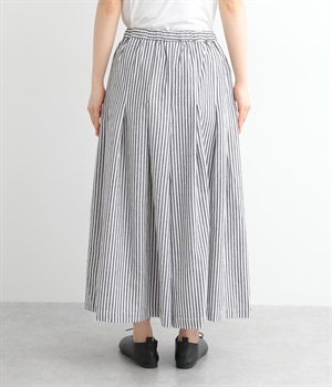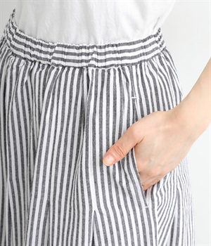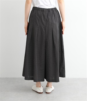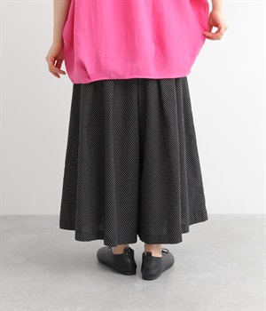 スカート見えするボリューム感のあるフレアシルエットが目を惹きます。タックで腰まわりは広がりをおさえているのですっきりとはきやすいのもグッドポイント。ウエストは総ゴム&内紐でリラックス仕様にしました。
