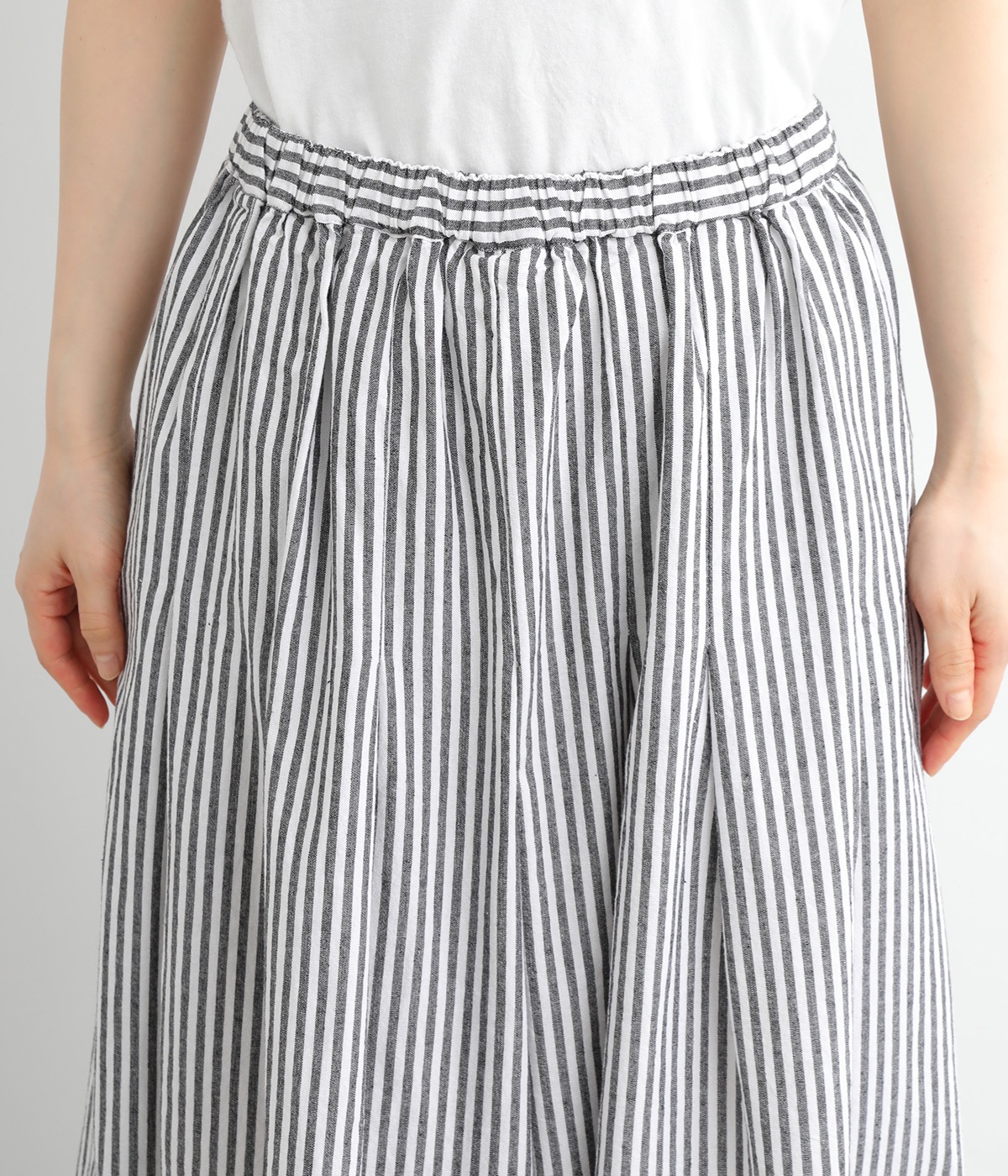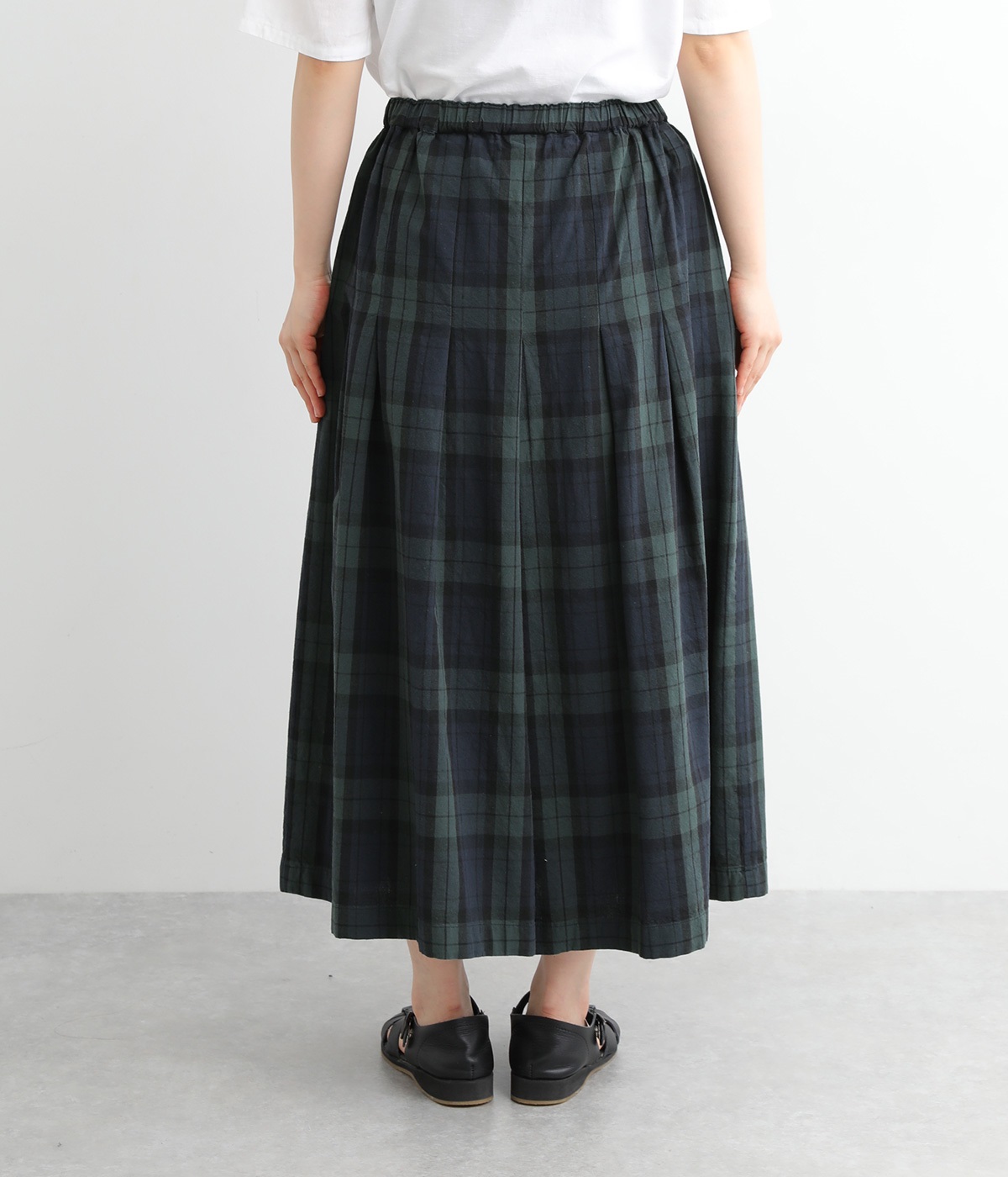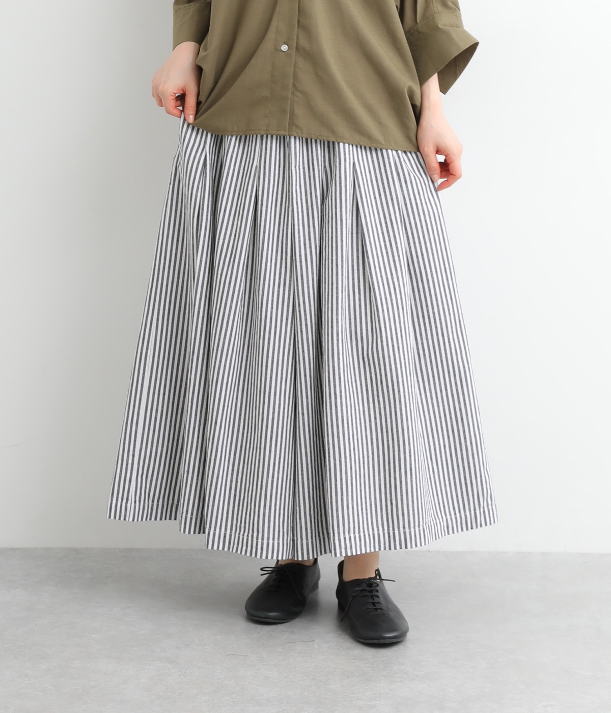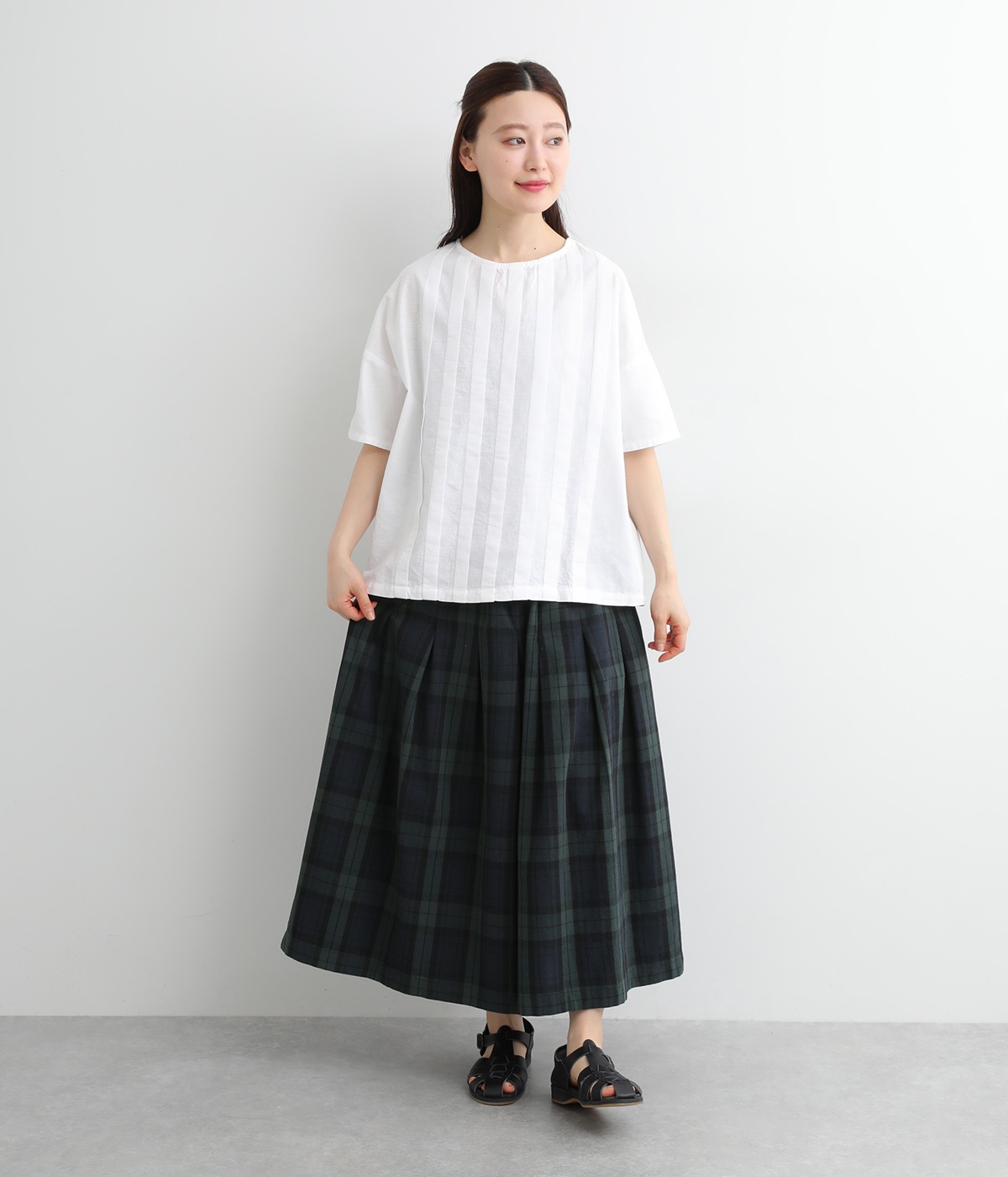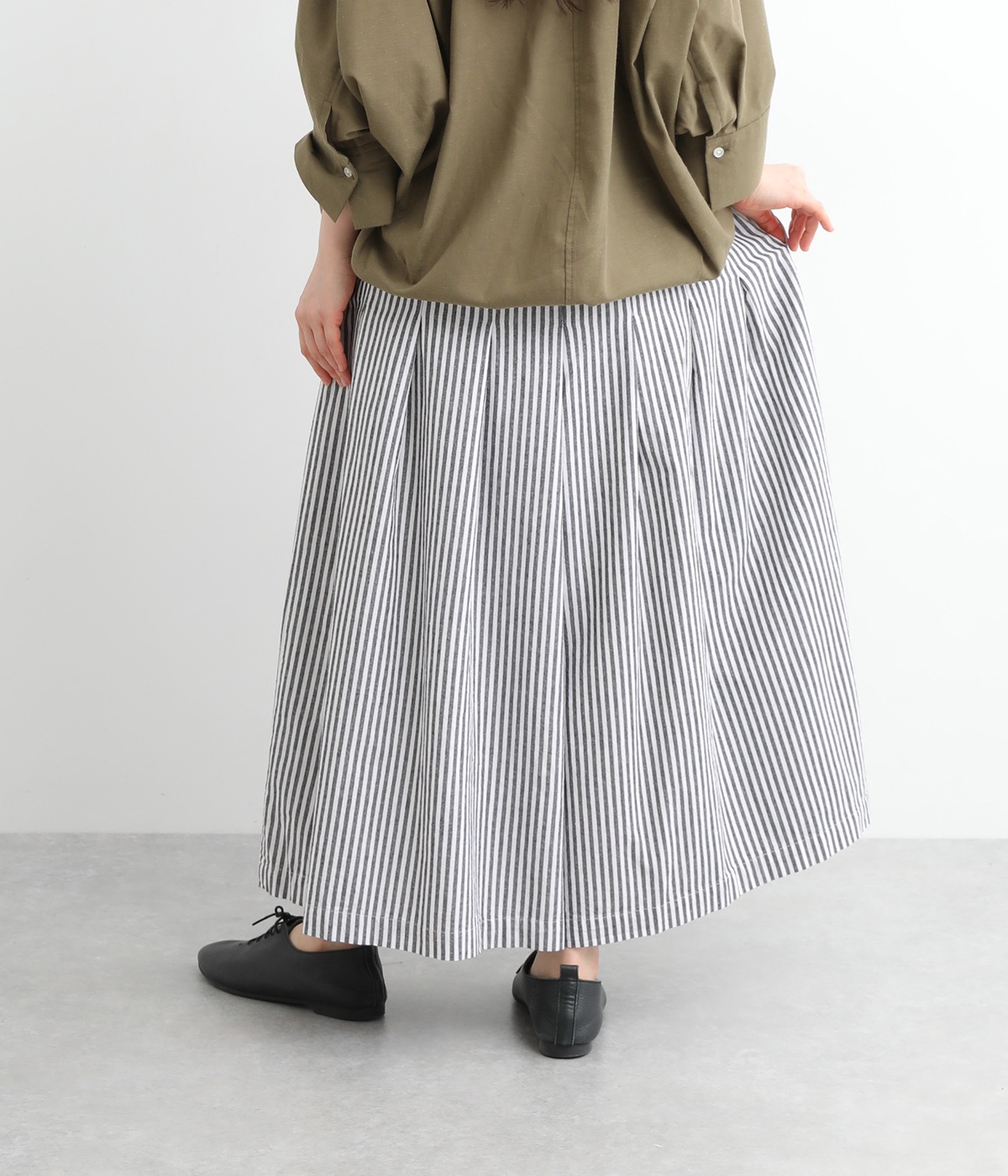 スカート見えするボリューム感のあるフレアシルエットが目を惹きます。タックで腰まわりは広がりをおさえているのですっきりとはきやすいのもグッドポイント。ウエストは総ゴム&内紐でリラックス仕様にしました。
