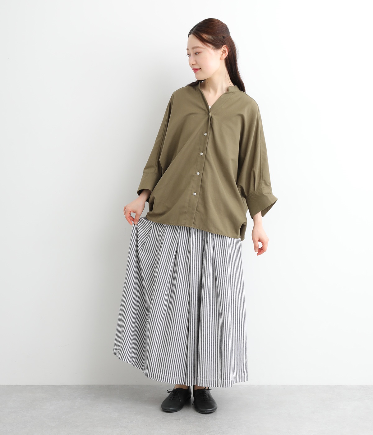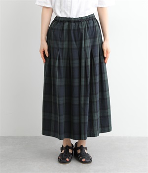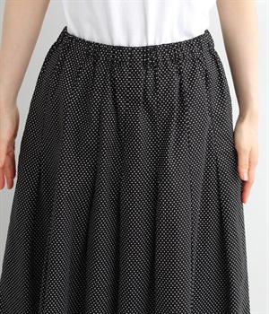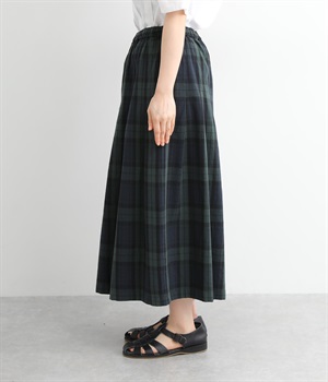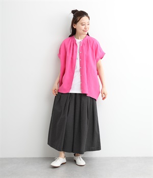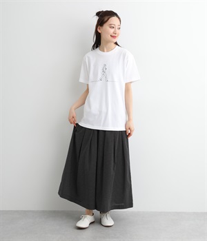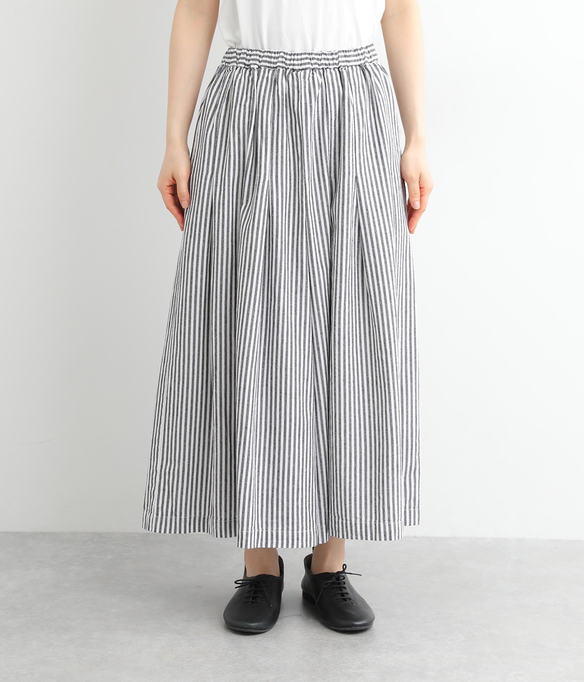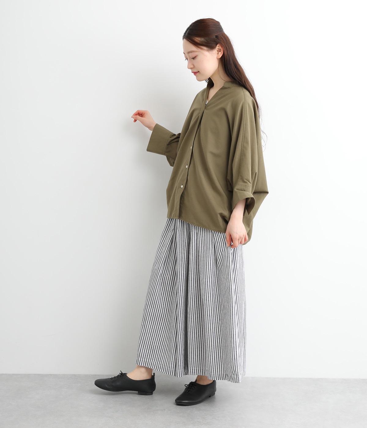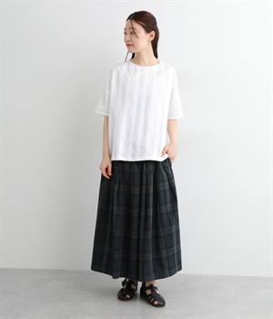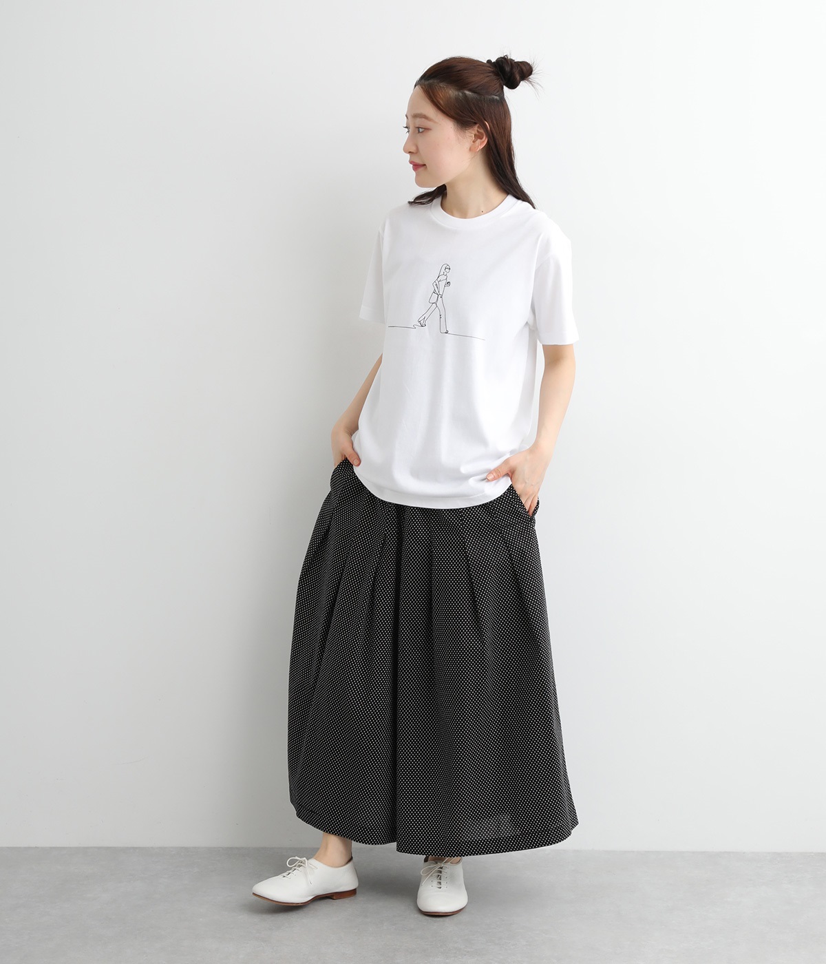 スカート見えするボリューム感のあるフレアシルエットが目を惹きます。タックで腰まわりは広がりをおさえているのですっきりとはきやすいのもグッドポイント。ウエストは総ゴム&内紐でリラックス仕様にしました。