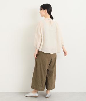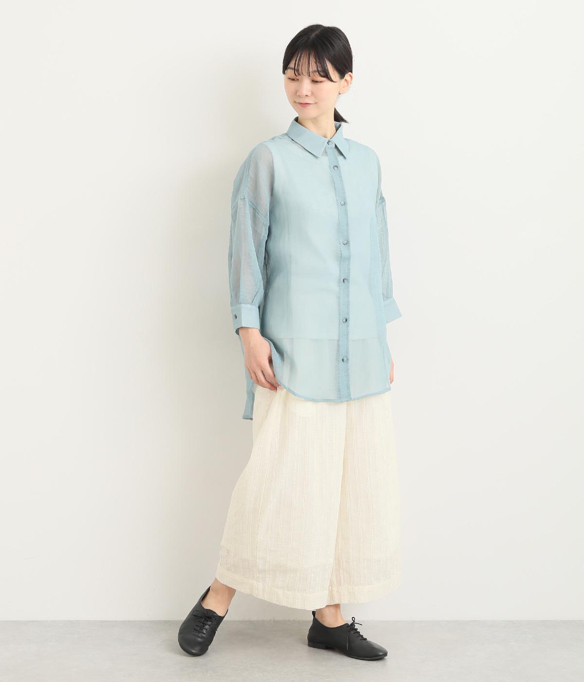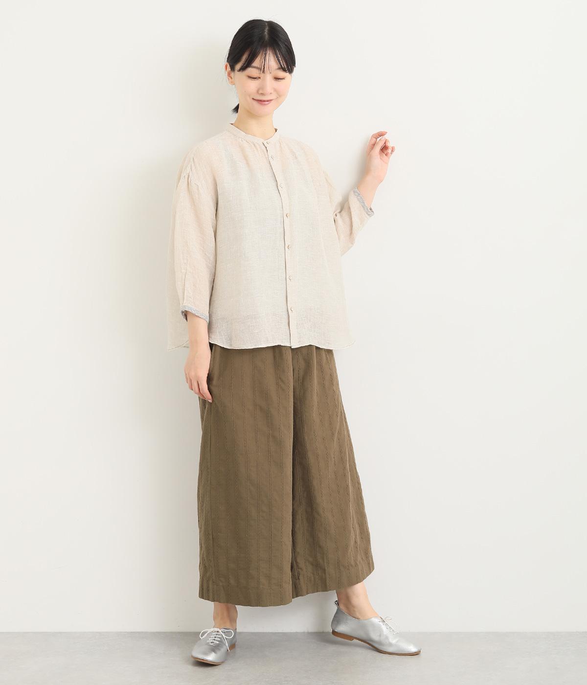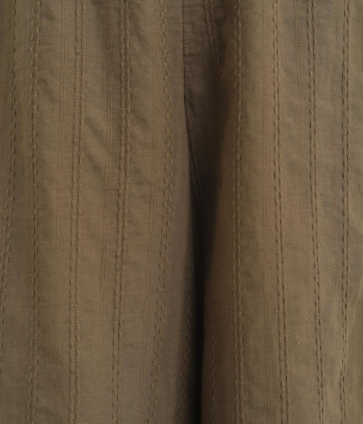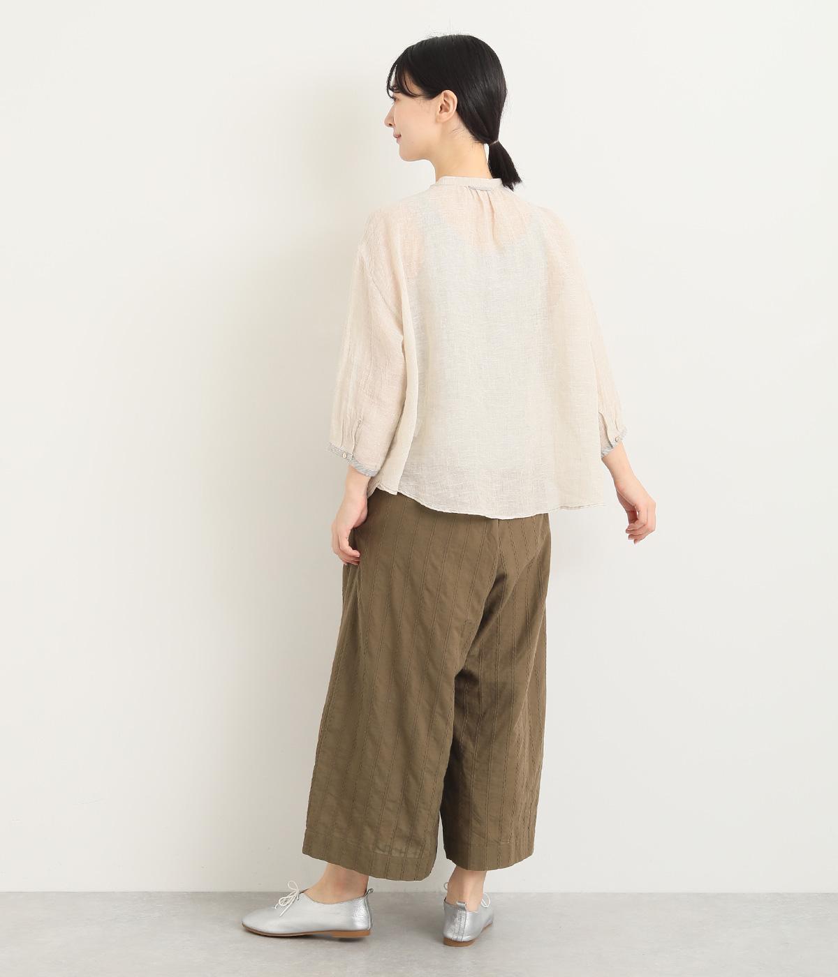 軽くやわらかなコットンガーゼ素材を用いた、ストライプステッチが特徴的なドビー生地を使用しています。薄手で通気性も良く、綿混の裏地で透け感をおさえました。