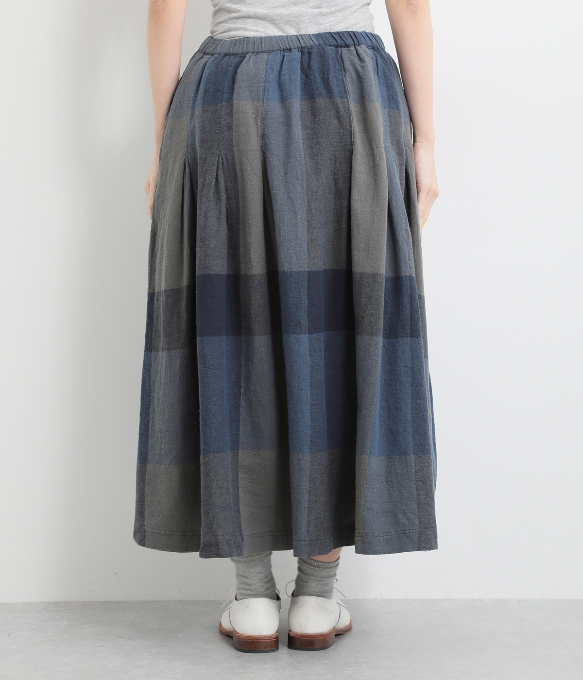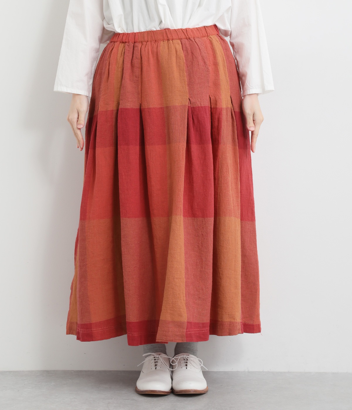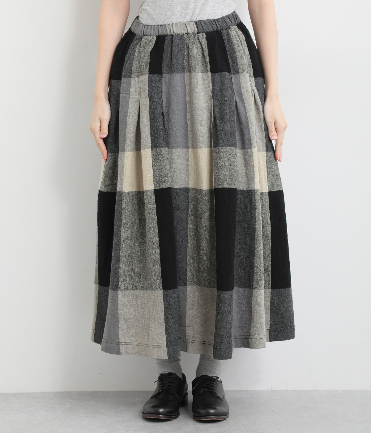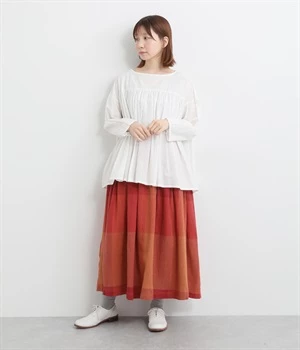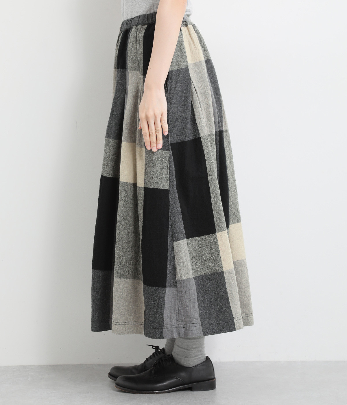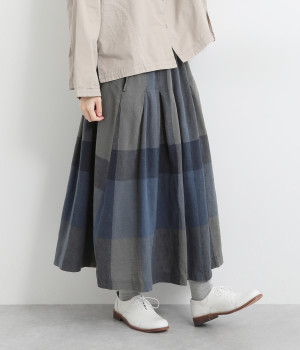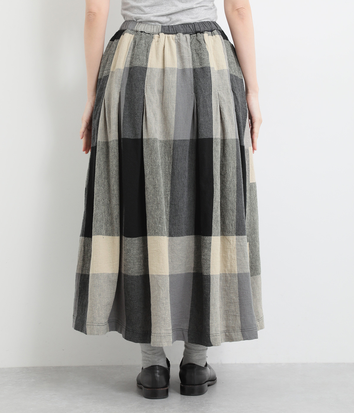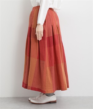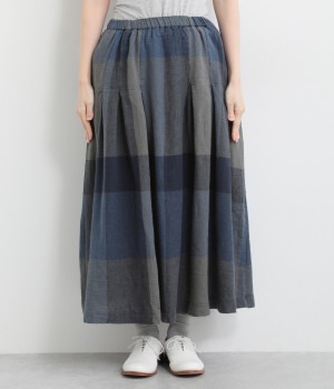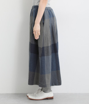 チェック生地を存分に活かした、分量のあるフレアスカートです。足首がのぞく丈感で重たく見えず、デイリー使いしやすい仕立てになっています。ウエストは総ゴムでストレスなくはけて、内紐でフィット感を調整できます。