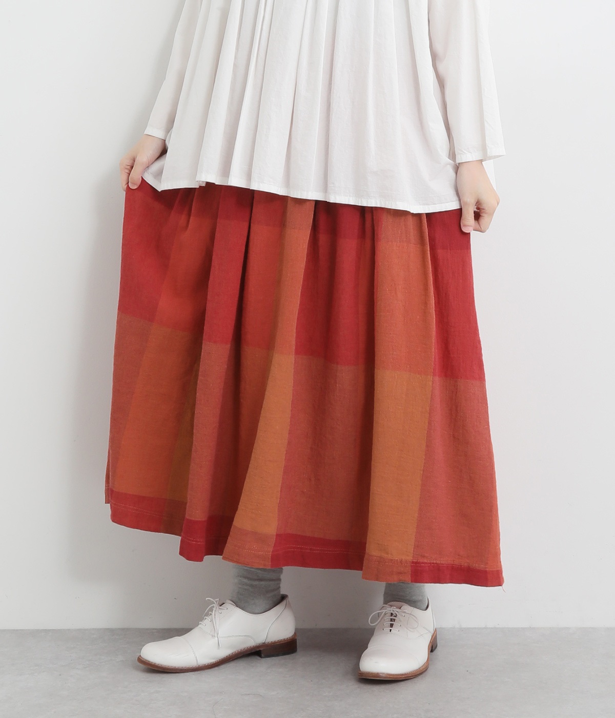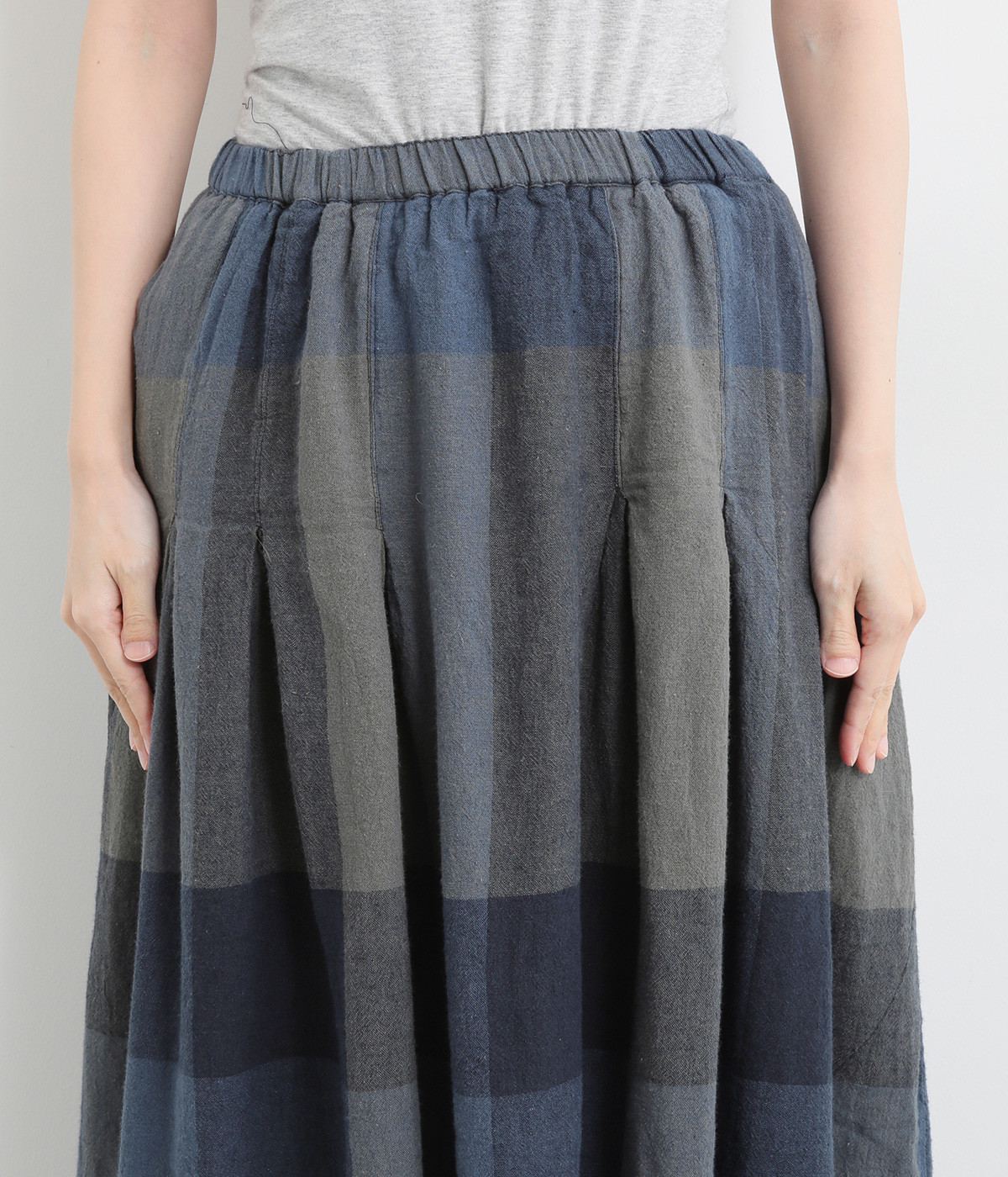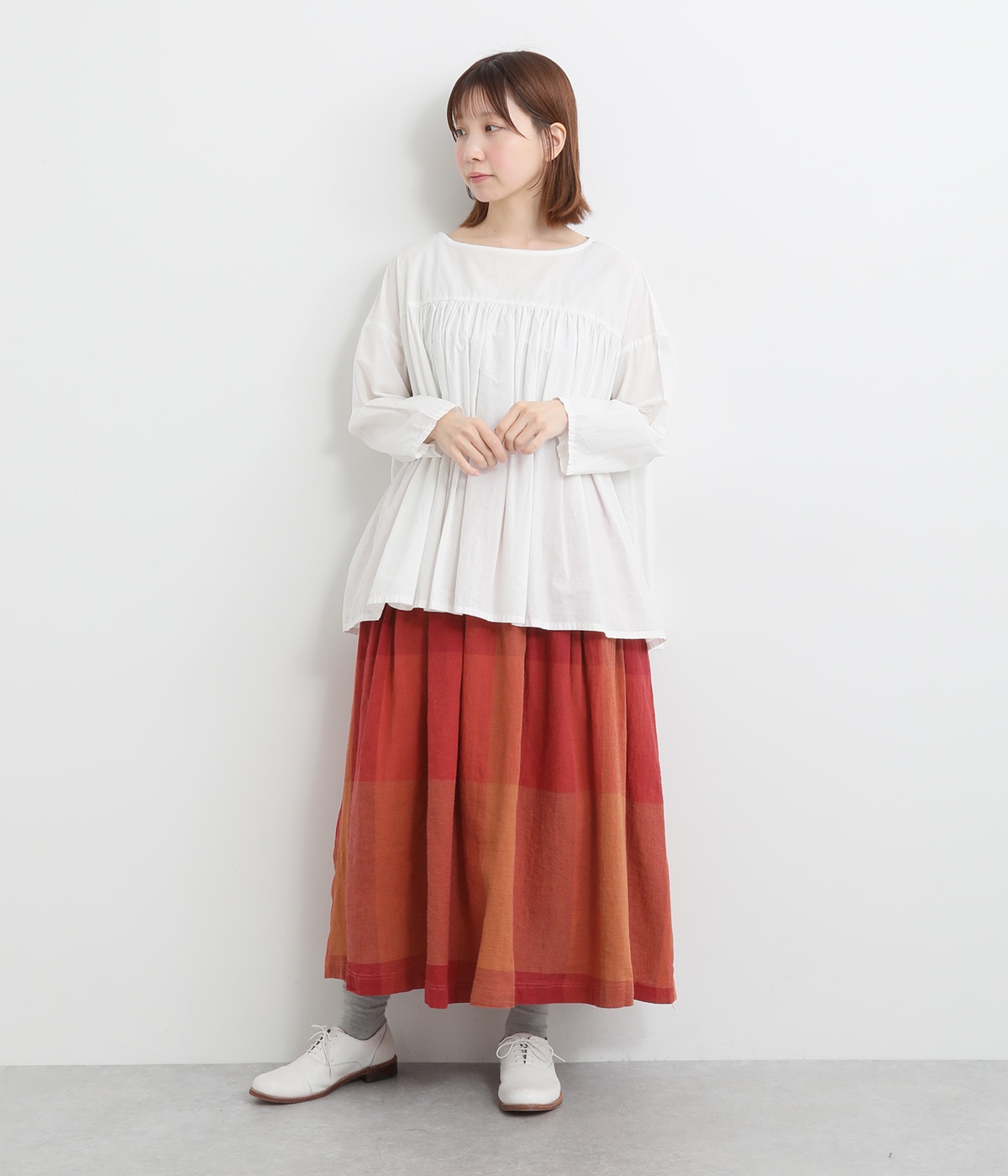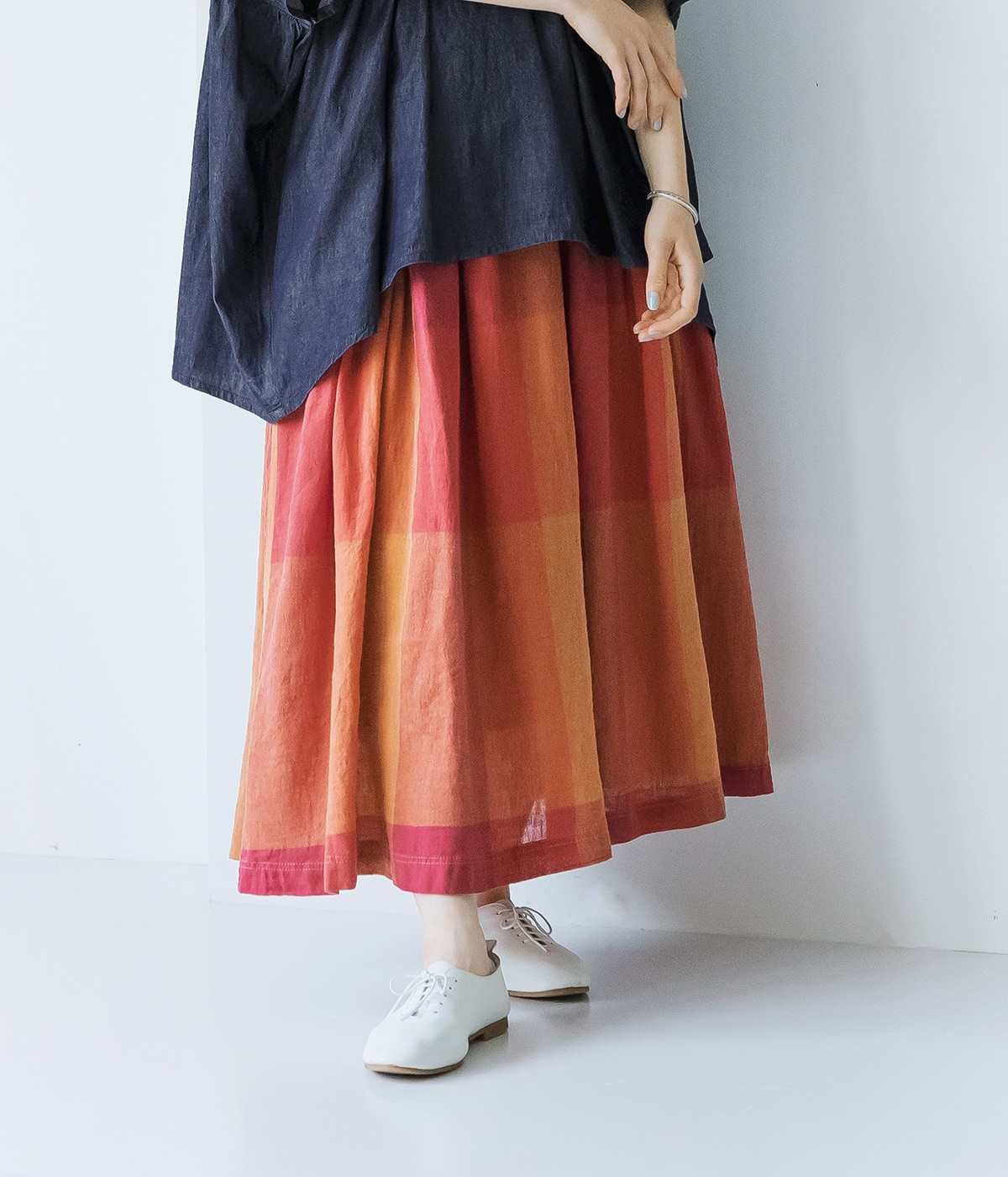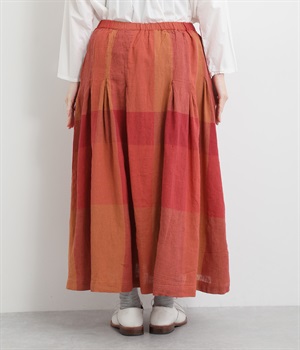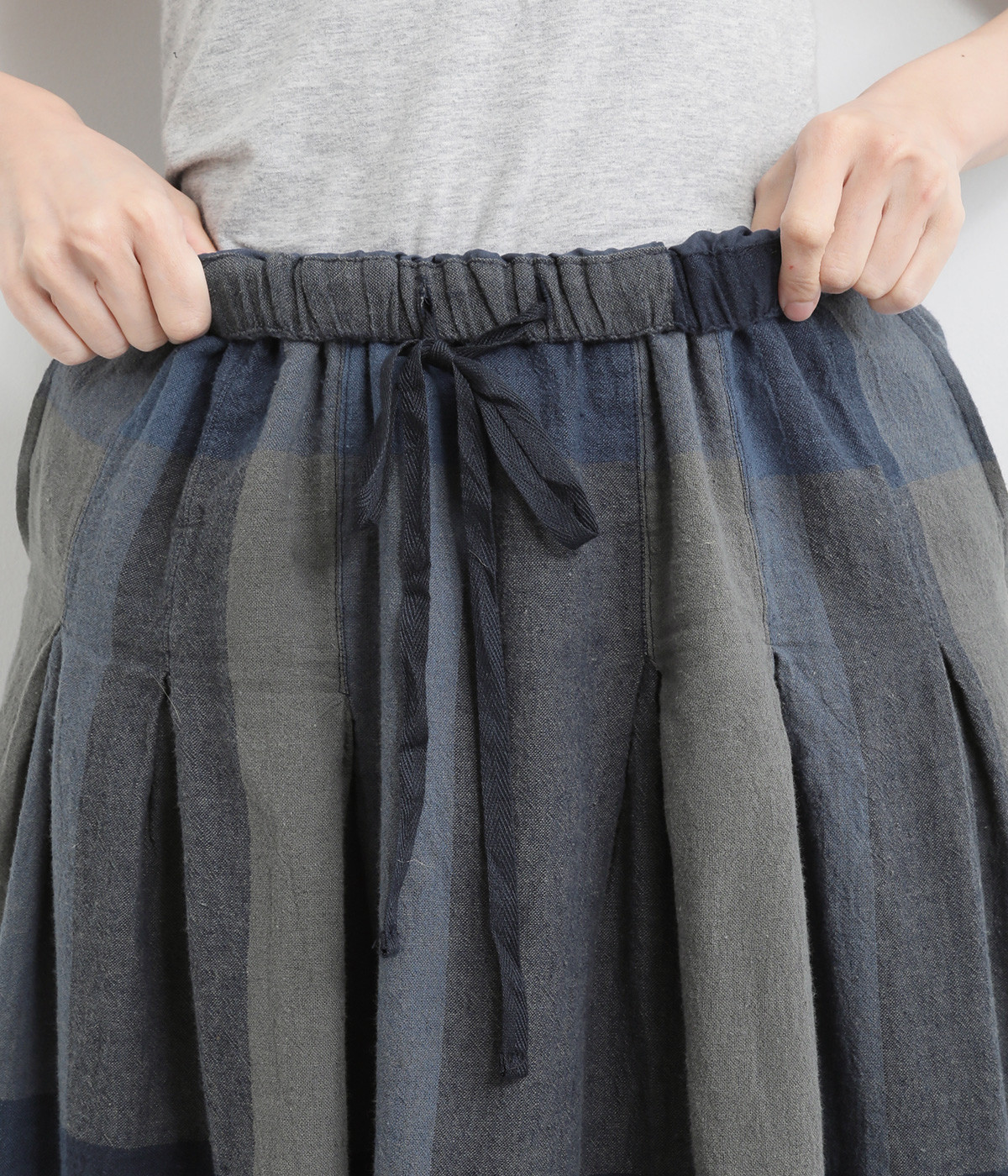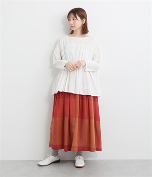 チェック生地を存分に活かした、分量のあるフレアスカートです。足首がのぞく丈感で重たく見えず、デイリー使いしやすい仕立てになっています。ウエストは総ゴムでストレスなくはけて、内紐でフィット感を調整できます。