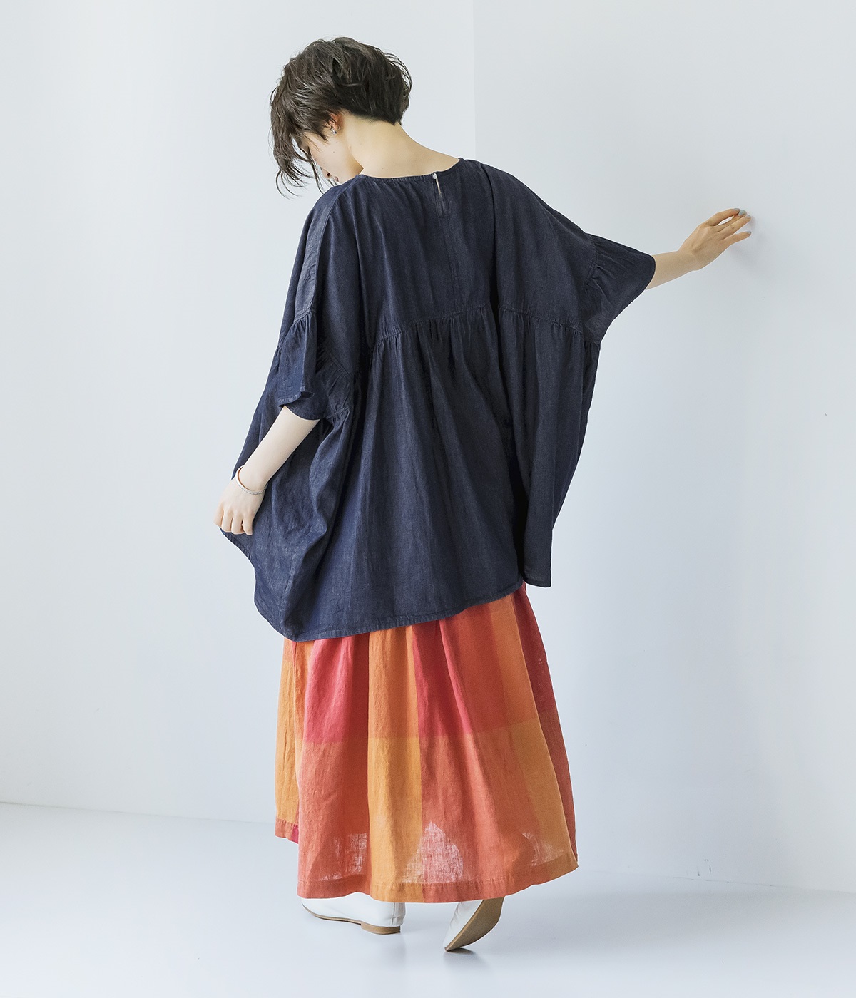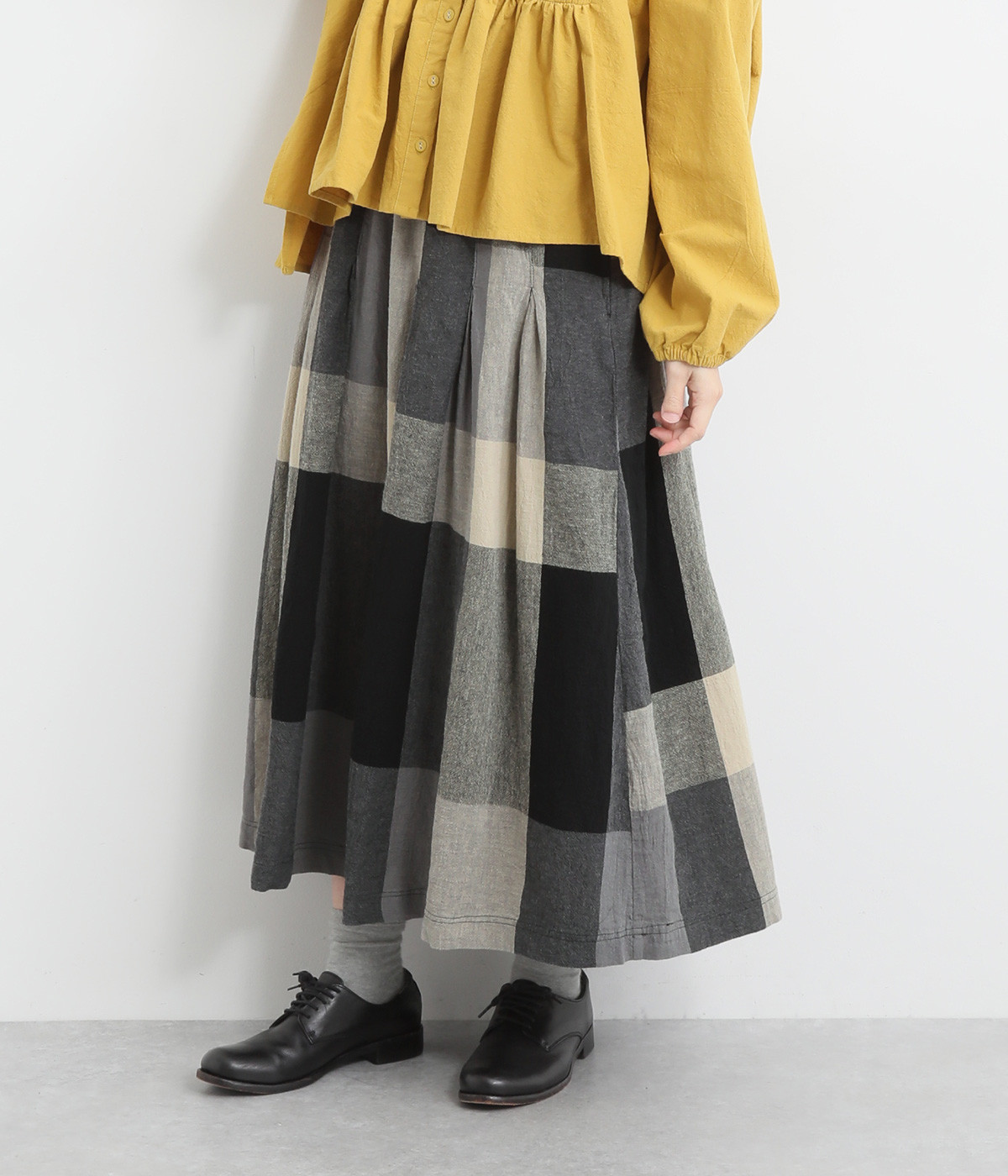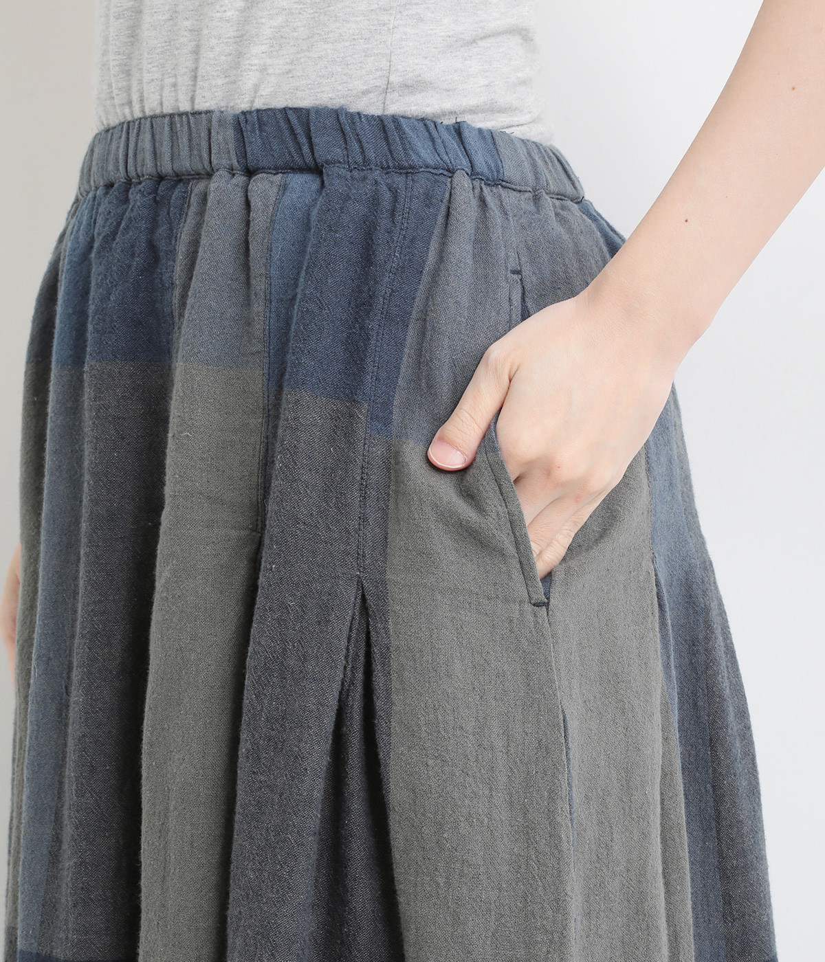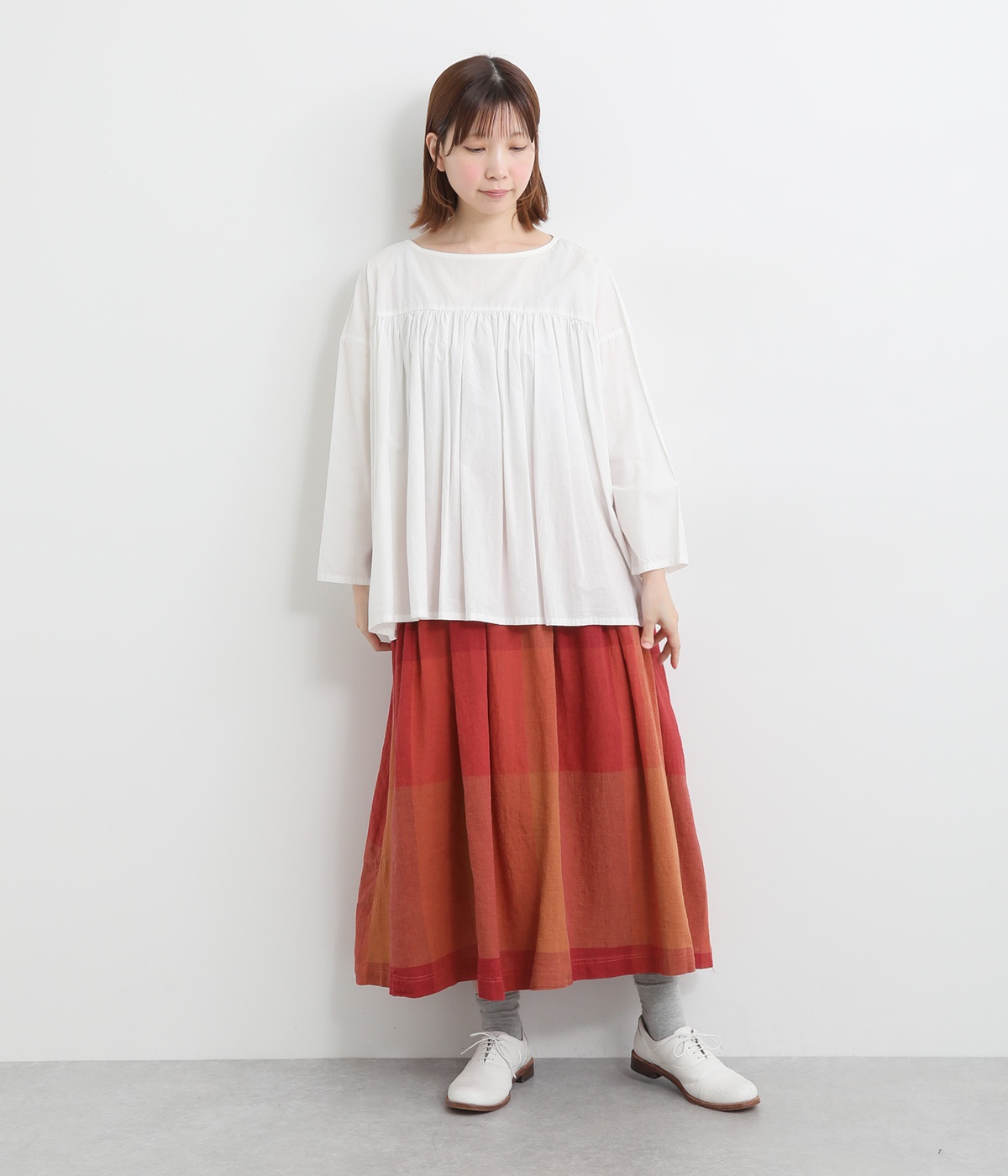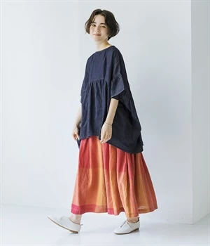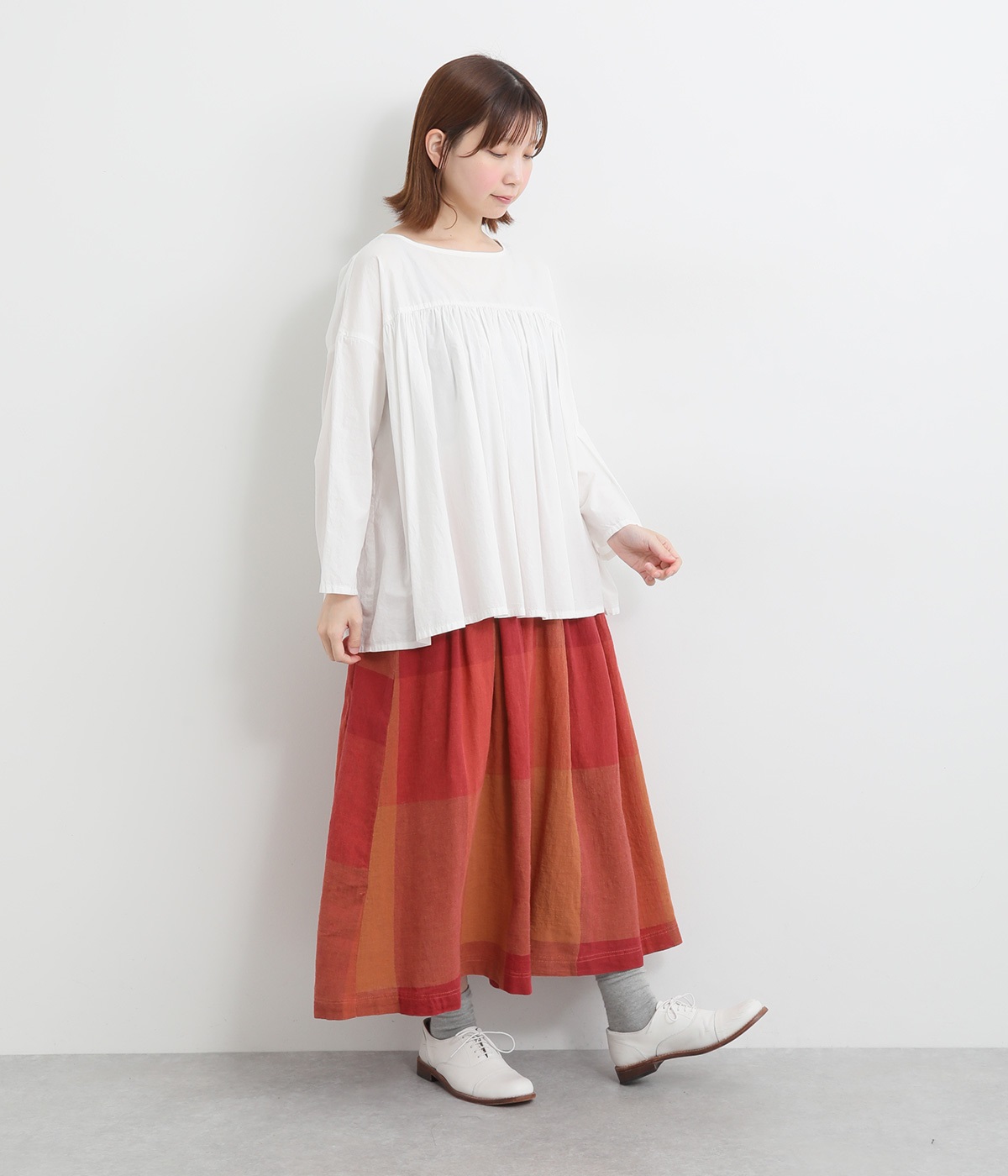 チェック生地を存分に活かした、分量のあるフレアスカートです。足首がのぞく丈感で重たく見えず、デイリー使いしやすい仕立てになっています。ウエストは総ゴムでストレスなくはけて、内紐でフィット感を調整できます。