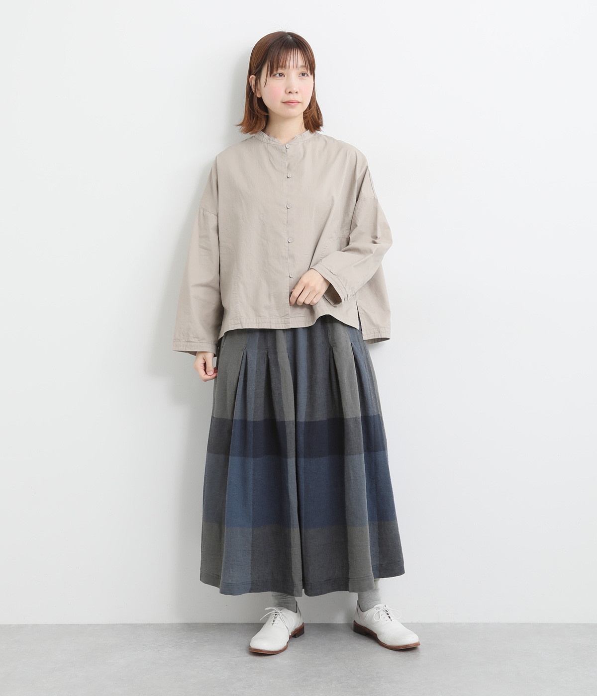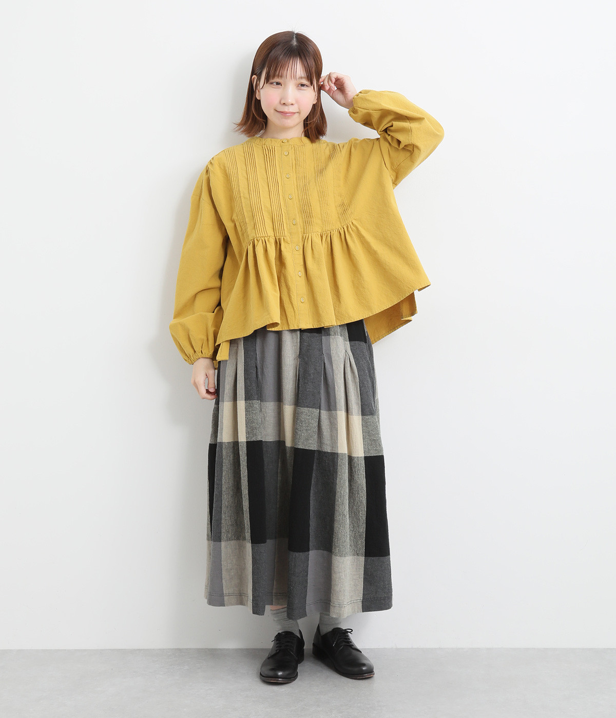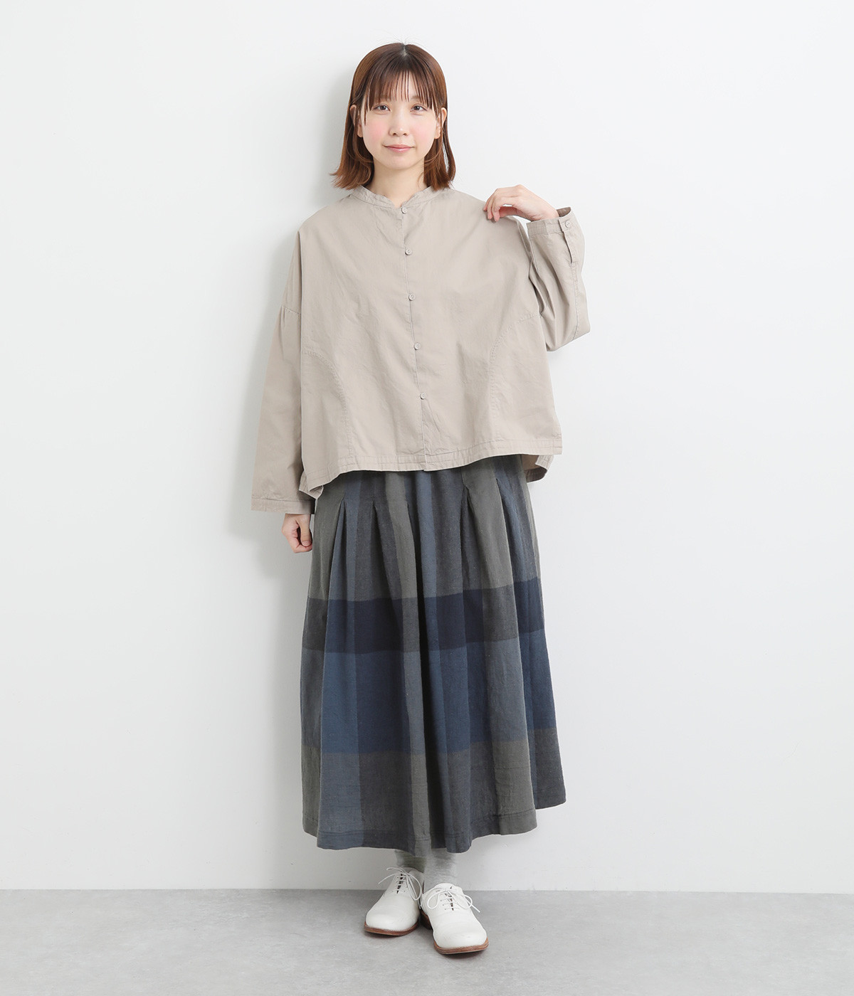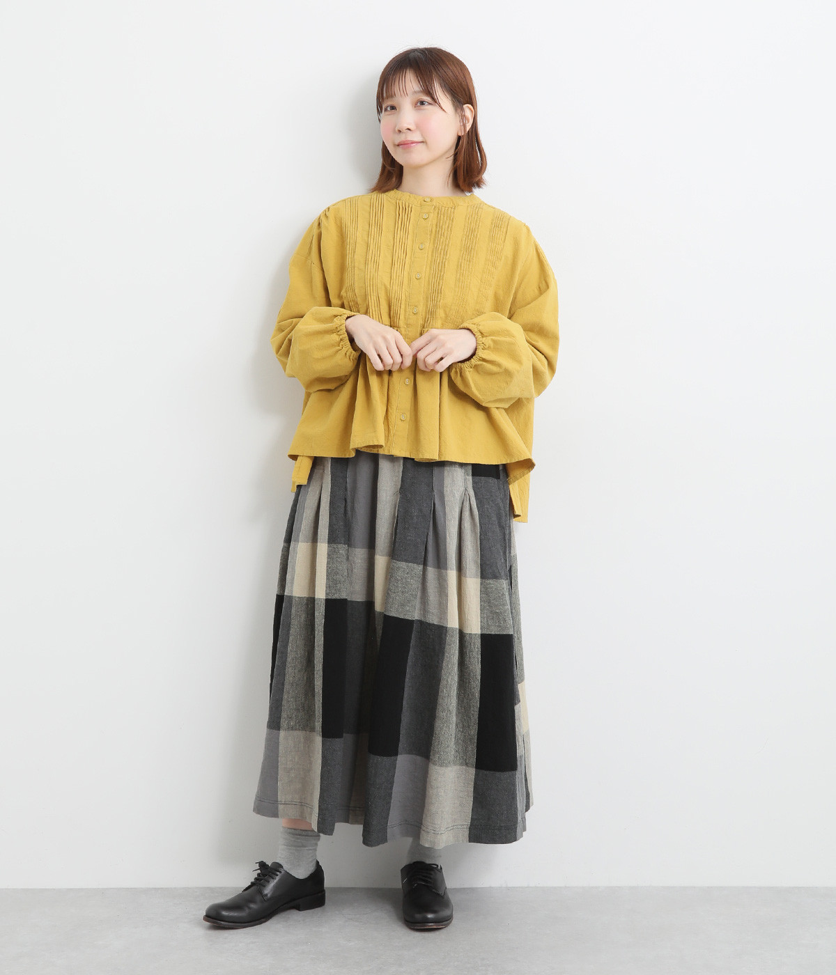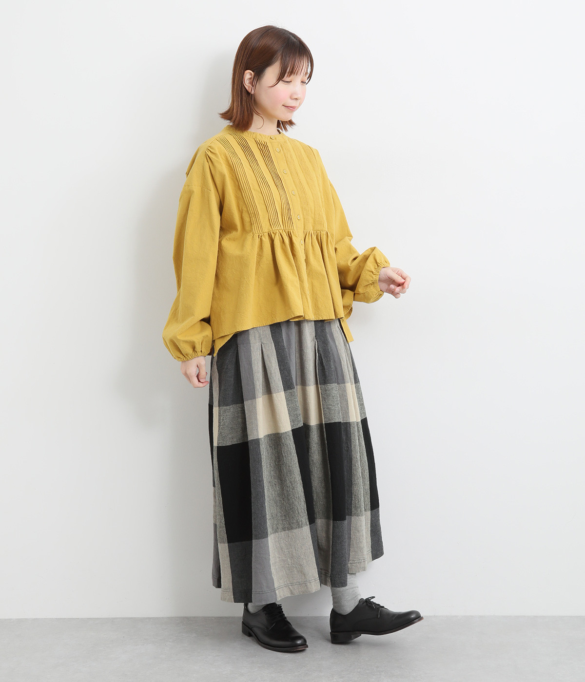 チェック生地を存分に活かした、分量のあるフレアスカートです。足首がのぞく丈感で重たく見えず、デイリー使いしやすい仕立てになっています。ウエストは総ゴムでストレスなくはけて、内紐でフィット感を調整できます。