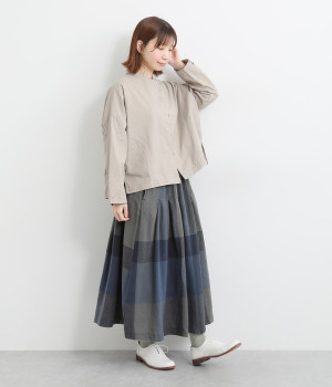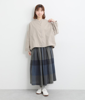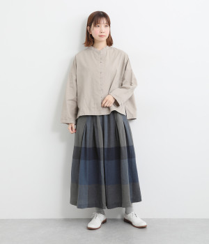 着こなしのポイントになりながらも大人スタイルになじみやすい、シックなビッグチェック柄がポイント。綿麻生地仕立てでナチュラルテイストに落とし込んでいます。同色系の裏地つきです。