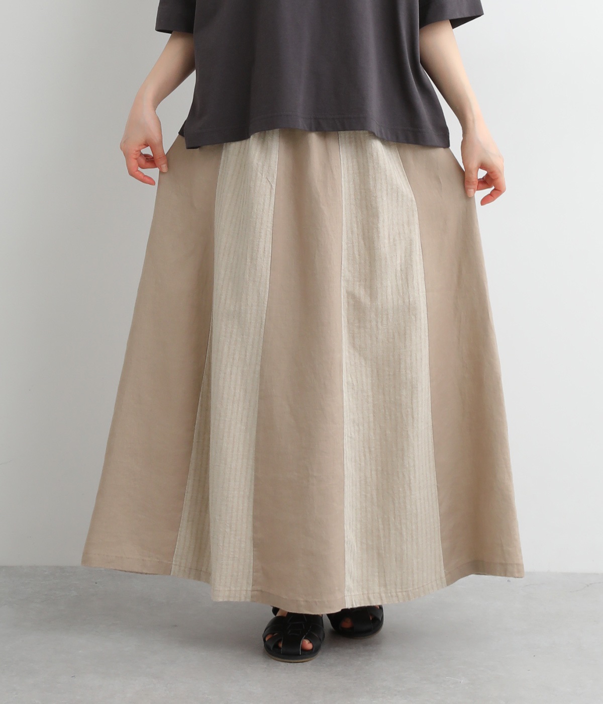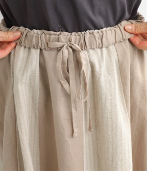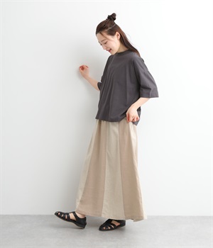 大きい切り替え配色で着映え力を高めつつも、同色系でシックにまとめたフレアスカートです。ナチュラルだけどどこかモダンで凛とした表情が魅力的。ウエストはリラックス感のある総ゴムに内紐入りです。