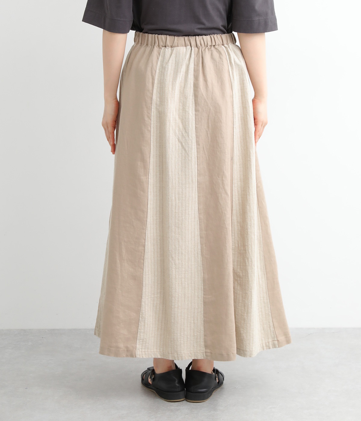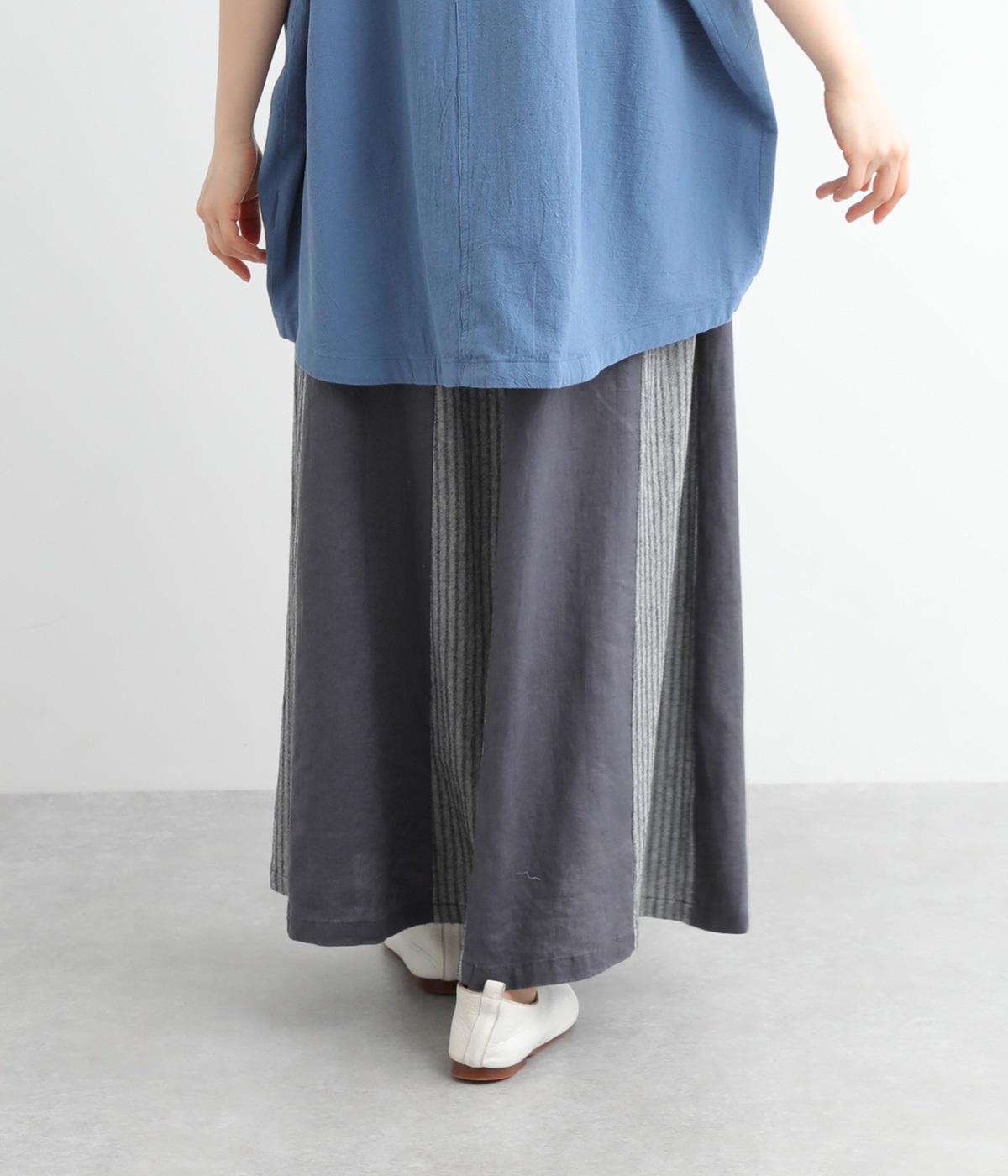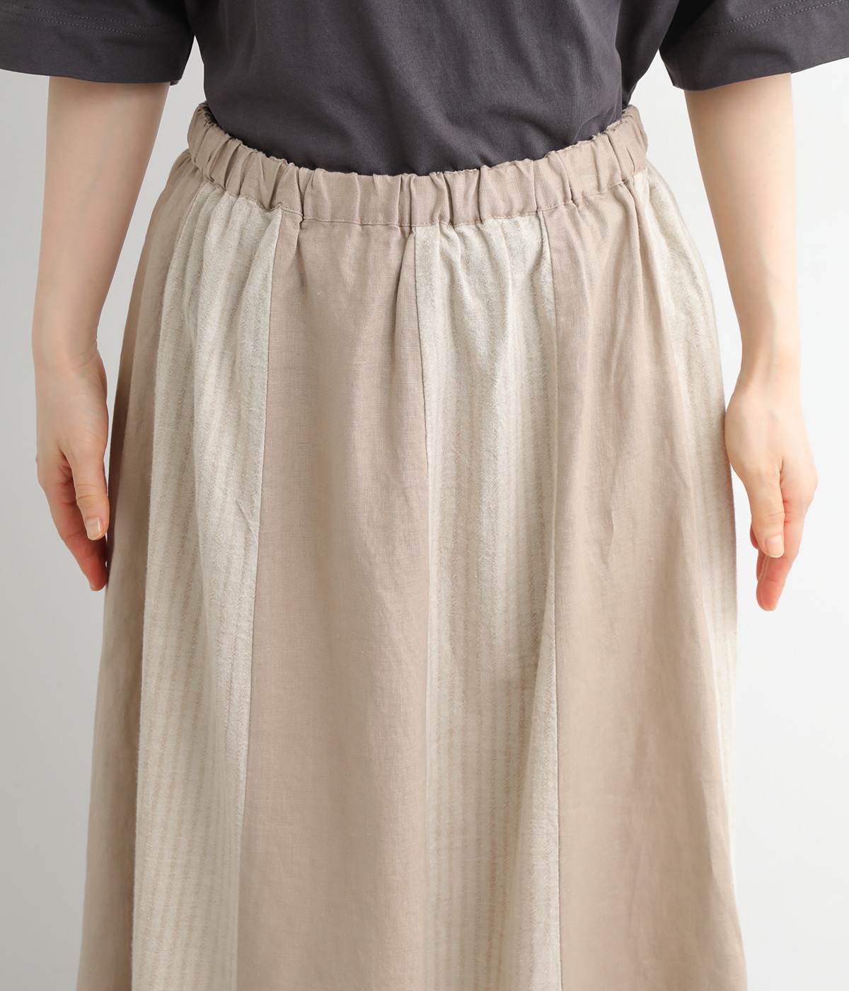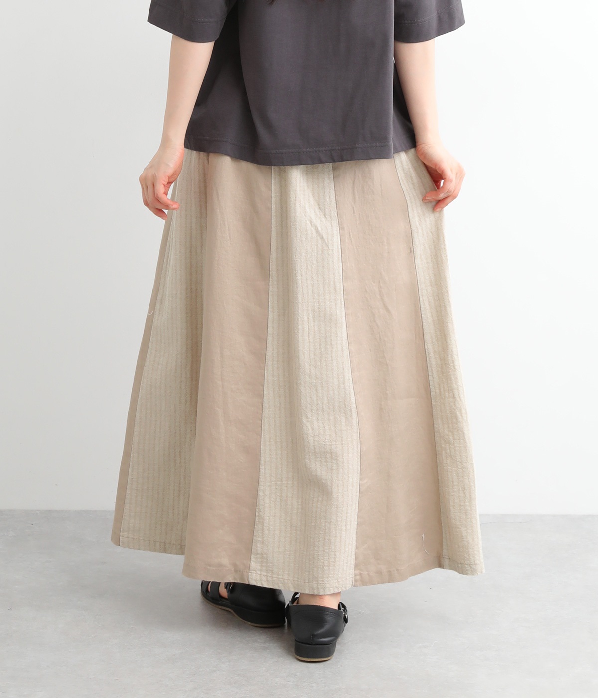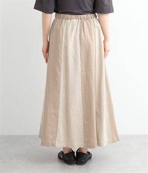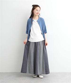 無地部分がリネン、ストライプ柄部分がコットンの異素材を組み合わせました。表情だけでなく素材感にも変化をつけながらも、ナチュラルで心地よくまとまっています。