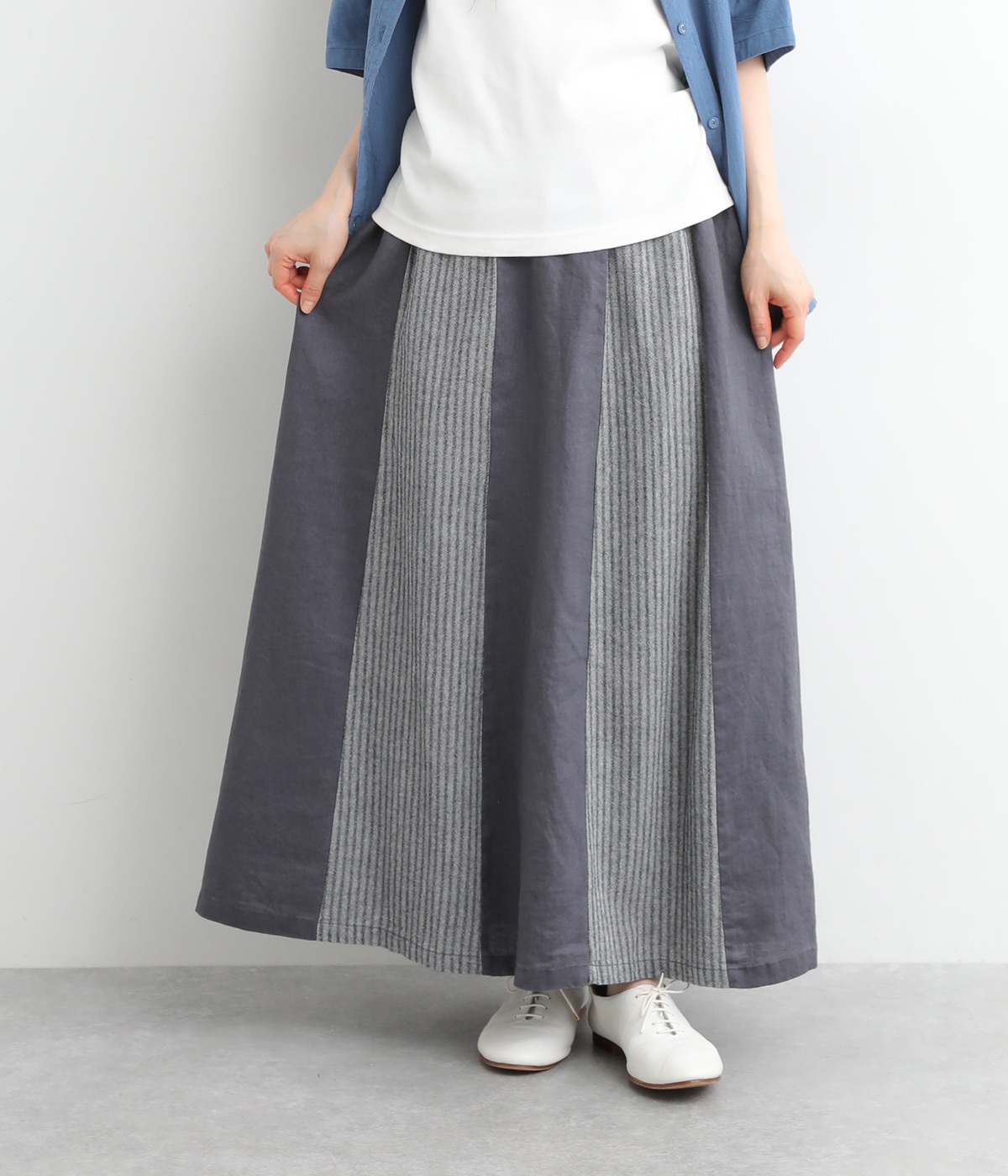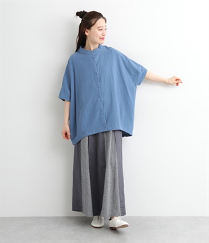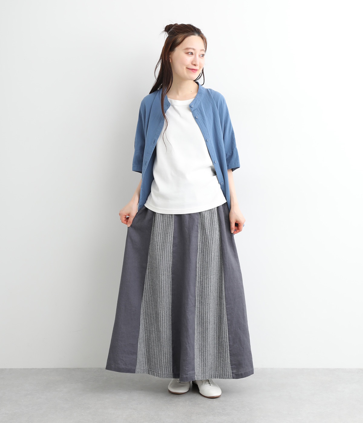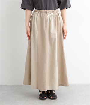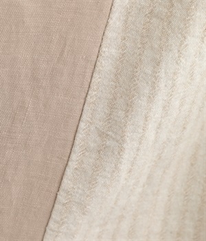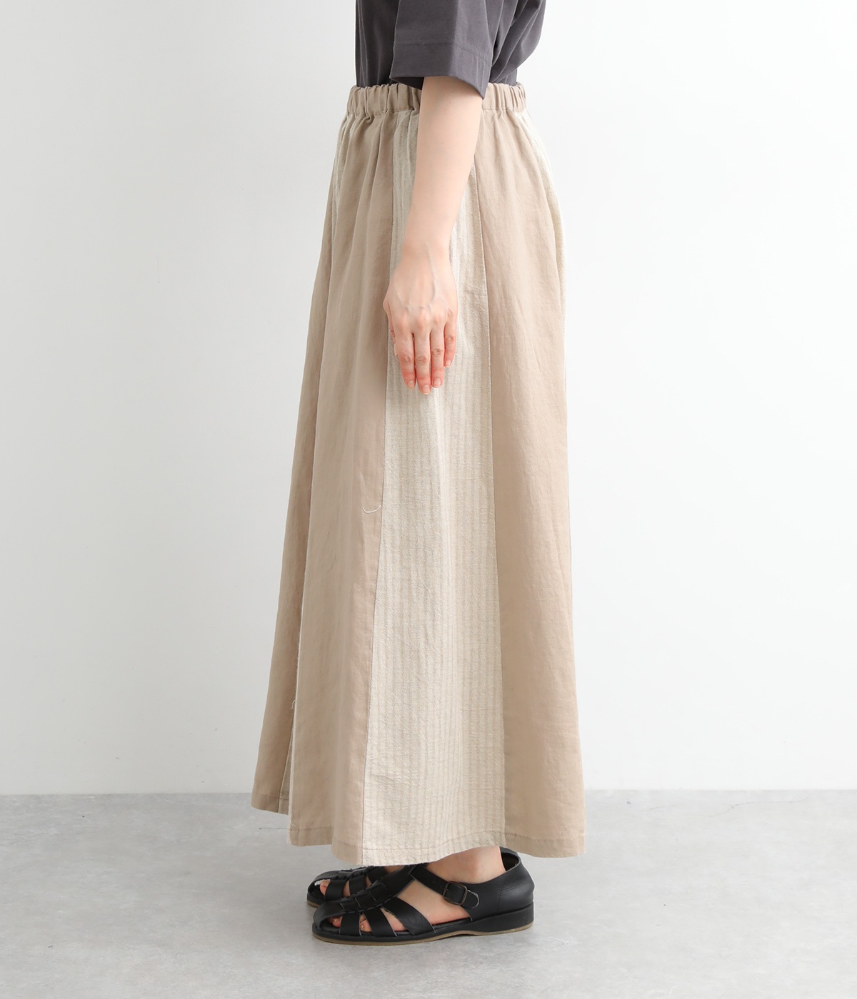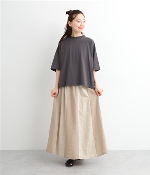 無地部分がリネン、ストライプ柄部分がコットンの異素材を組み合わせました。表情だけでなく素材感にも変化をつけながらも、ナチュラルで心地よくまとまっています。