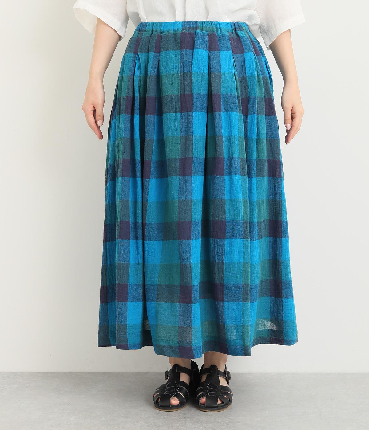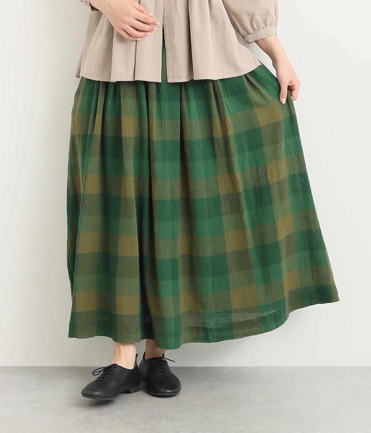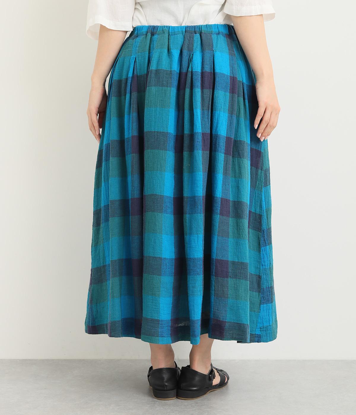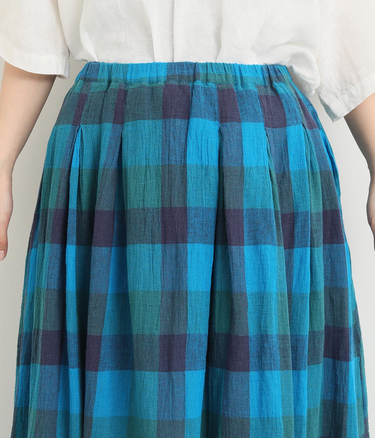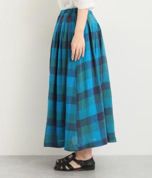 スタイリングを華やかに魅せてくれるチェック柄を活かした、ベーシックなフレアスカートです。タックを入れて腰まわりは広がりをおさえつつ、自然なドレープの出る分量感が目を惹きます。ウエストは総ゴム+内紐でイージーに仕上げました。