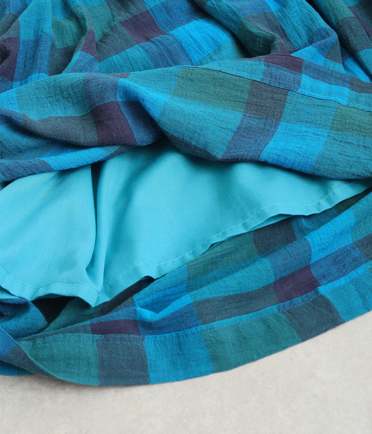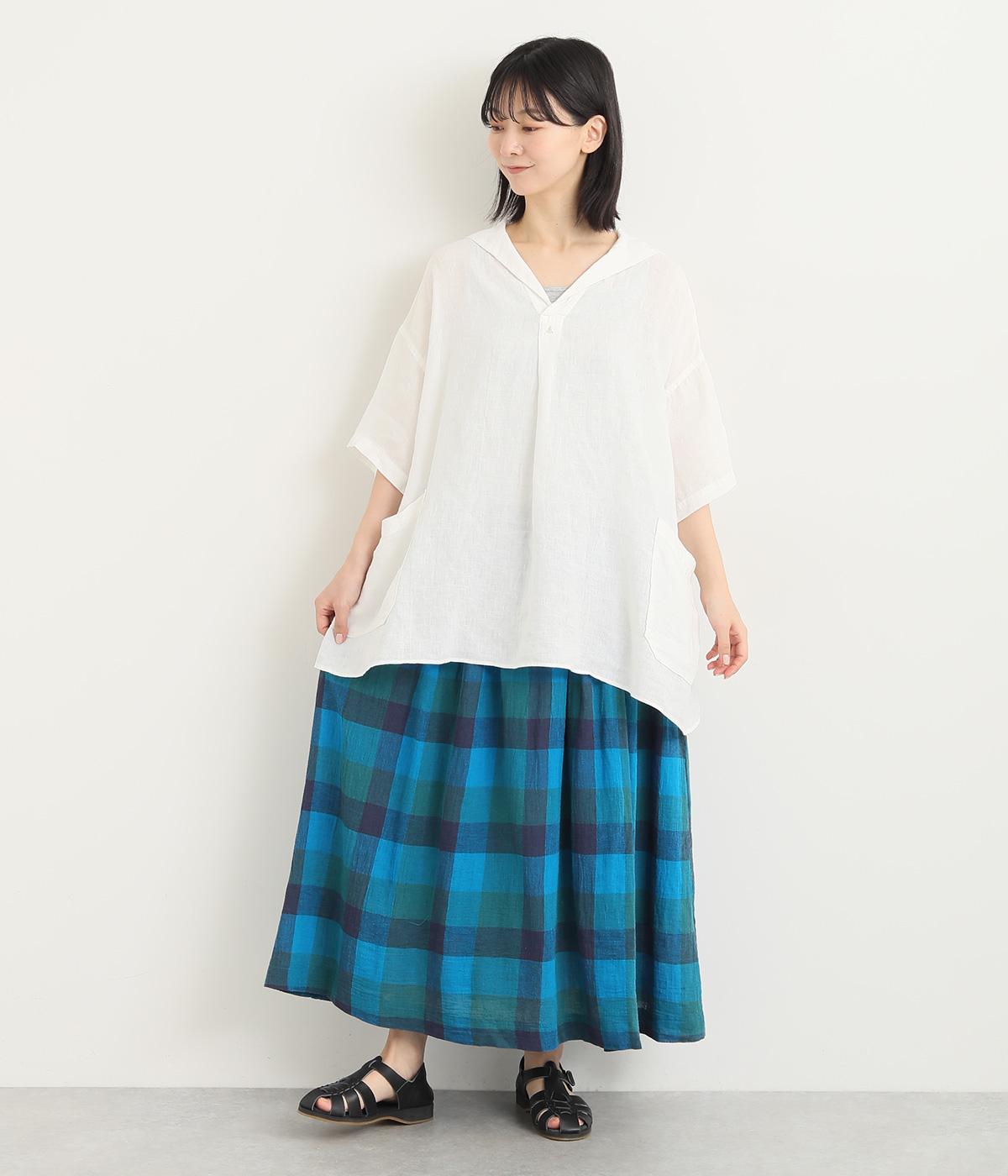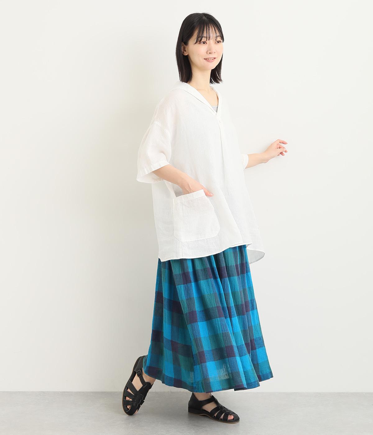 自然なシボ感やドライタッチが心地よいリネンコットンを使用しています。鮮やかなブロックチェック柄が印象的ながら、ナチュラル素材で取り入れやすい仕上がりです。綿混の裏地で透け感をおさえました。