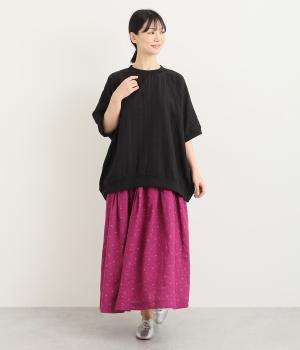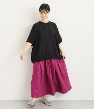 タックでボリュームを出し、ハリのある素材で立体的なドレープ感を惹き出しました。腰まわりは広がりをおさえているので、トップスアウトもすっきりと合わせられます。ウエストは総ゴムに内紐入りで、フィット感や腰位置も調整可能に。