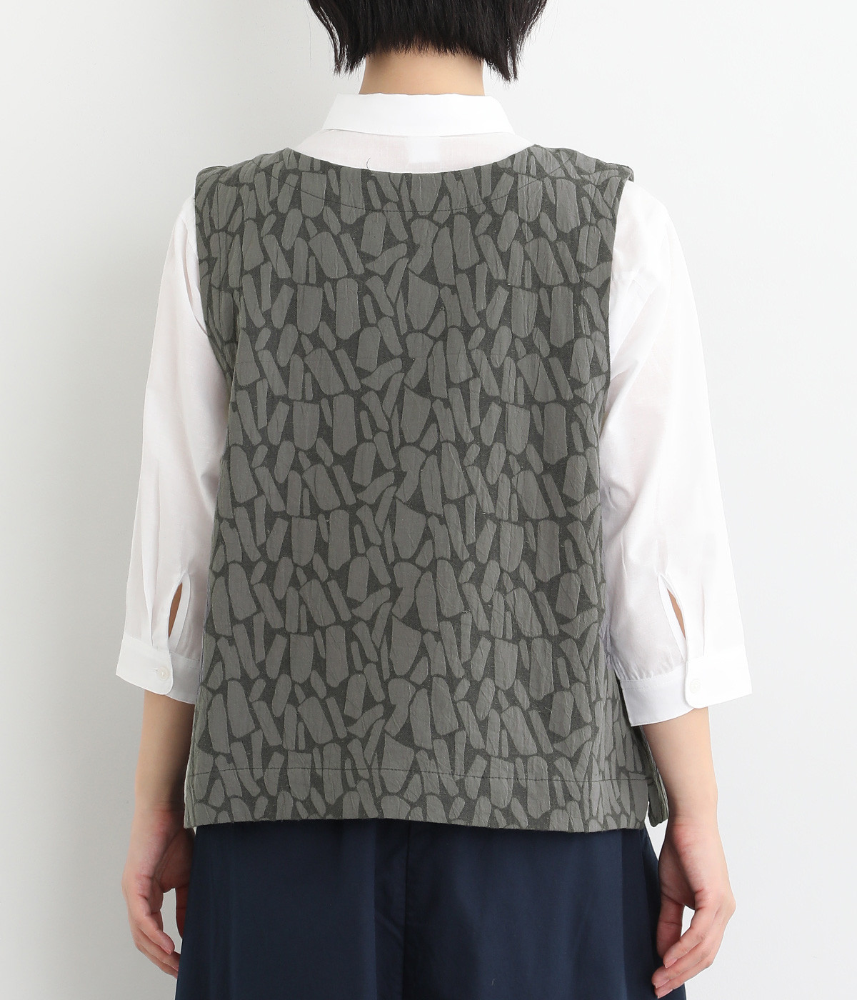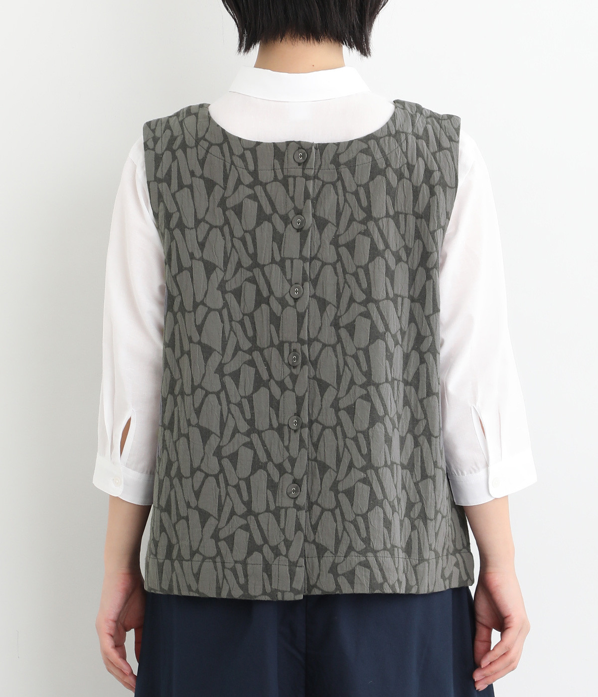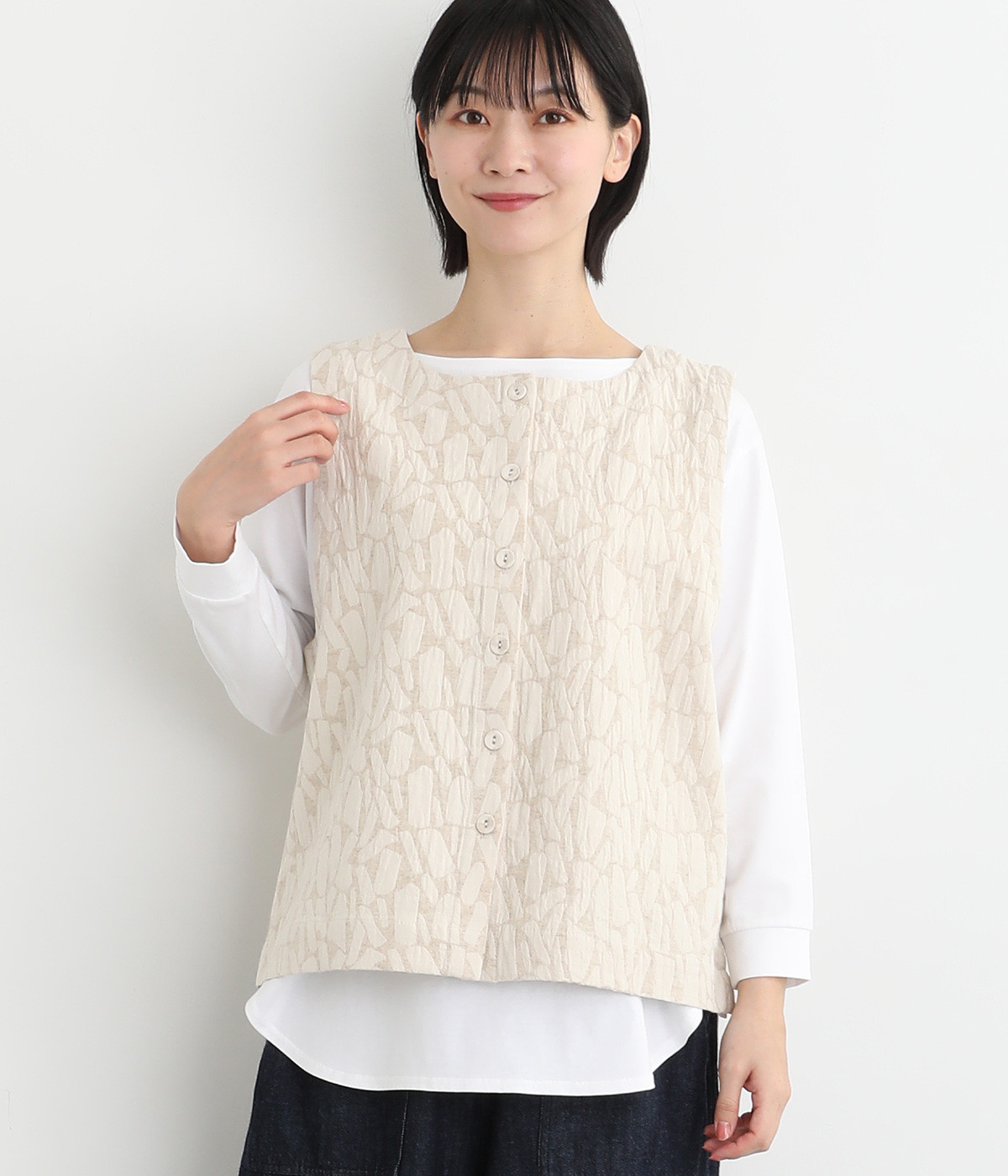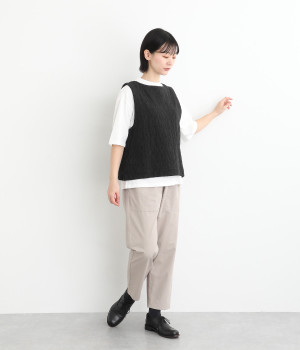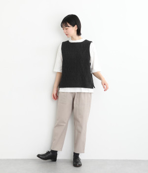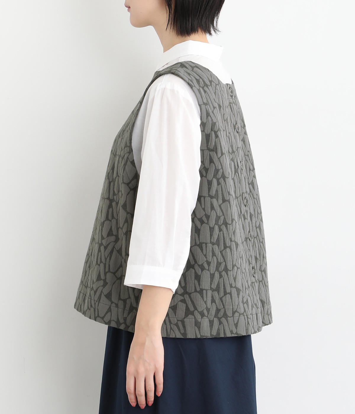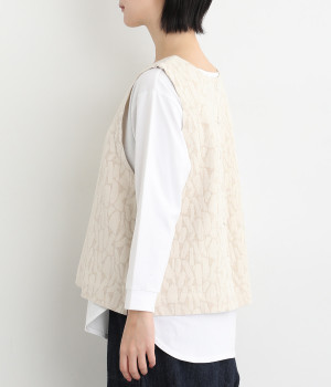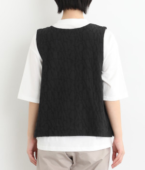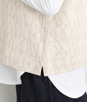 シンプルながらも装いに表情をつけるジャカードベスト。前後どちらを前にしても着られる2way仕様なので、ボタン側をあけて羽織りとしてスタイリングすることも可能です。インナーがもたつきにくい広めのアームホールもポイントです。