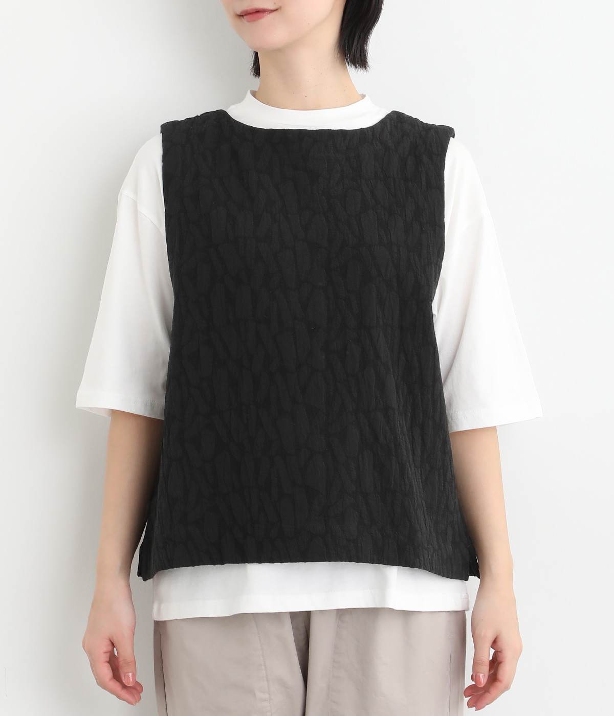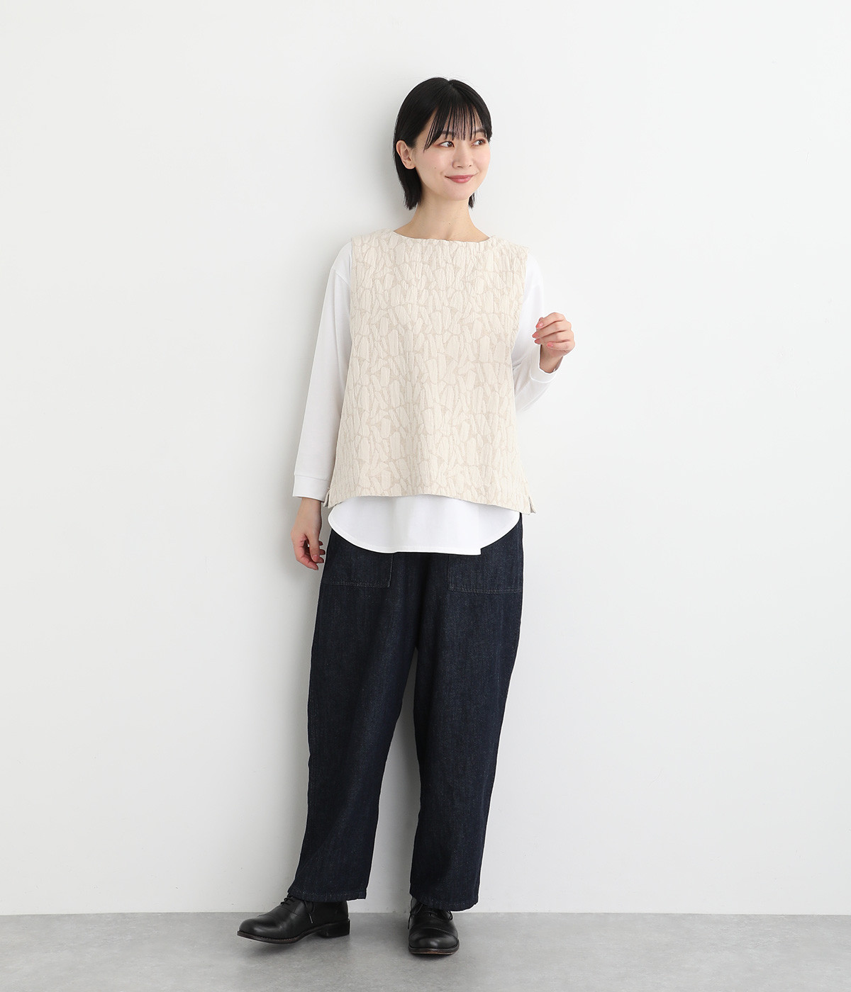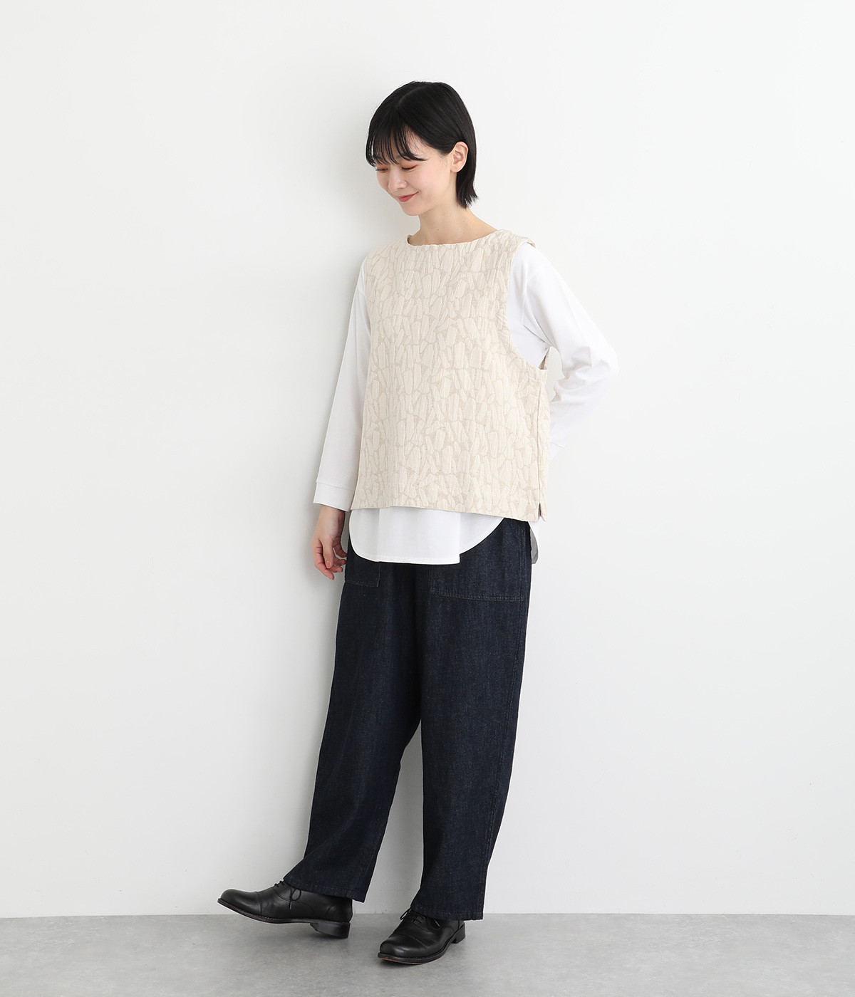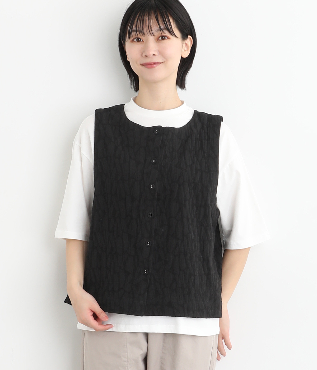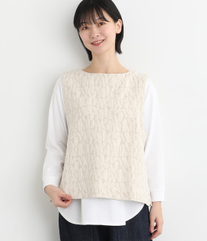 シンプルながらも装いに表情をつけるジャカードベスト。前後どちらを前にしても着られる2way仕様なので、ボタン側をあけて羽織りとしてスタイリングすることも可能です。インナーがもたつきにくい広めのアームホールもポイントです。
