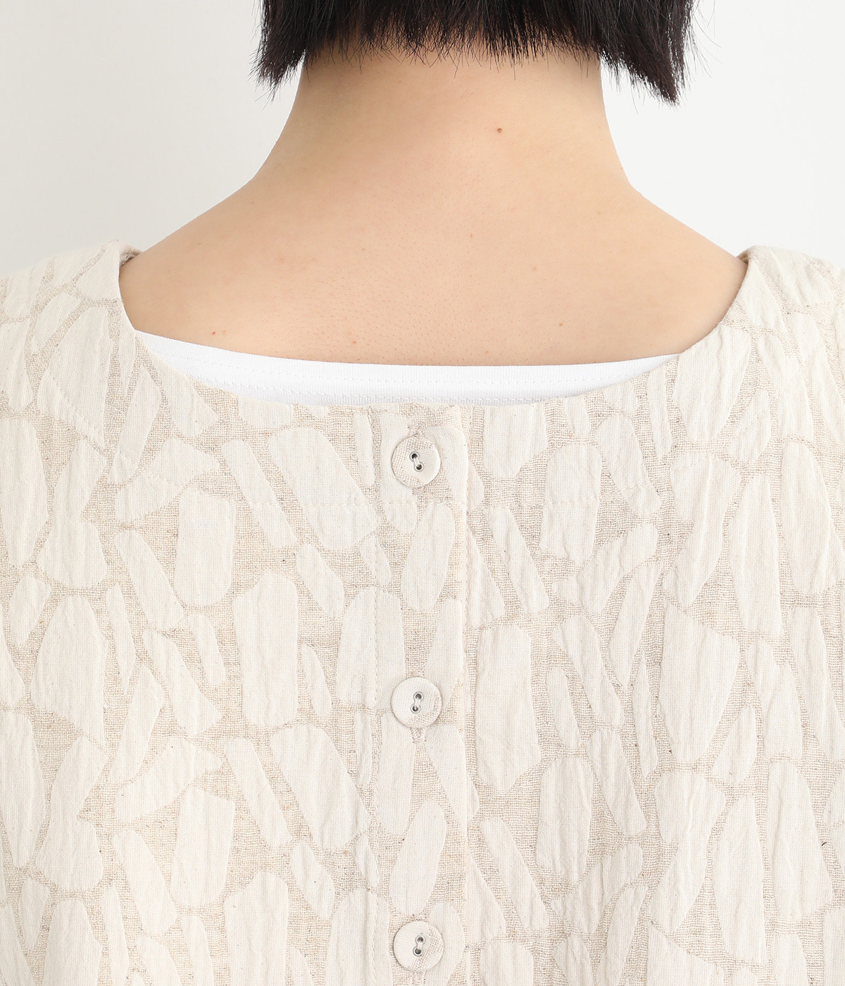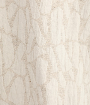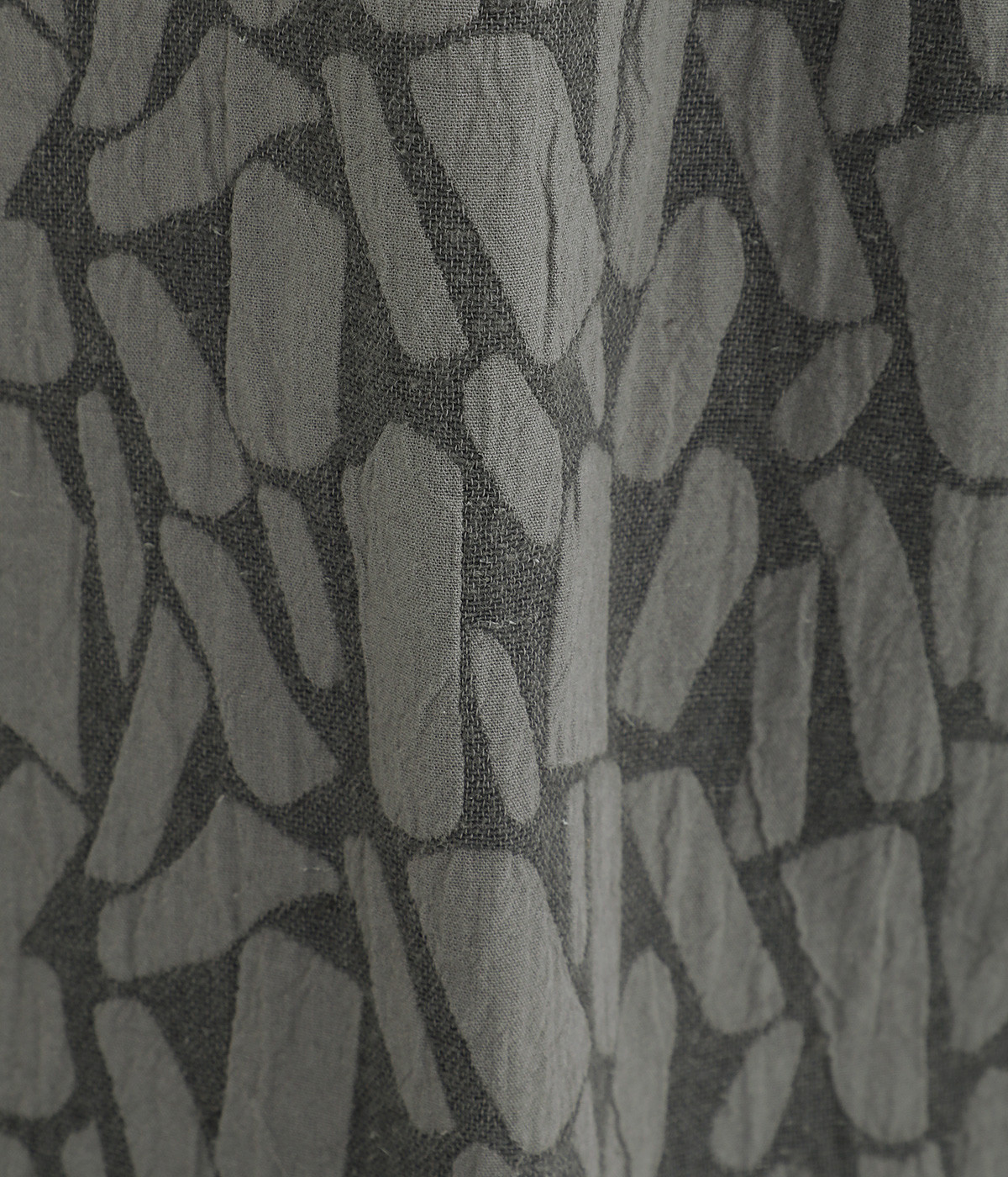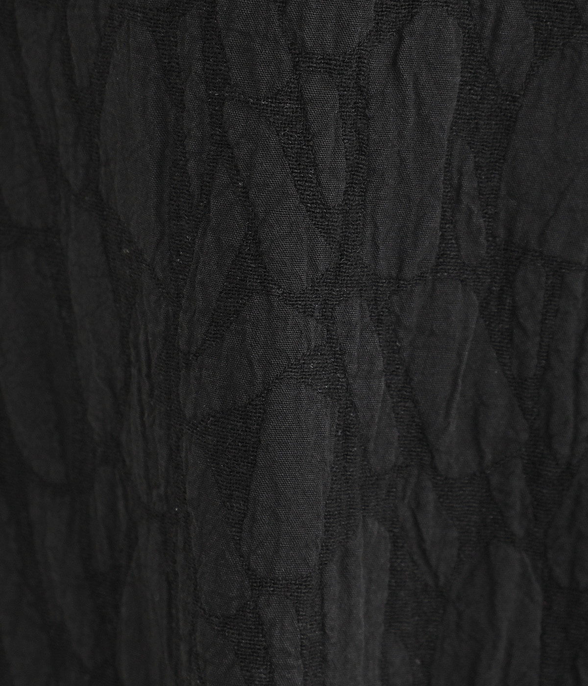 ハリ感のあるふっくらとした立体的なジャカード織りの総柄生地。コットンとリネン、レーヨンが使われており、さらりと軽いナチュラルな風合いに仕上がっています。