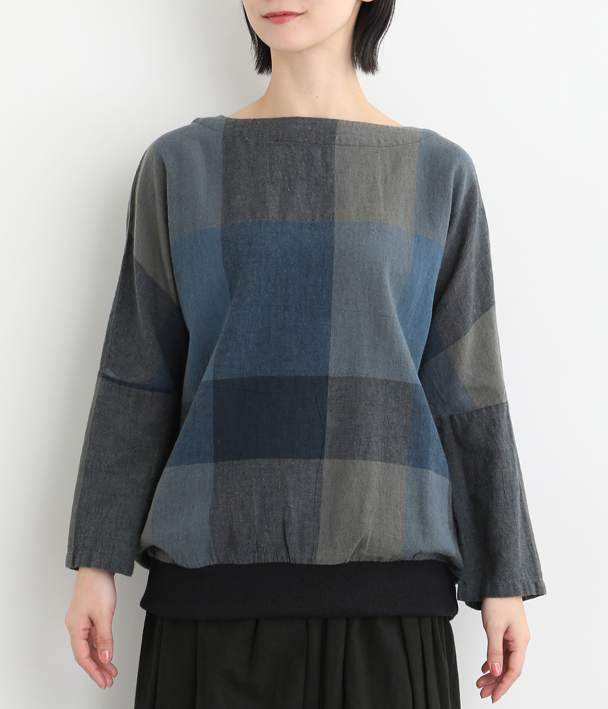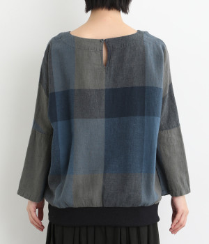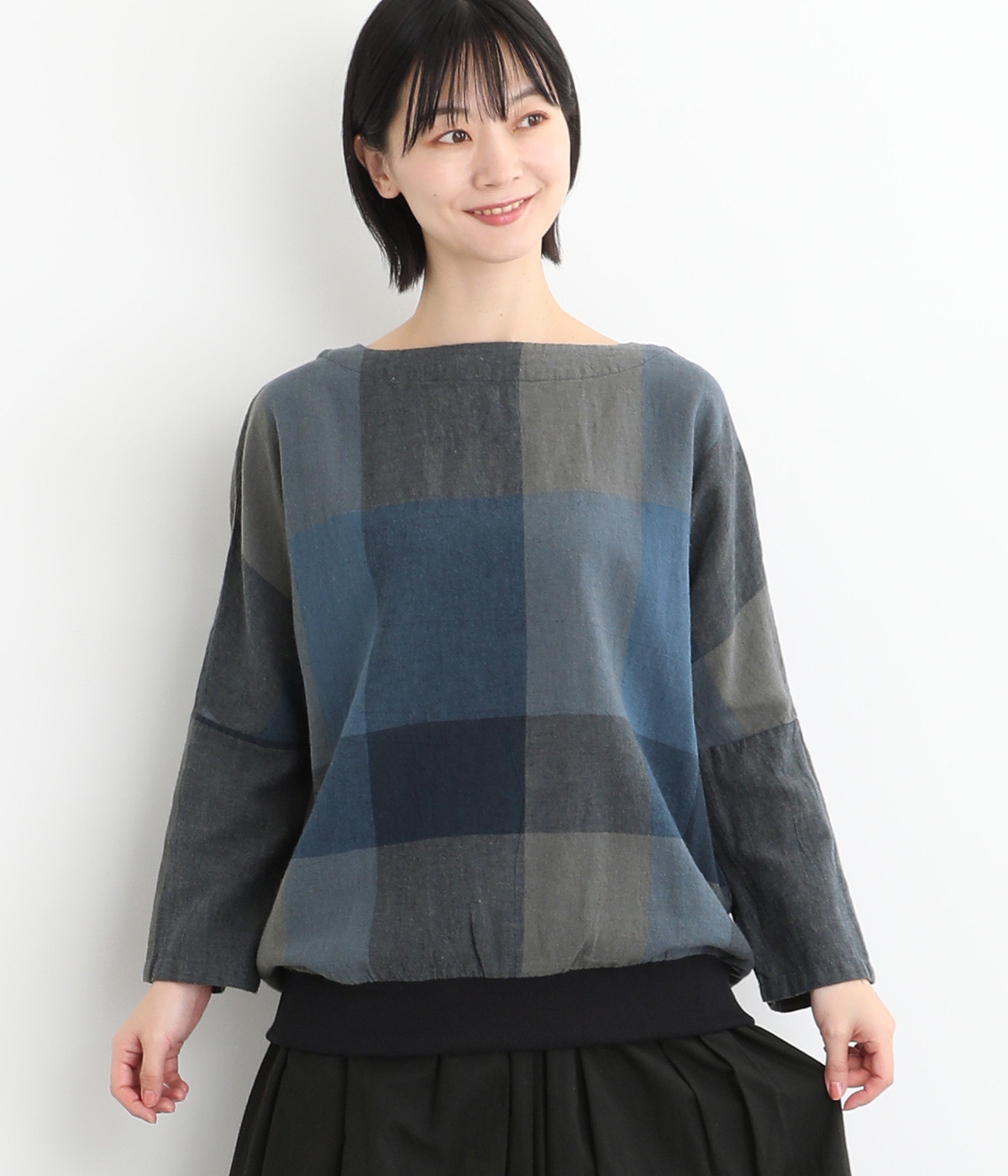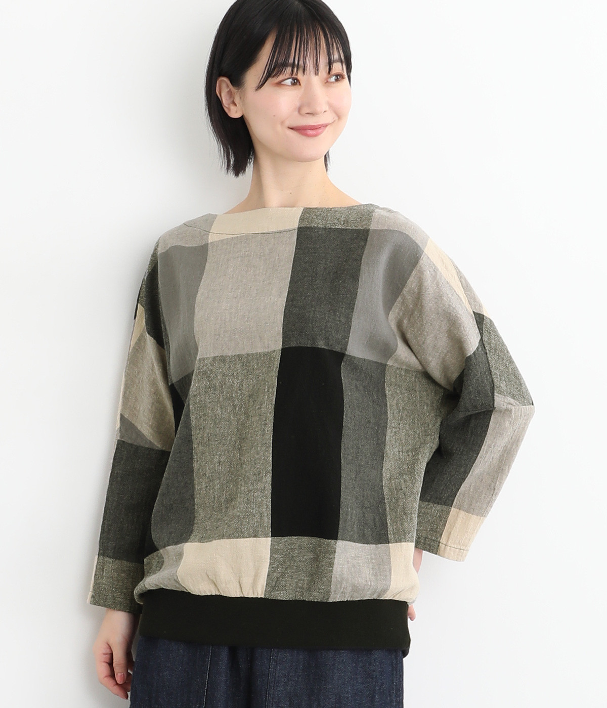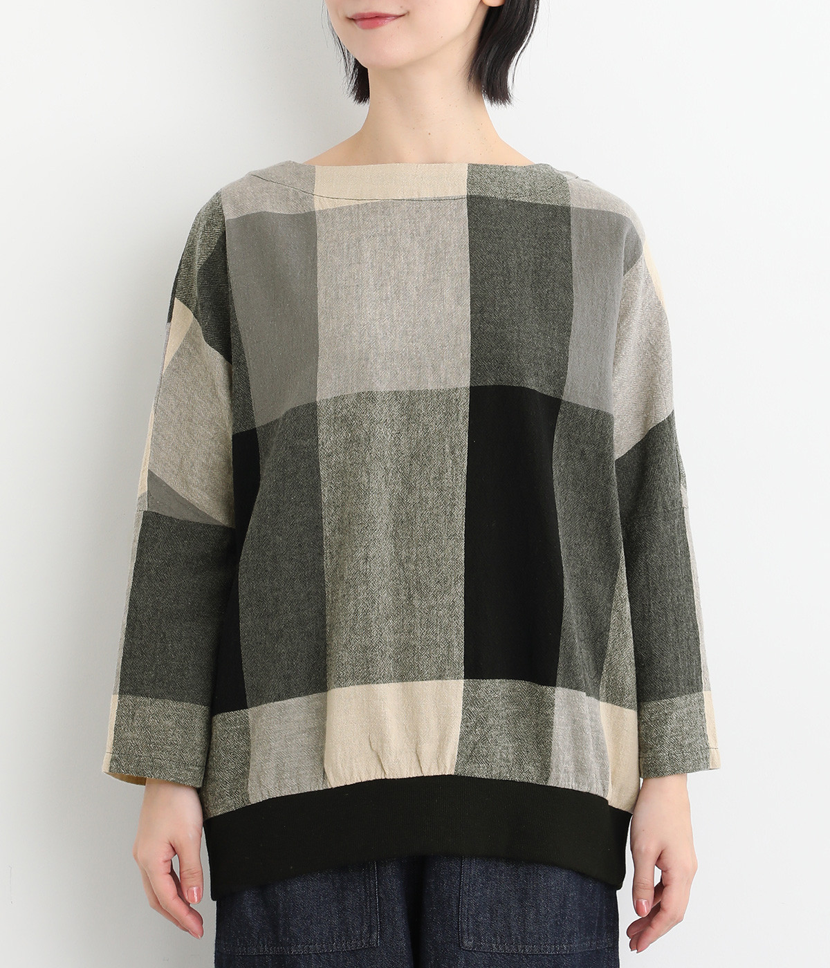 大胆なチェック柄をあしらった、コーディネートの主役を飾る一枚。ドルマン風のゆったりとしたシルエットで見た目も着心地もリラクシーなデザインです。裾がリブになっている分、軽くブラウジングしてこなれ感を出すのも◎。後ろネックはやや広めのティアドロップあきになっています。