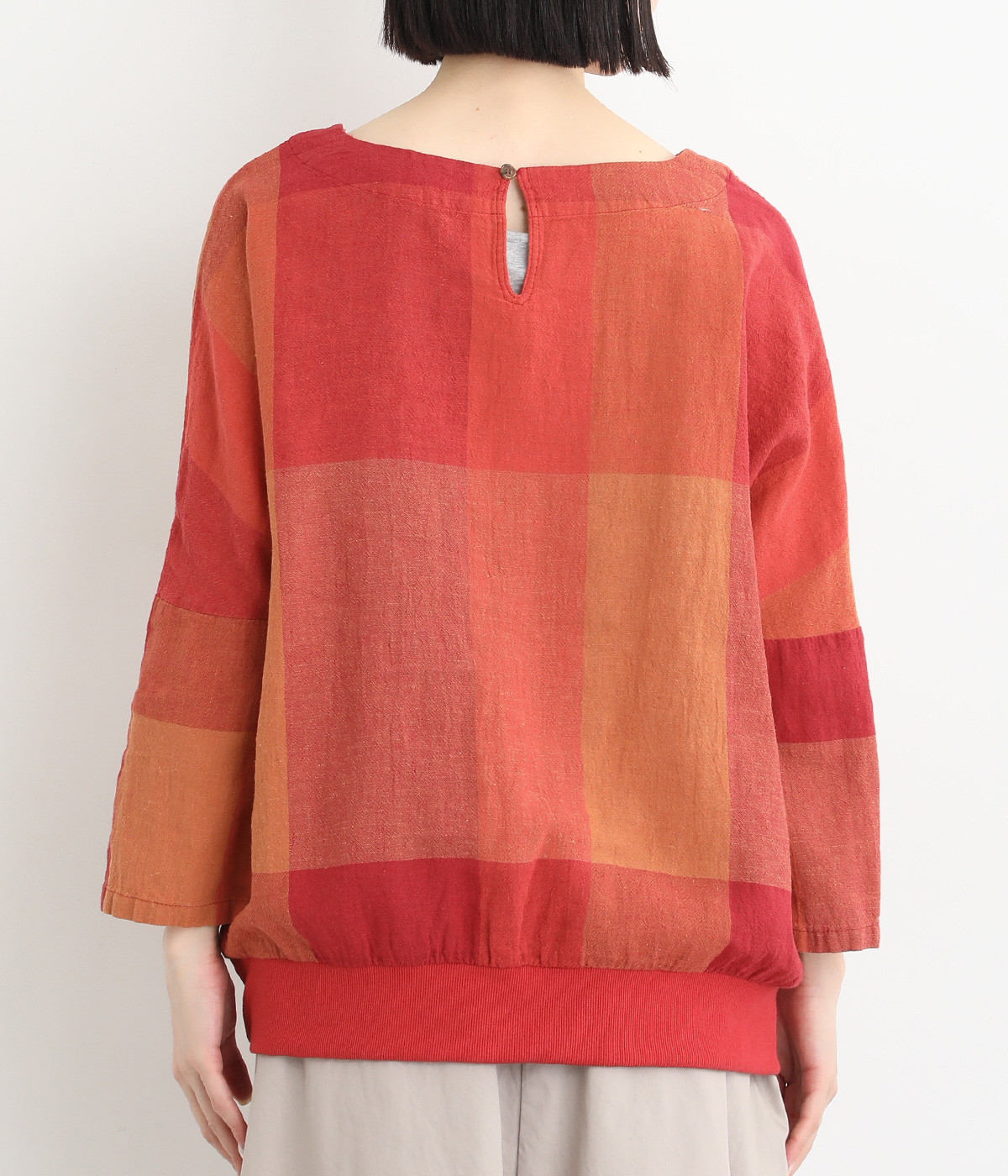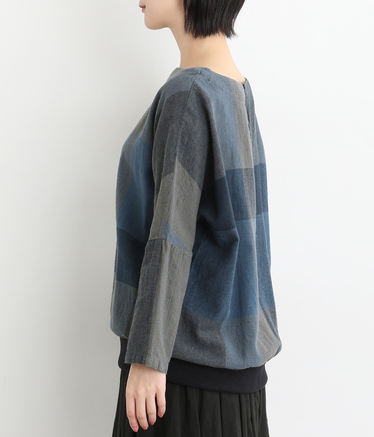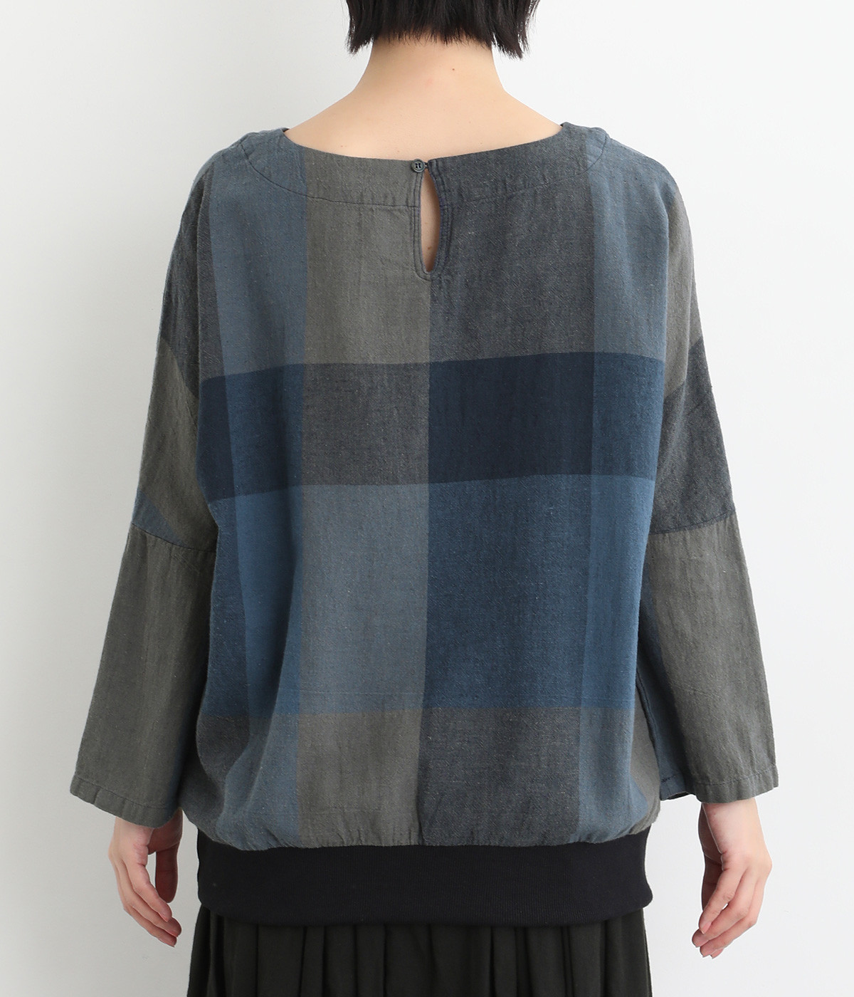 大胆なチェック柄をあしらった、コーディネートの主役を飾る一枚。ドルマン風のゆったりとしたシルエットで見た目も着心地もリラクシーなデザインです。裾がリブになっている分、軽くブラウジングしてこなれ感を出すのも◎。後ろネックはやや広めのティアドロップあきになっています。