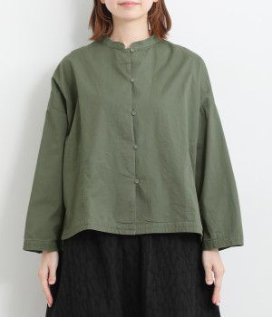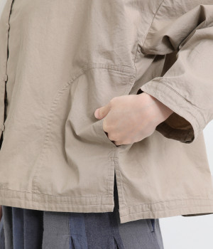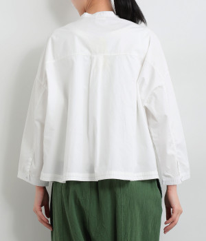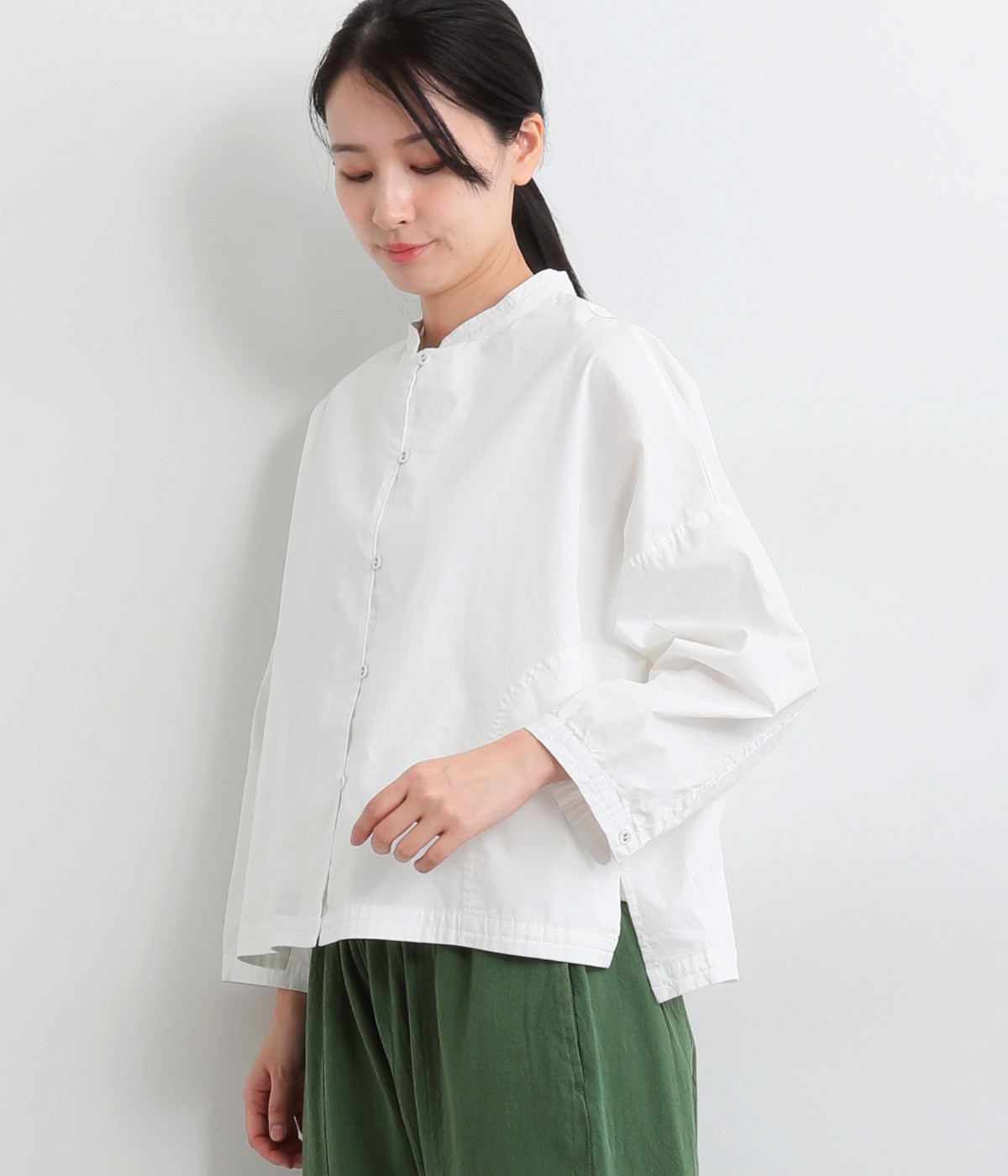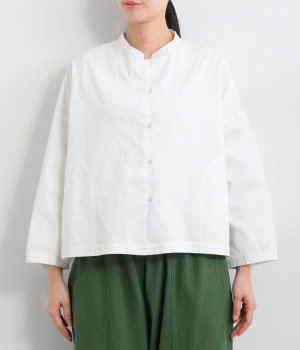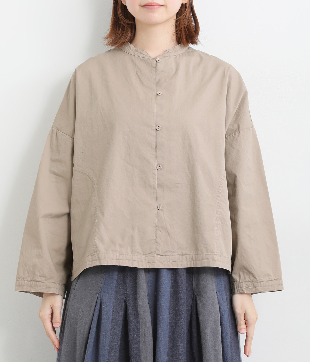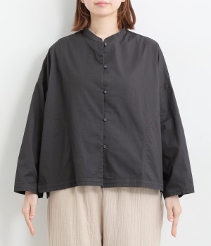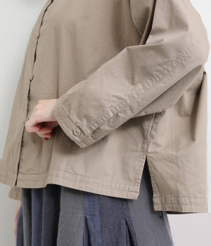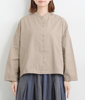 薄手ながらもハリのあるコットンハイカウント生地で仕立てたブラウスです。ふくらみのある質感で一枚着でもさまになります。肌離れも良くライトアウターとしての活躍にも期待できる一枚です。