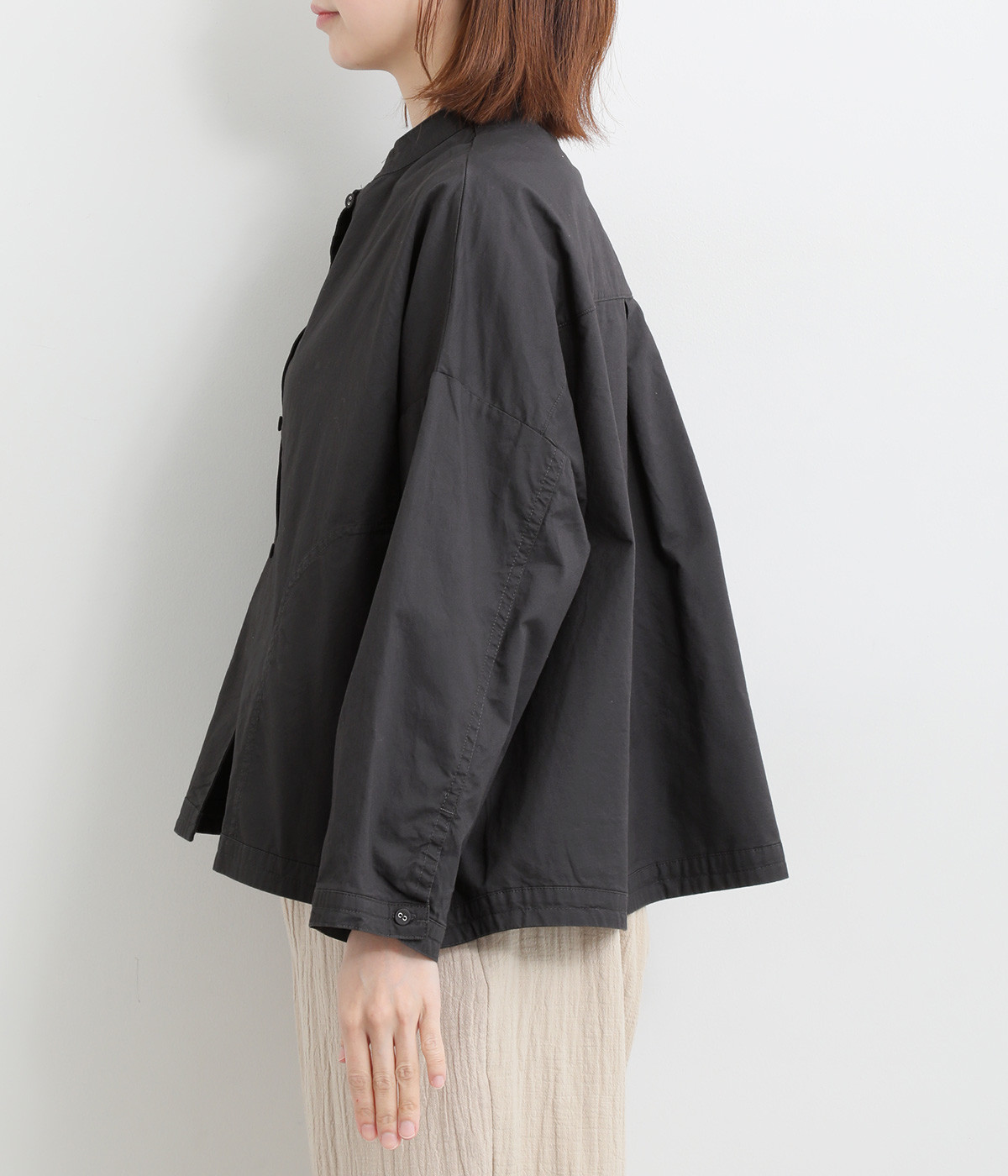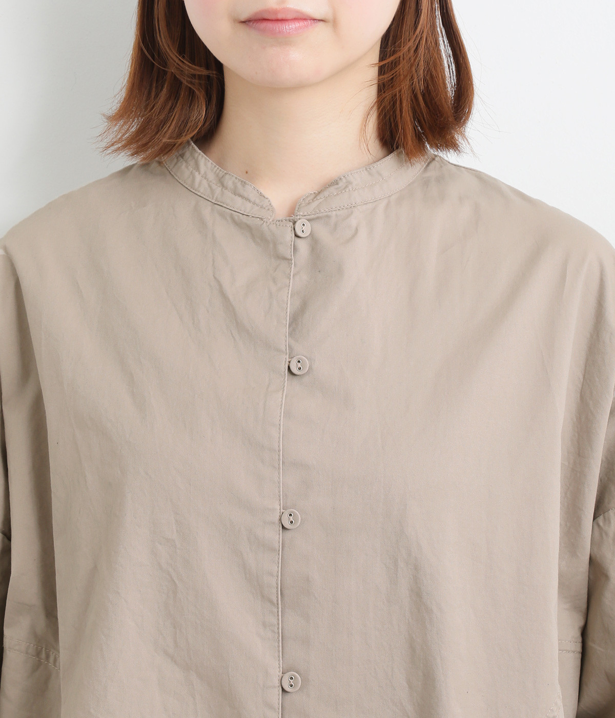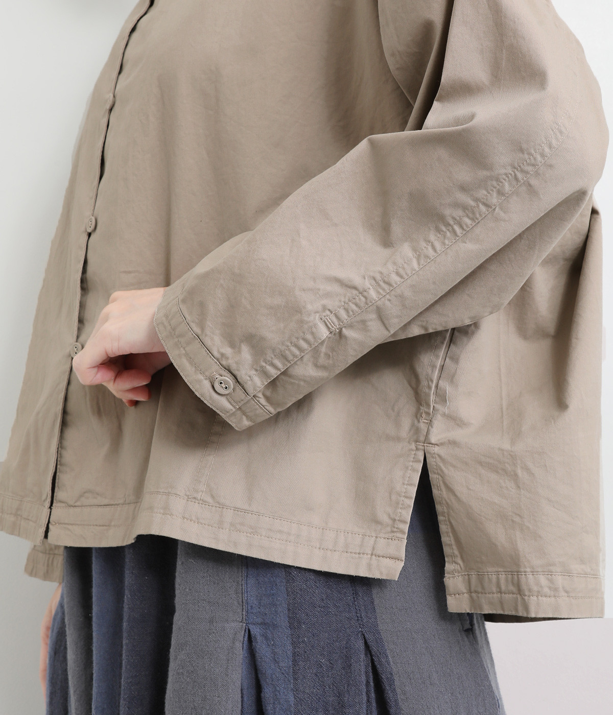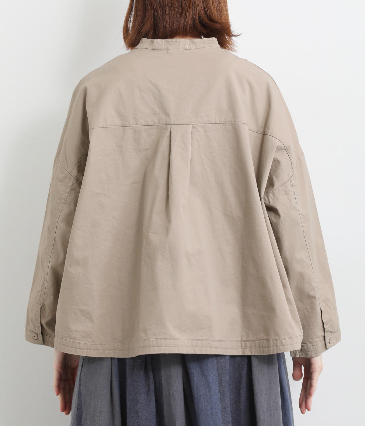 ゆとりのあるシンプルなボックスシルエットで、後ろはタックを入れてややフレアに仕上げています。バンドカラーで顔まわりはすっきりと品よく。首、袖、裾まわりのステッチがさり気ないアクセントに。