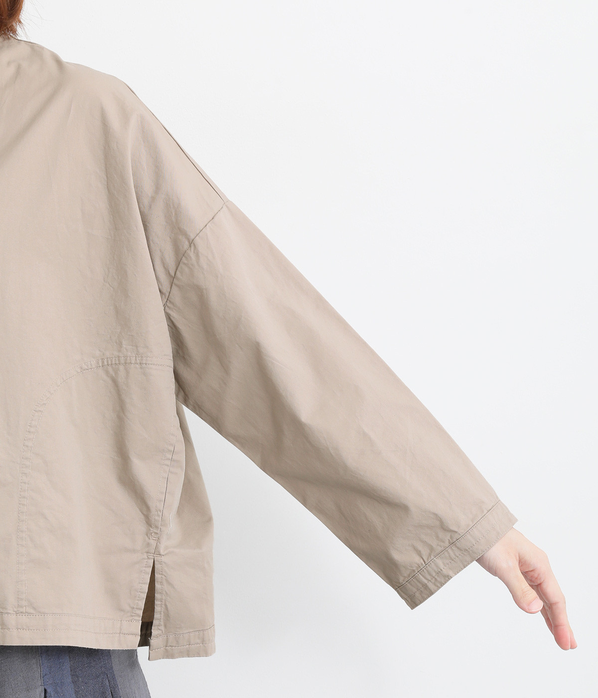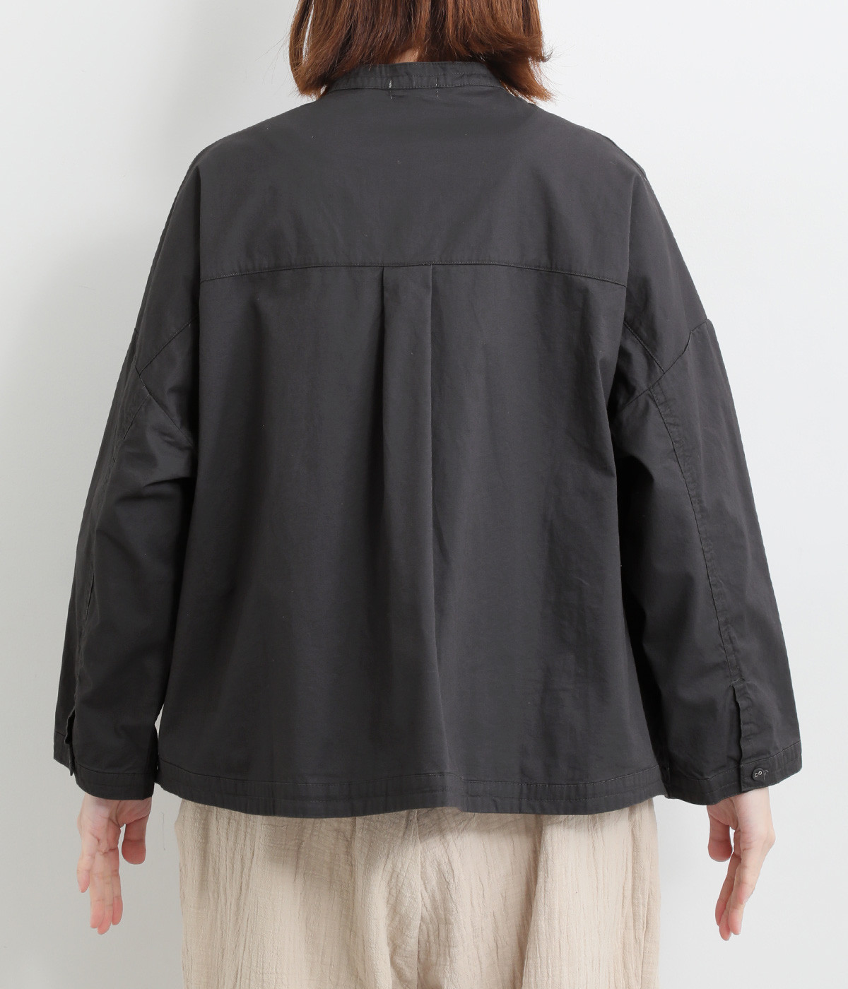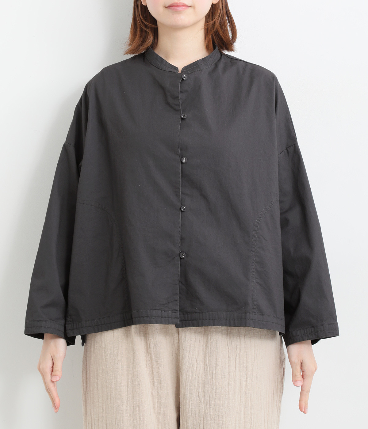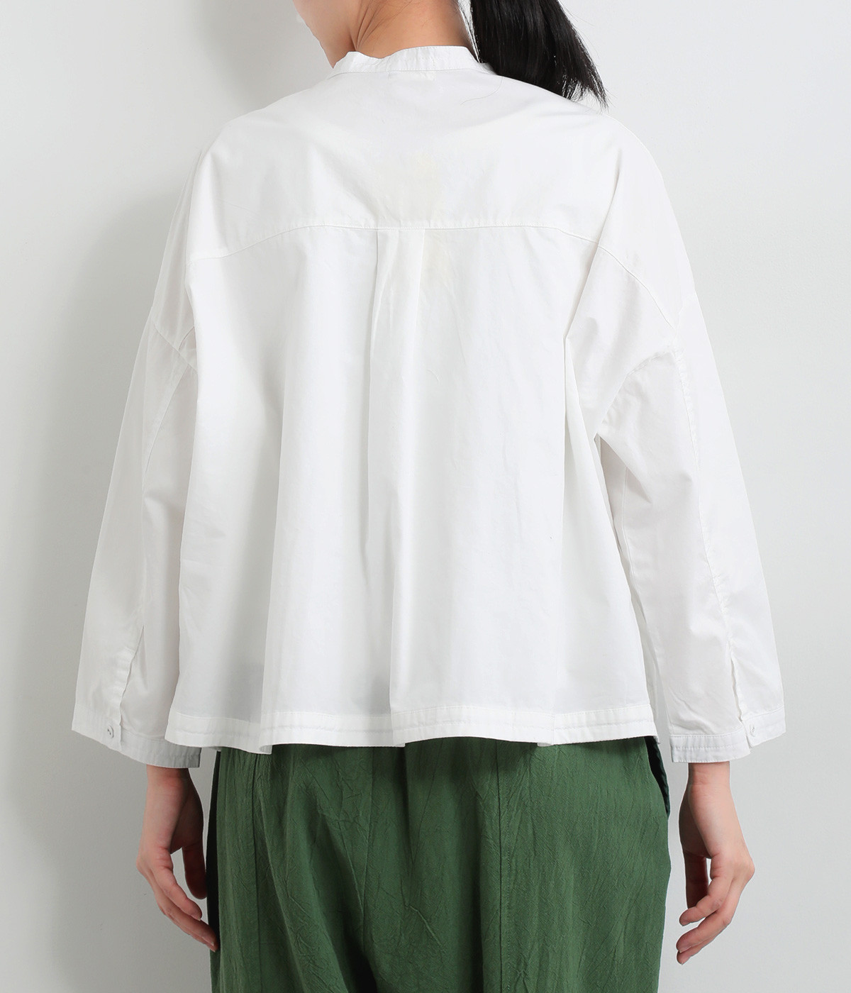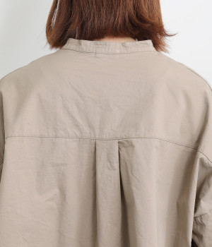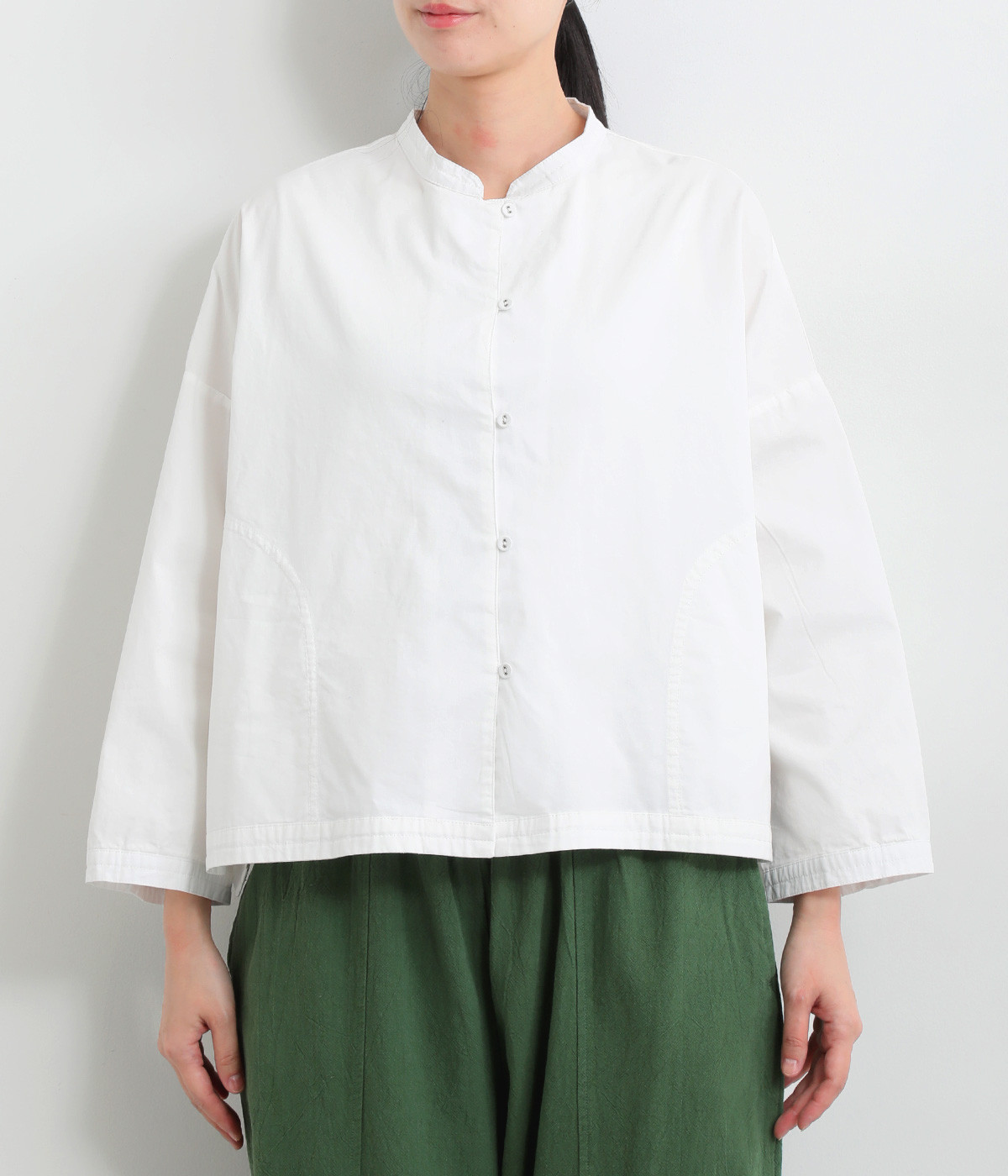 ゆとりのあるシンプルなボックスシルエットで、後ろはタックを入れてややフレアに仕上げています。バンドカラーで顔まわりはすっきりと品よく。首、袖、裾まわりのステッチがさり気ないアクセントに。