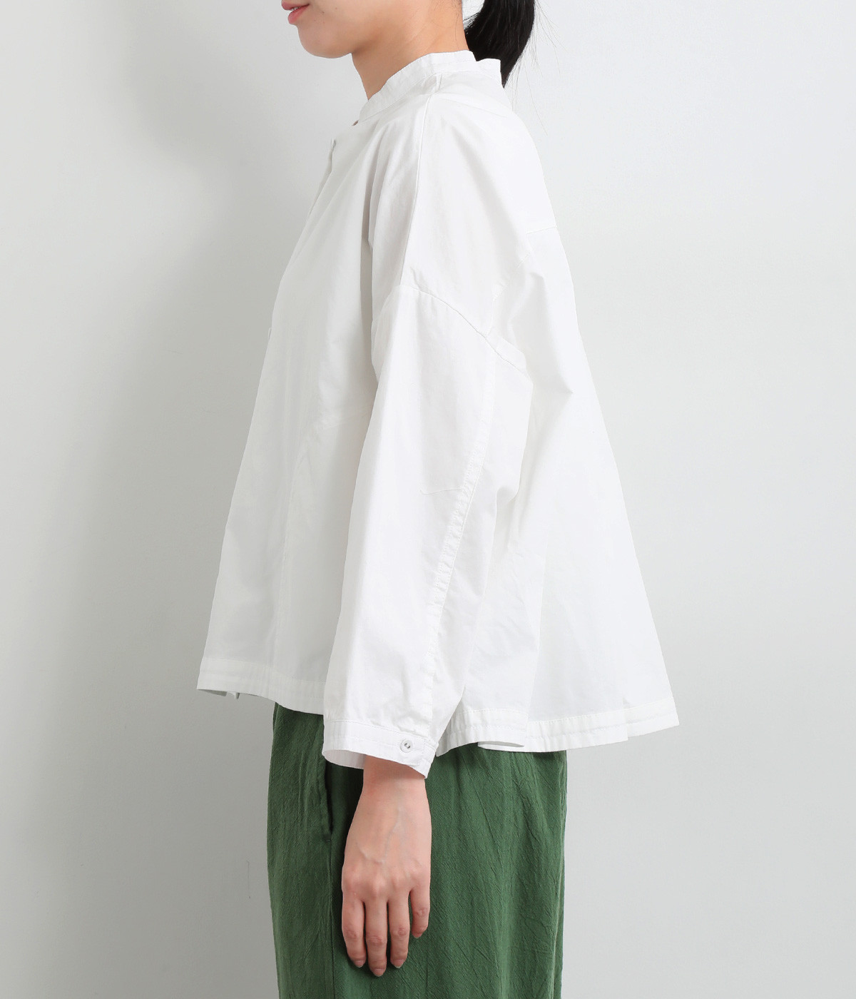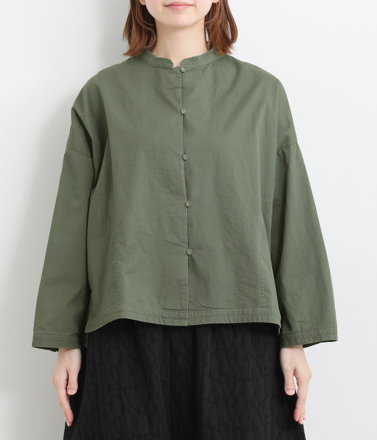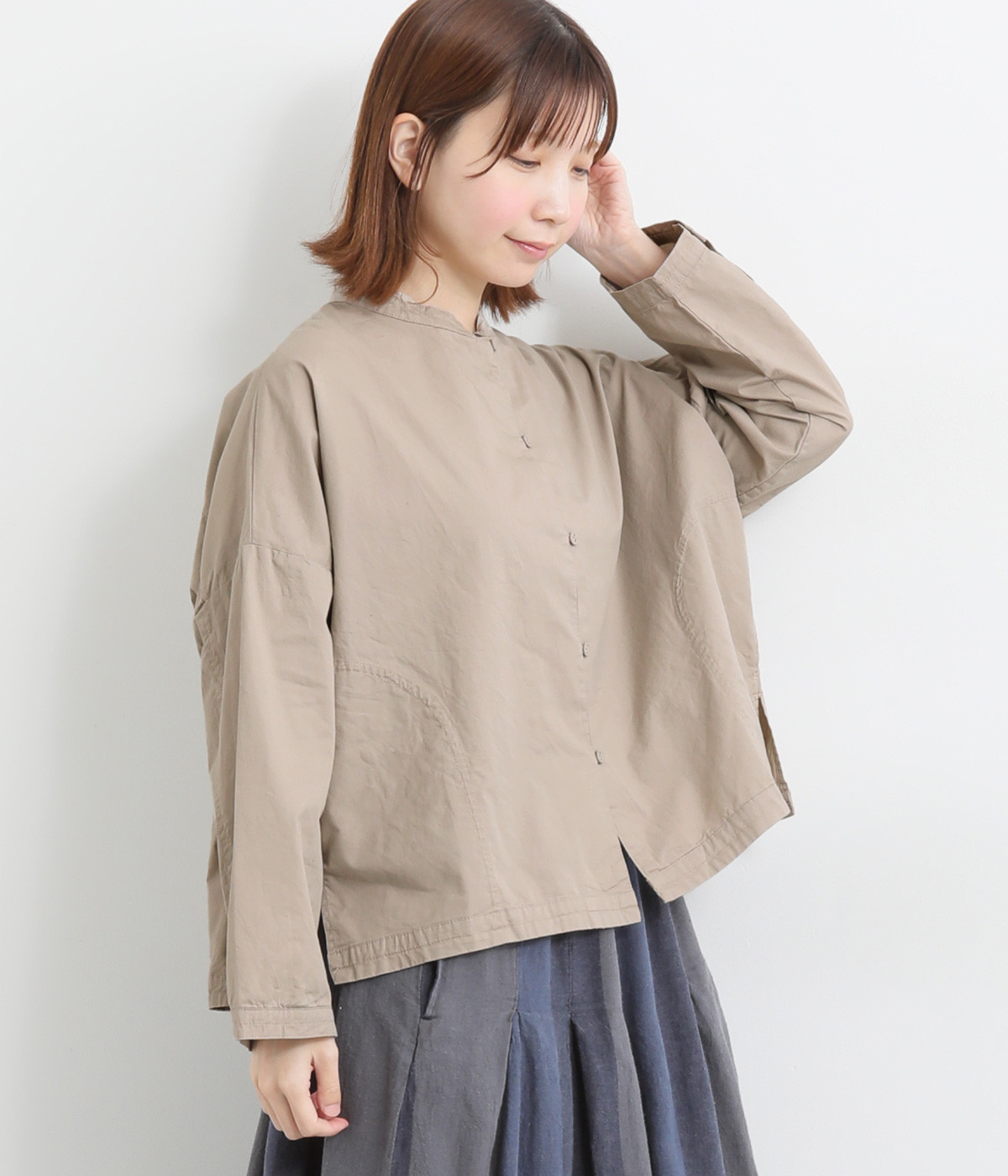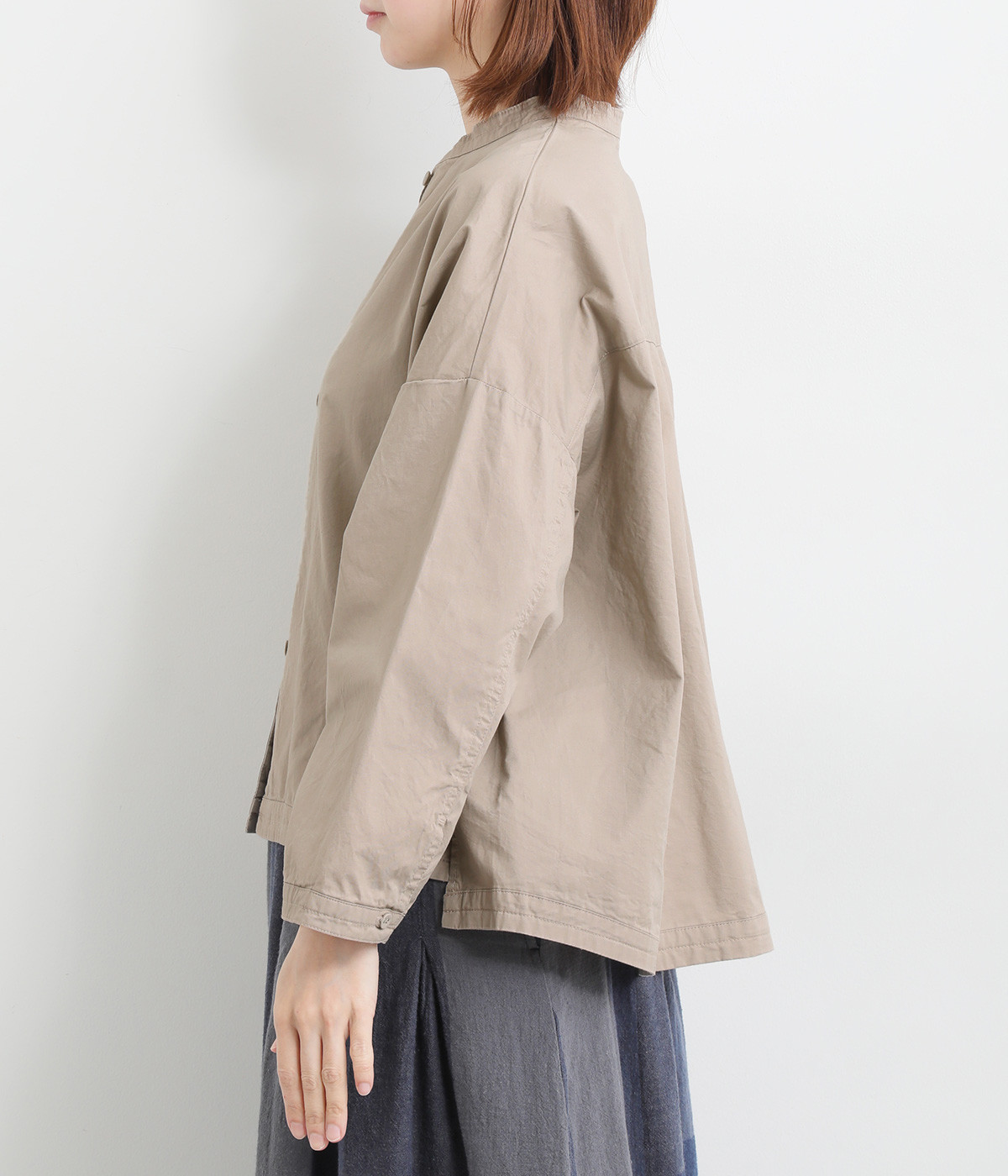 ゆとりのあるシンプルなボックスシルエットで、後ろはタックを入れてややフレアに仕上げています。バンドカラーで顔まわりはすっきりと品よく。首、袖、裾まわりのステッチがさり気ないアクセントに。