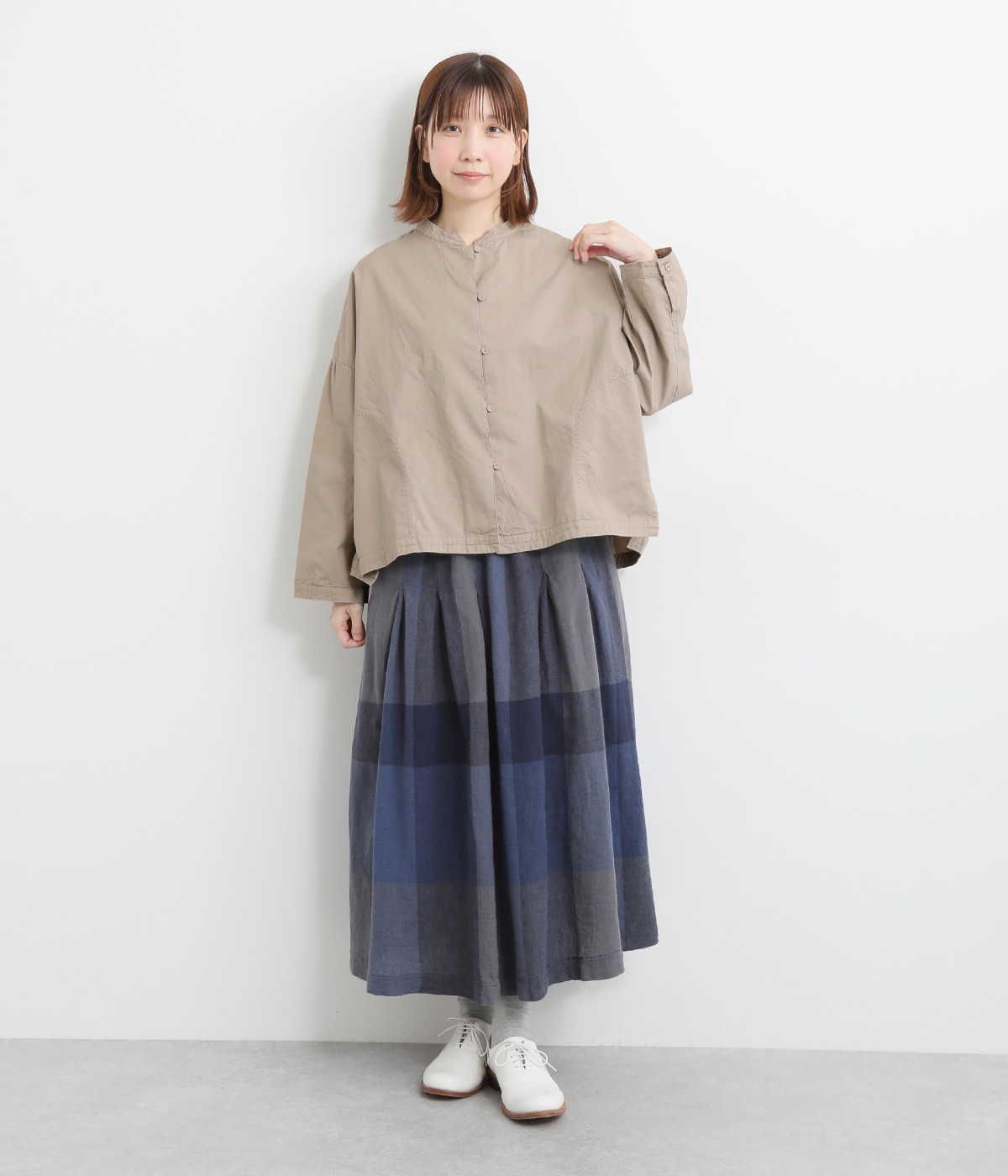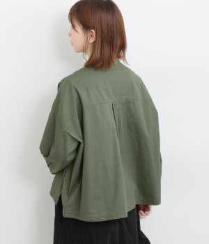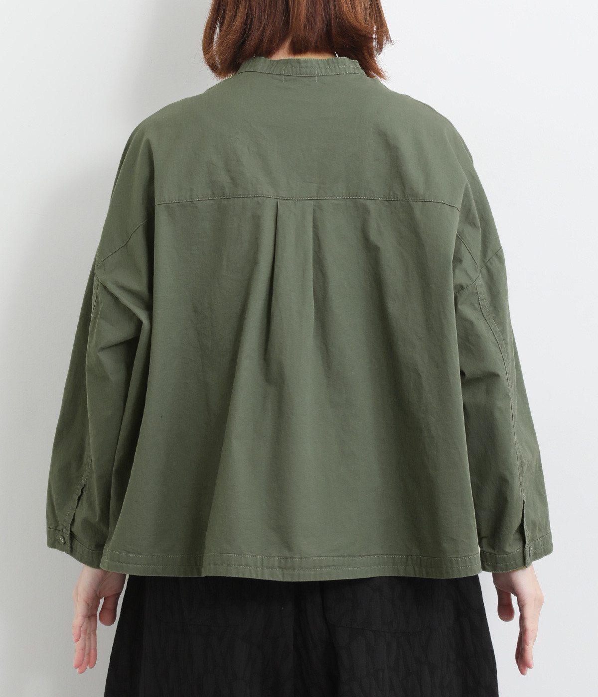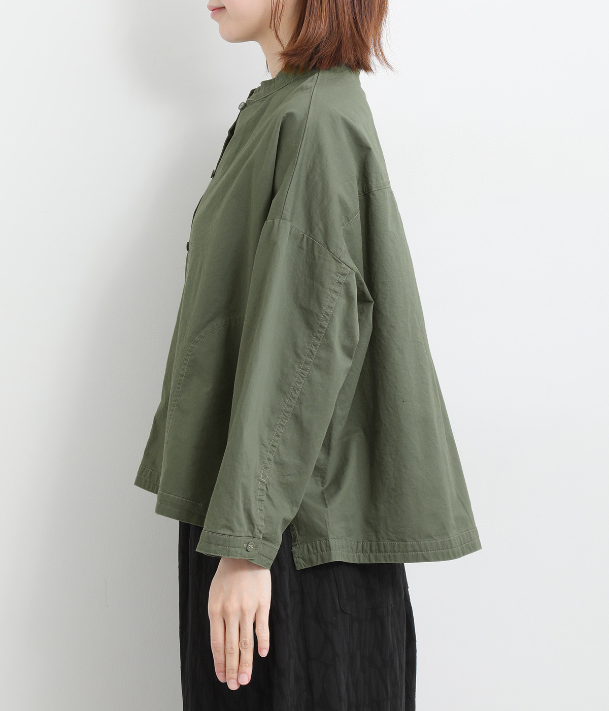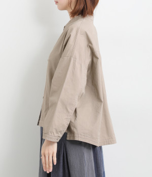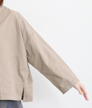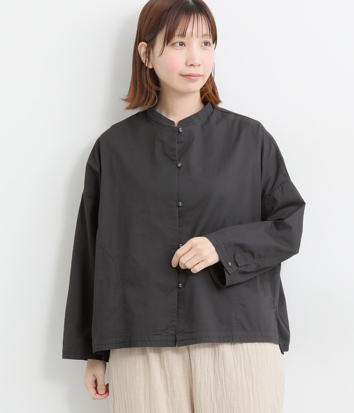 ゆとりのあるシンプルなボックスシルエットで、後ろはタックを入れてややフレアに仕上げています。バンドカラーで顔まわりはすっきりと品よく。首、袖、裾まわりのステッチがさり気ないアクセントに。