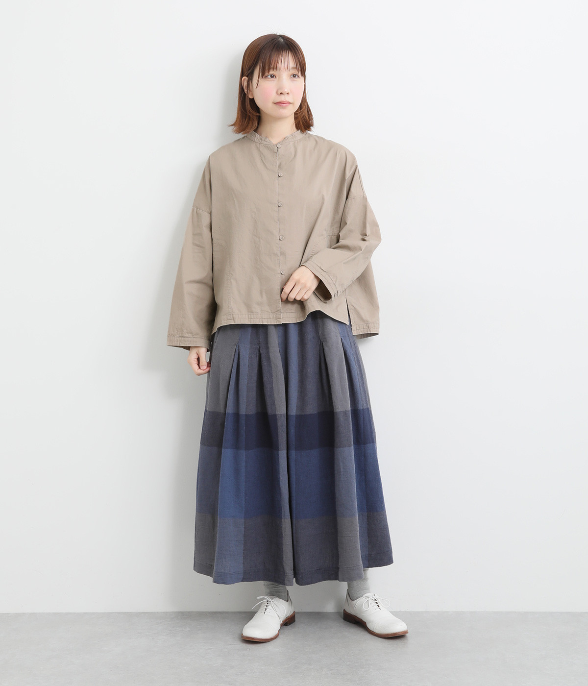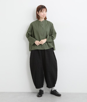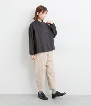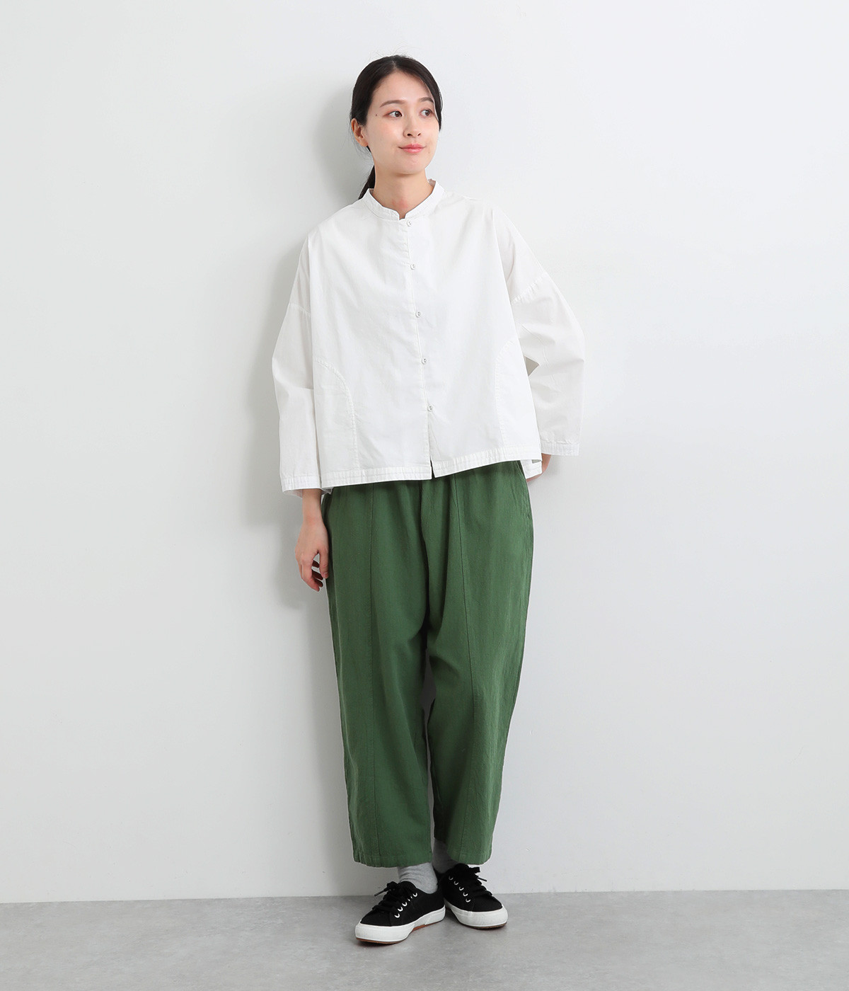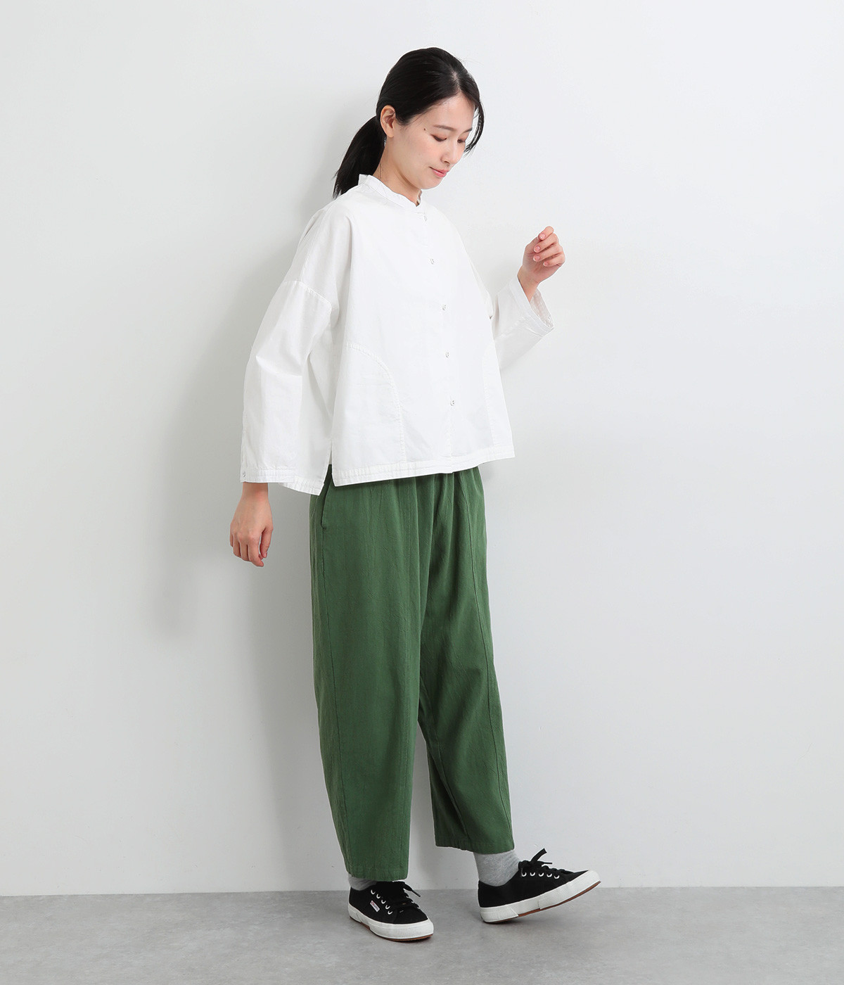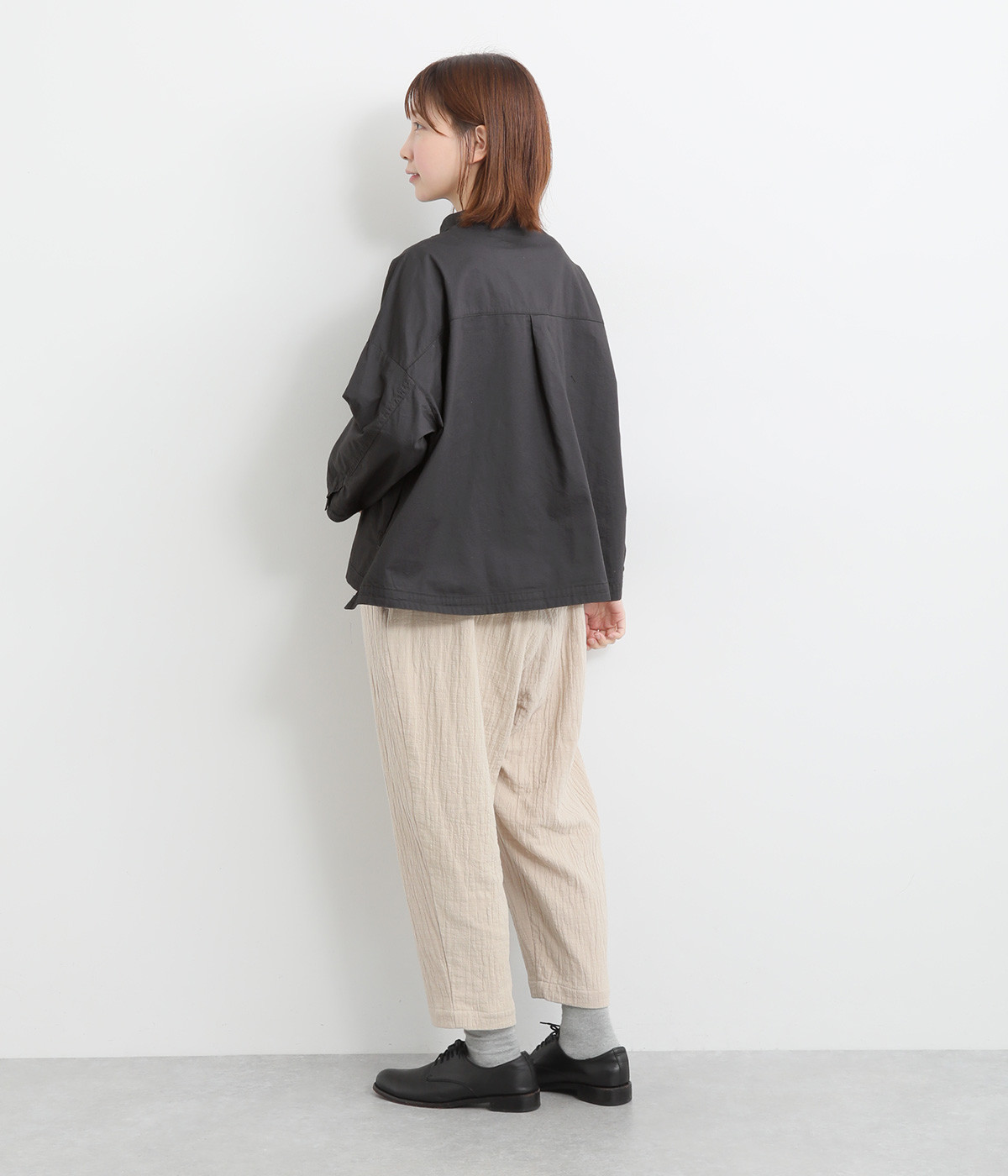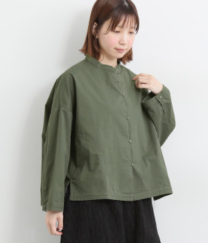 ゆとりのあるシンプルなボックスシルエットで、後ろはタックを入れてややフレアに仕上げています。バンドカラーで顔まわりはすっきりと品よく。首、袖、裾まわりのステッチがさり気ないアクセントに。